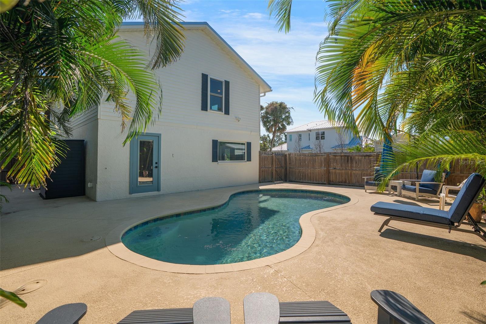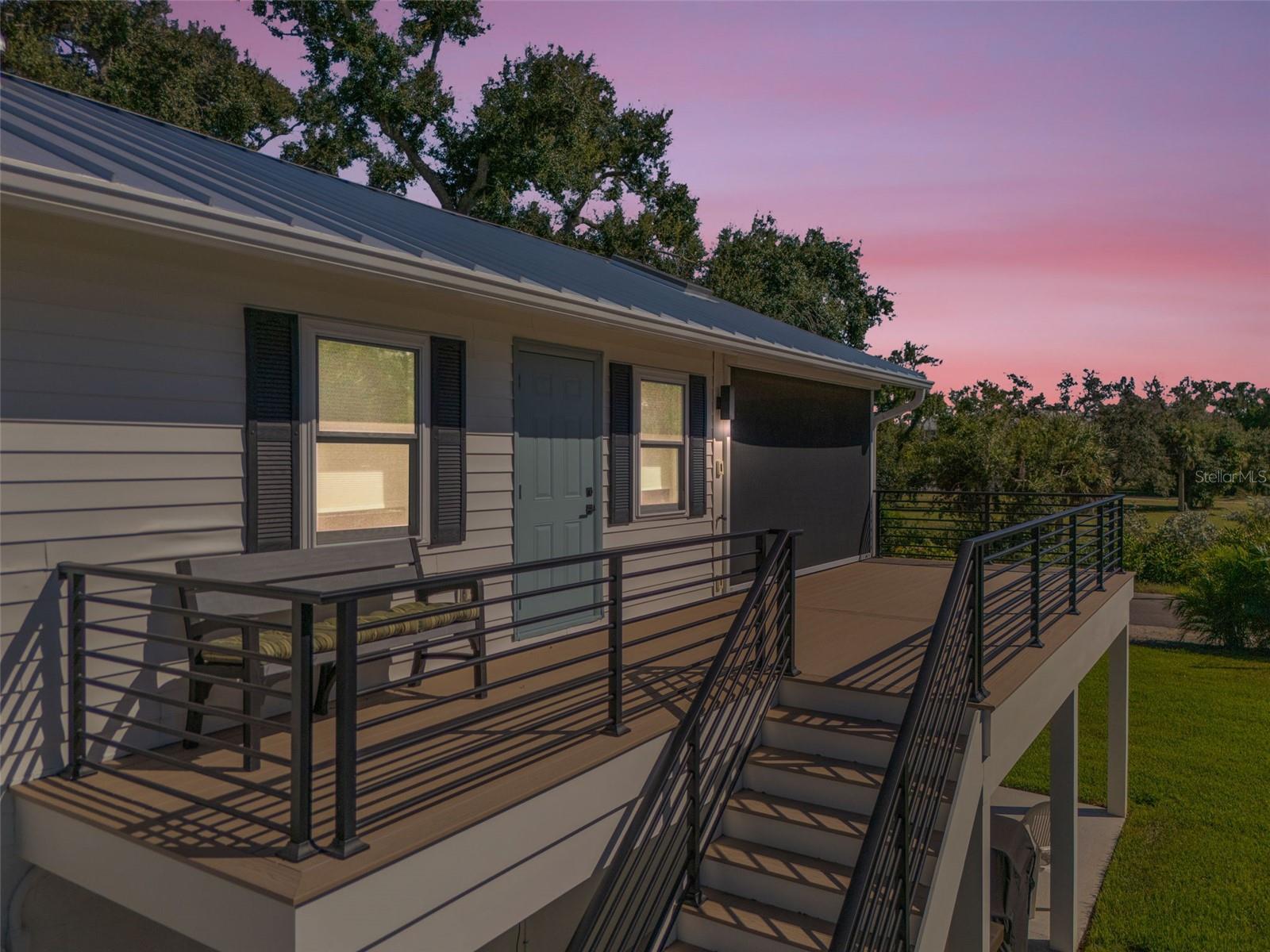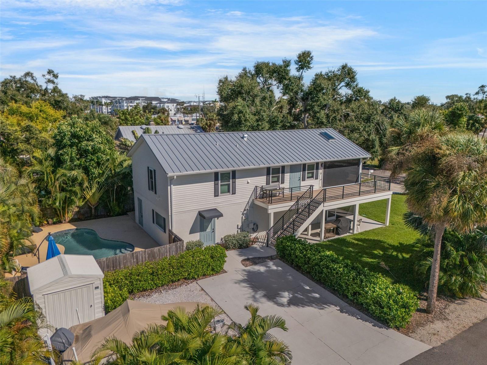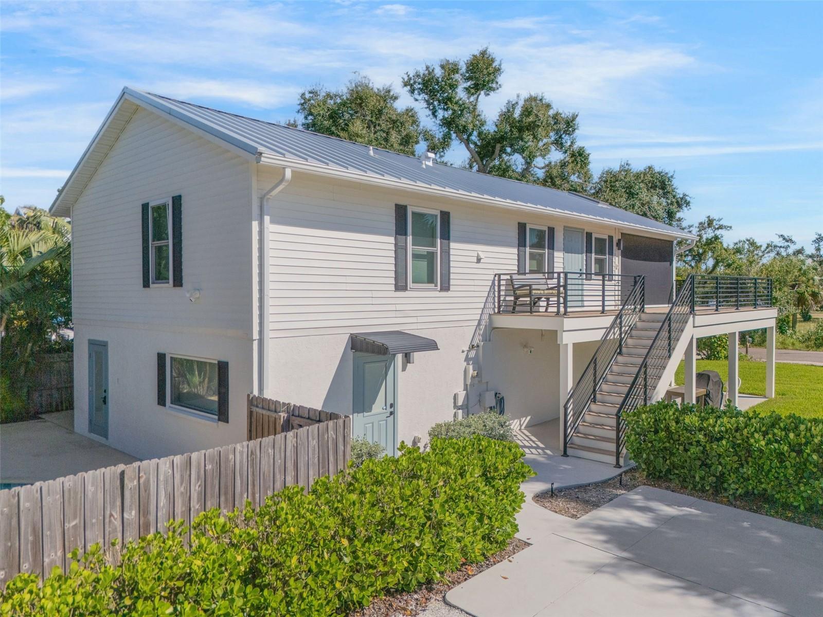 Under contract-accepting backup offers. Live like you’re on vacation in this updated Key West–style home West of the Trail. Upgrades include a new standing seam metal roof, hurricane impact windows, electric tankless water heater, wraparound "Lifeproof" composite decking, and a custom heated pool. Interior features vaulted ceilings with a mix of travertine, LVP, and tile flooring, plus a kitchen with solid wood cabinets, stainless steel appliances, beadboard ceiling, and custom backsplash. The screened second-story porch has an electronic roll-up system for open-air or enclosed comfort. A unique “hidden” door design allows the home to function as one residence or two separate units, with the lower level offering its own entrance, bedroom, bath, family room, and laundry—perfect for in-laws, guests, or rental income. Outdoors, enjoy lush landscaping, a tropical pool setting, and unbeatable location just a block from the public dock and kayak launch. Minutes to Sarasota, Venice Island, beaches, Legacy Trail, and Spanish Pointe.