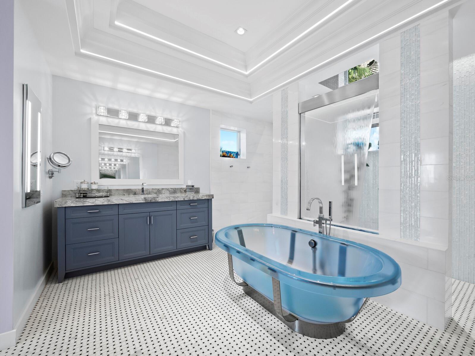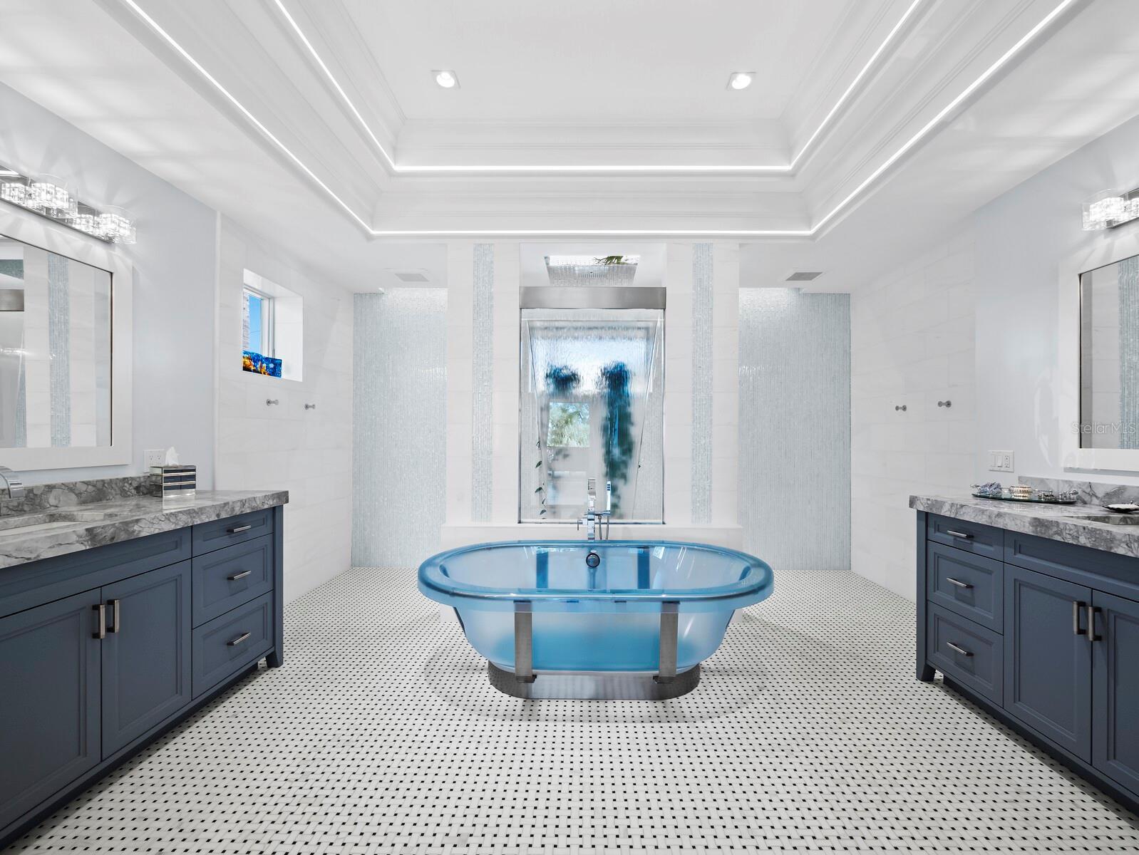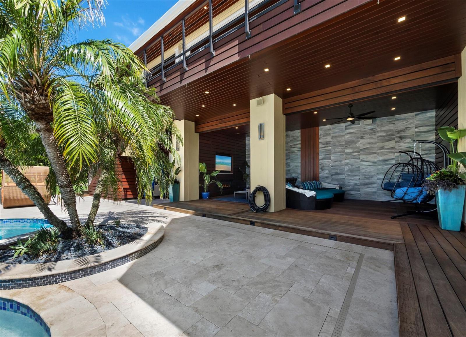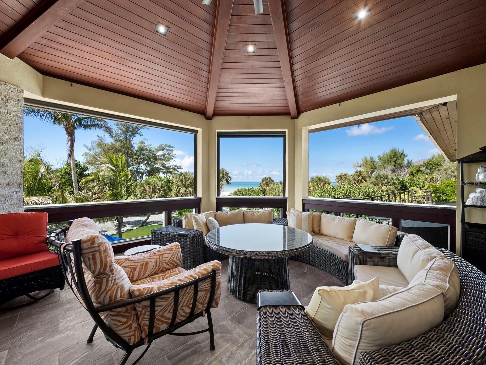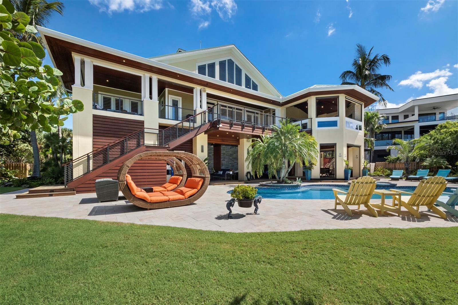 Welcome to this extraordinary Gulf-front estate located in one of Siesta Key’s most exclusive enclaves. Situated on a full acre in the private Sandy Hook community, this fully renovated, turnkey residence offers over 5,000 square feet of refined living space and more than 3,000 square feet of covered outdoor areas, all just a short stroll from Siesta Key Village and with direct access to a private community beach. Inside, the layout features five en-suite bedrooms, two powder baths, a dedicated office, and a three-car garage with beach cruisers and kayaks included. Floor-to-ceiling Andersen impact windows frame panoramic Gulf views, while rich finishes like Sapele mahogany siding, IPE hardwood decking, and a custom Pecky Cypress entertainment system reflect the home’s elevated craftsmanship. The chef’s kitchen is a showpiece, centered around a Labradorite Lumarian Blue granite island imported from Brazil, with Wolf, Miele, and Sub-Zero appliances throughout. The spa-inspired primary suite includes a waterfall feature wall, dual curbless shower, lighted soaking tub, and Toto smart toilets. A private elevator and full smart-home system ensure ease and efficiency. Outdoor living is exceptional, with a heated saltwater pool and Jacuzzi, a fully equipped summer kitchen, a covered outdoor living room with fireplace and TV, a poolside theater with dual fireplaces and TVs, and a sunset-facing gas fire pit. The professionally designed $1M+ tropical landscape includes advanced mosquito-misting and irrigation systems for effortless maintenance. With direct access to a private, resident-only beach and an ideal location just minutes from restaurants, shopping, and entertainment, this one-of-a-kind estate offers a rare opportunity to experience the best of coastal living on Siesta Key. Designed for elevated living and effortless enjoyment, 26 Sandy Hook Road S is more than a home—it is a fully realized Gulf-front sanctuary.