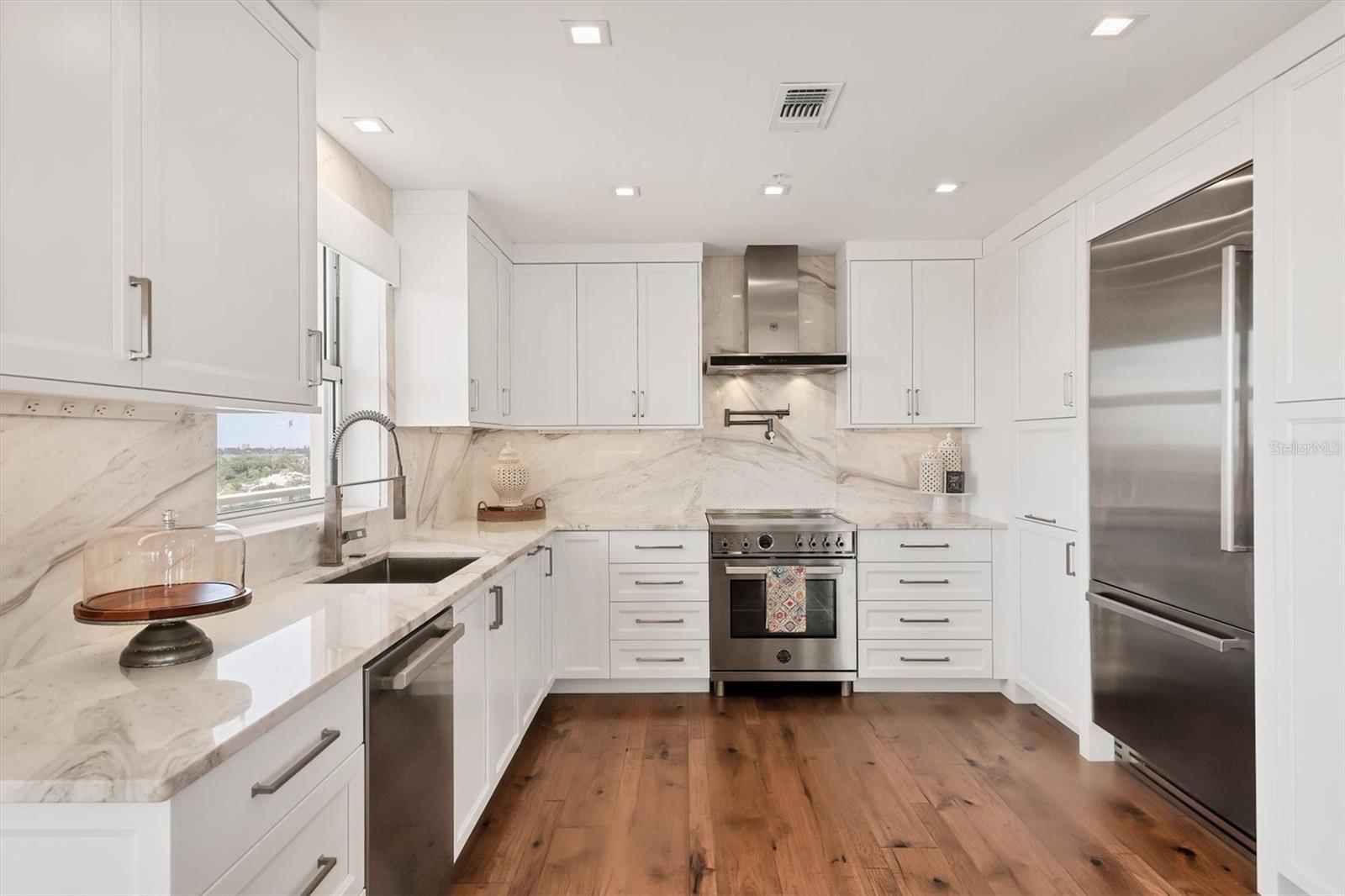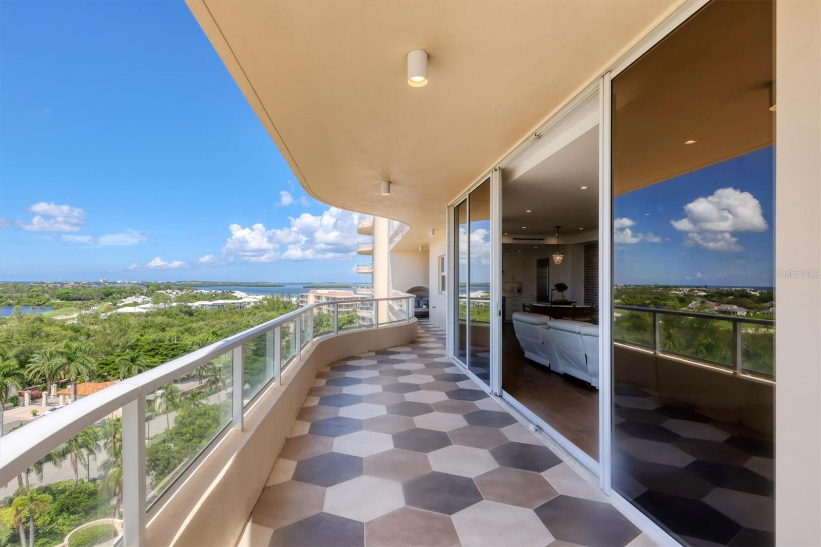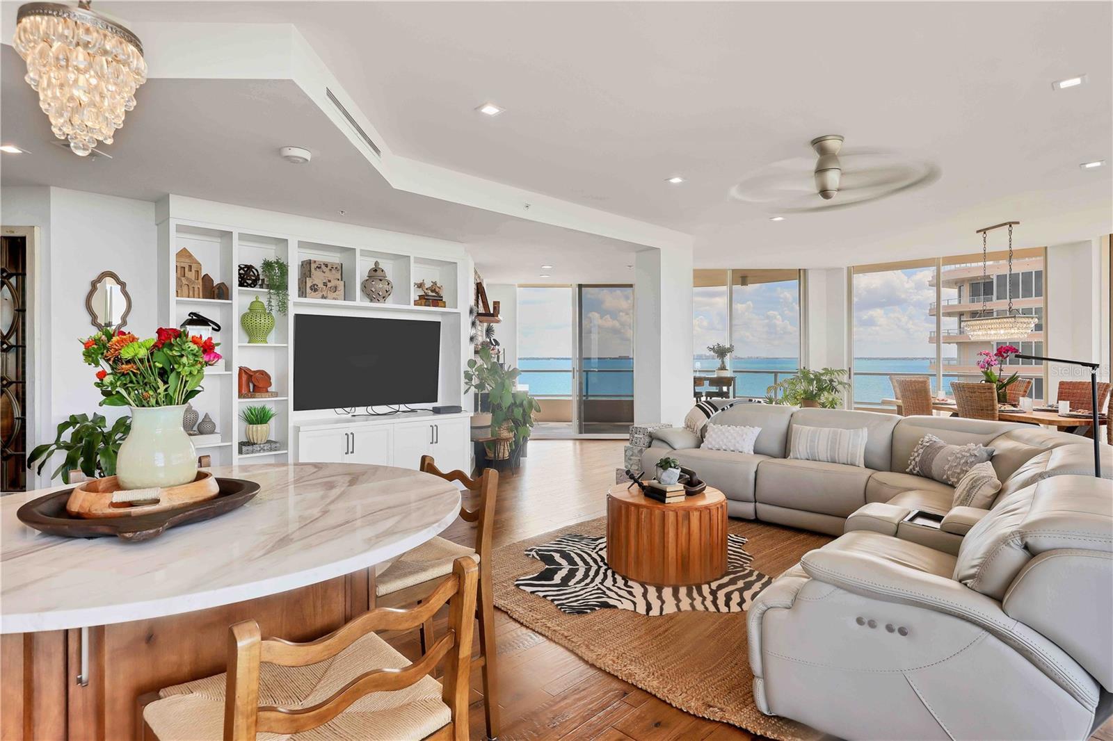 This home has unobstructed seventh-floor views of the Sarasota skyline, along with sweeping water views of Sarasota Bay, The Longboat Key Club and the Gulf. Enjoy the views from sunrise to sunset through the floor-to-ceiling windows and sliding doors. Go outdoors to experience the luxury of the stylishly tiled wraparound balcony, accessible from the east, south and west sides of this home. A total renovation enables you to move right in. The stunning interior redesign optimizes the views and maximizes the living space. You'll be impressed with the private elevator entrance which opens to the main living space, where you'll find a large dining area and a charming dry bar. The innovative design extends throughout the home, highlighted by a gourmet kitchen with luxury Italian appliances, exquisite cabinetry, and an island/breakfast bar with extra storage. Wake up each morning in the primary suite to the breathtaking views and convenience of two generous closets, one a substantial walk-in. The large primary bath has double vanities with illuminated mirrors, dual water closets, custom linen storage and a spacious shower with a rain head. Guest accommodations are equally impressive, with a comfortable guest suite featuring west-facing views, stylish finishes and a closet with custom built-ins. A third bedroom was designed to accommodate bunk beds with special lighting and mobile phone charging stations. This space can also easily serve as an office, library or studio. You'll find abundant storage in the hall closets, all outfitted with custom built-ins. There is a water filtration system in place and a new hot water heater, located in the laundry room. Parking for this home is on the lobby level with close access to the lobby, which makes life easy. There is also extra parking at the building. This move-in-ready home is a wonderful find. The Grand Bay community offers exceptional privacy, with superb amenities including a newly refurbished gym, two pools with spas, Har-Tru tennis courts and a clubhouse. Membership is included to the private Bay Isles Beach Club with access to five acres of gulf beach perfection, restrooms and beach chair storage. From this home, it's easy to go to the Longboat Key Club where you'll find 45 holes of golf, five private restaurants, a world-class tennis center and new pickleball courts, all available with separate membership.