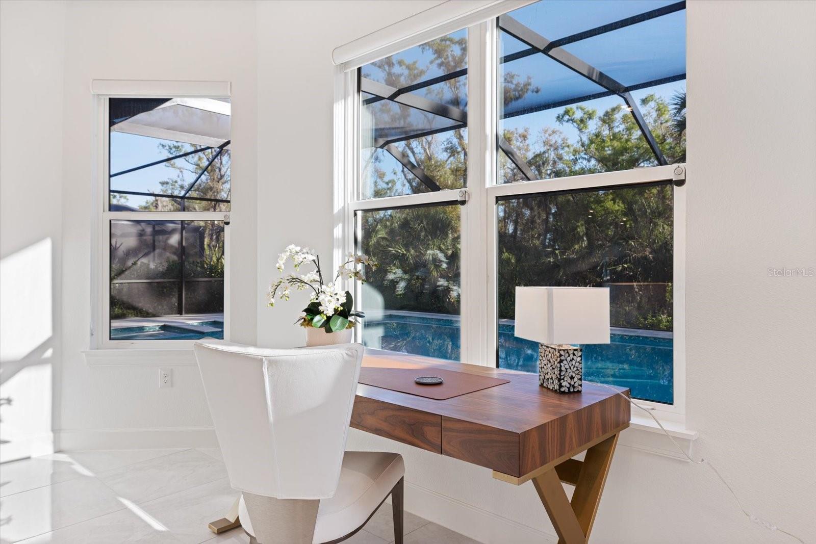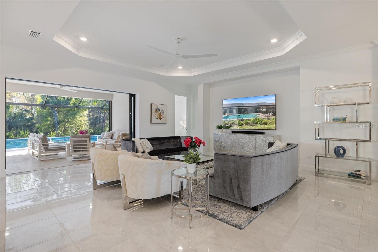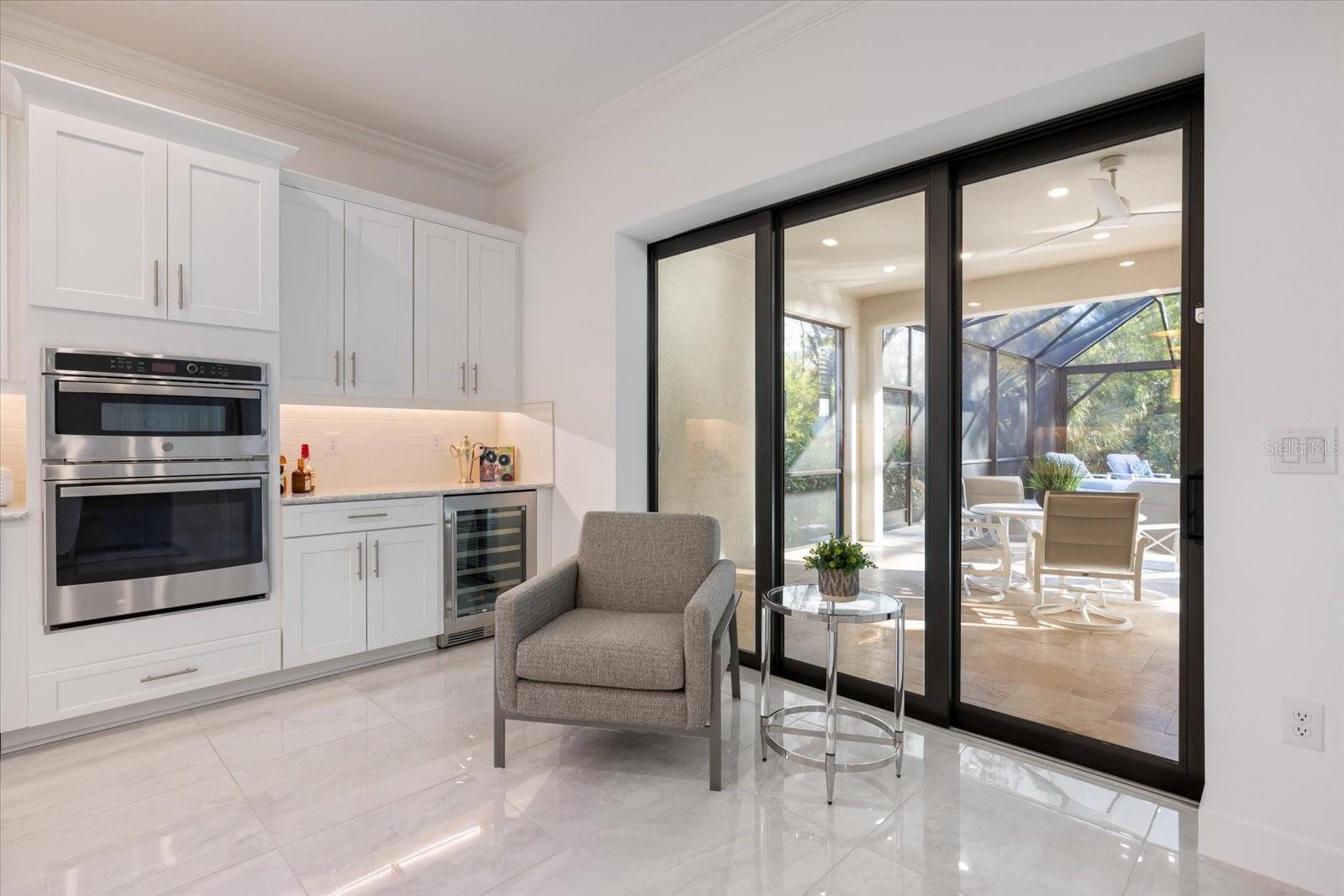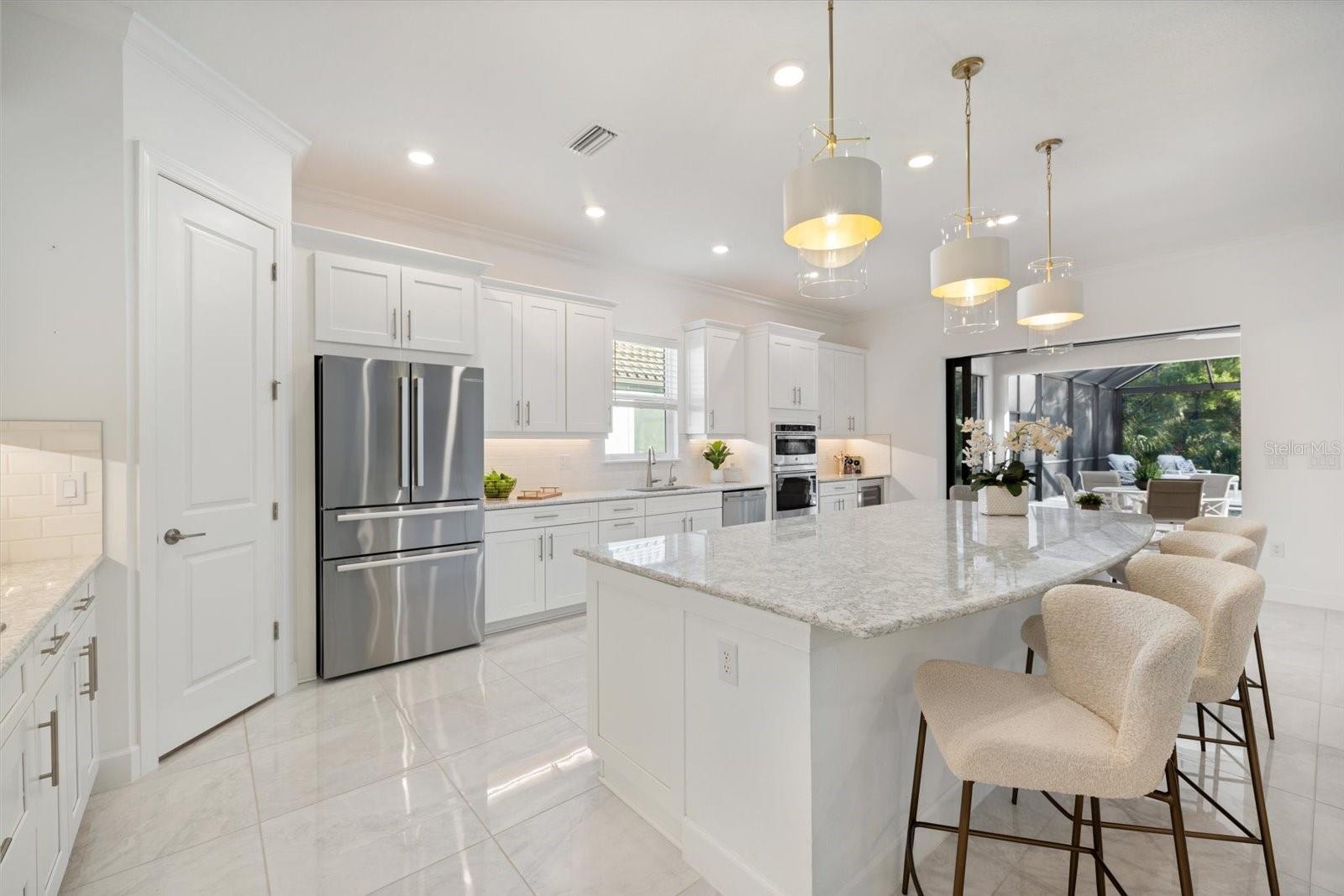 Discover the ideal blend of modern style and functionality at Esplanade at Azario with this NON GOLF DEEDED home. This sleek 3-bedroom, 3-bathroom home with a den features nearly $300,000 in post-construction upgrades, offering 3,072 square feet of contemporary elegance. The thoughtfully designed landscaping includes underground piping on both sides to efficiently manage rainwater. Enter into a bright, open space where chic tile floors and recessed lighting establish a modern ambiance. The oversized great room effortlessly transitions into the dining area, providing an ideal environment for relaxation and entertaining. The kitchen is a culinary enthusiast's dream, boasting a spacious island with premium quartz countertops, a walk-in pantry, and an extended area with a 44-bottle wine cooler. Outfitted with stainless steel appliances, including a gas stove and range hood, this kitchen is equipped for everything from casual breakfasts to gourmet dinners. Pocket sliding doors and stylish pendant lights add an extra layer of sophistication. The primary bedroom serves as a luxurious retreat, complete with a bay area perfect for a cozy sitting space. The ensuite bath features an oversized walk-in shower with dual shower heads, dual sinks, and a vanity, while the master closet offers ample storage space. Step outside to your private oasis, featuring an oversized saltwater pool, clear view screening, and a travertine deck. The extended covered lanai provides a serene spot to enjoy tranquil preserve views with added privacy. This home also includes two additional bedrooms, one of which is ensuite, and an oversized laundry room with cabinets and a sink. This residence is equipped with IMPACT GLASS THROUGHOUT, STORM SMART SCREENS, and a FULL HOUSE GENERATOR for your peace of mind. Additional features include a Central Vac, Culligan water system, recirculating pump for reclaimed water, electric for a car charger in the garage, smart home technology, designer lighting and fans, crown molding, tray ceilings, gutters, and room-darkening shades. Living in Esplanade at Azario grants you access to top-notch amenities, including a clubhouse, pickleball and tennis courts, gym, and putting green. The state-of-the-art Culinary Center offers additional dining and entertainment options. Unwind at the spa, take a dip in the resort-style pool, or enjoy a drink at the bar. An activities director is available to help you make the most of the community's offerings. This home is not just a place to live; it's a lifestyle waiting to be embraced.
