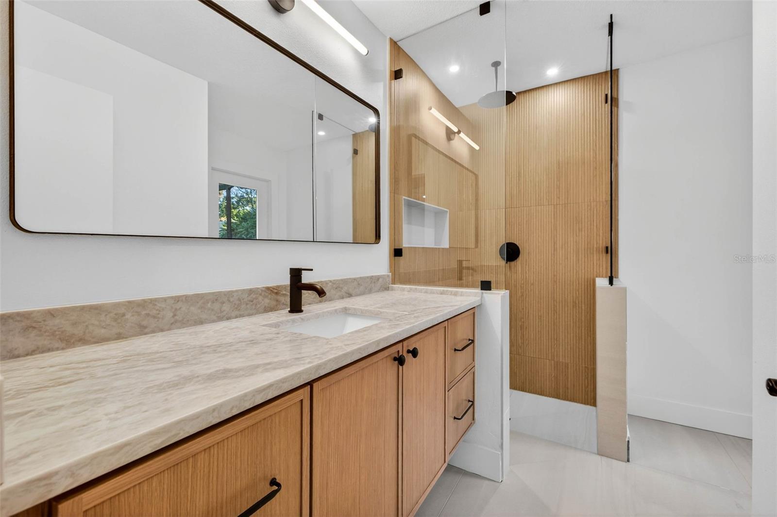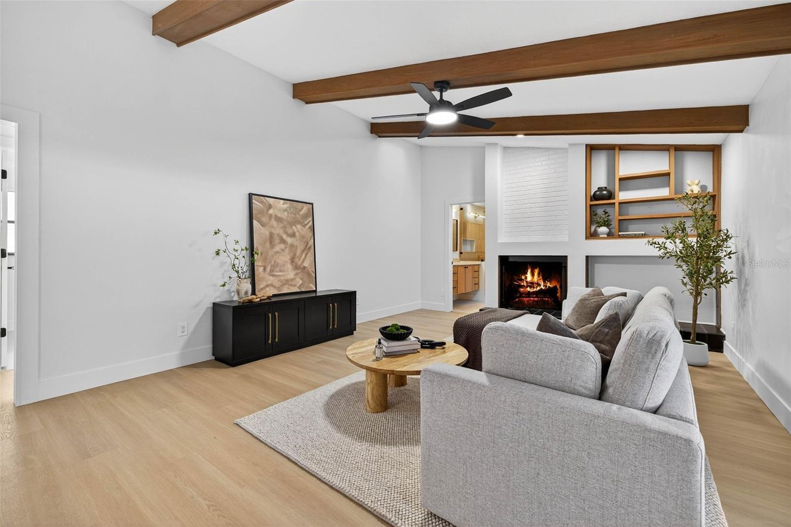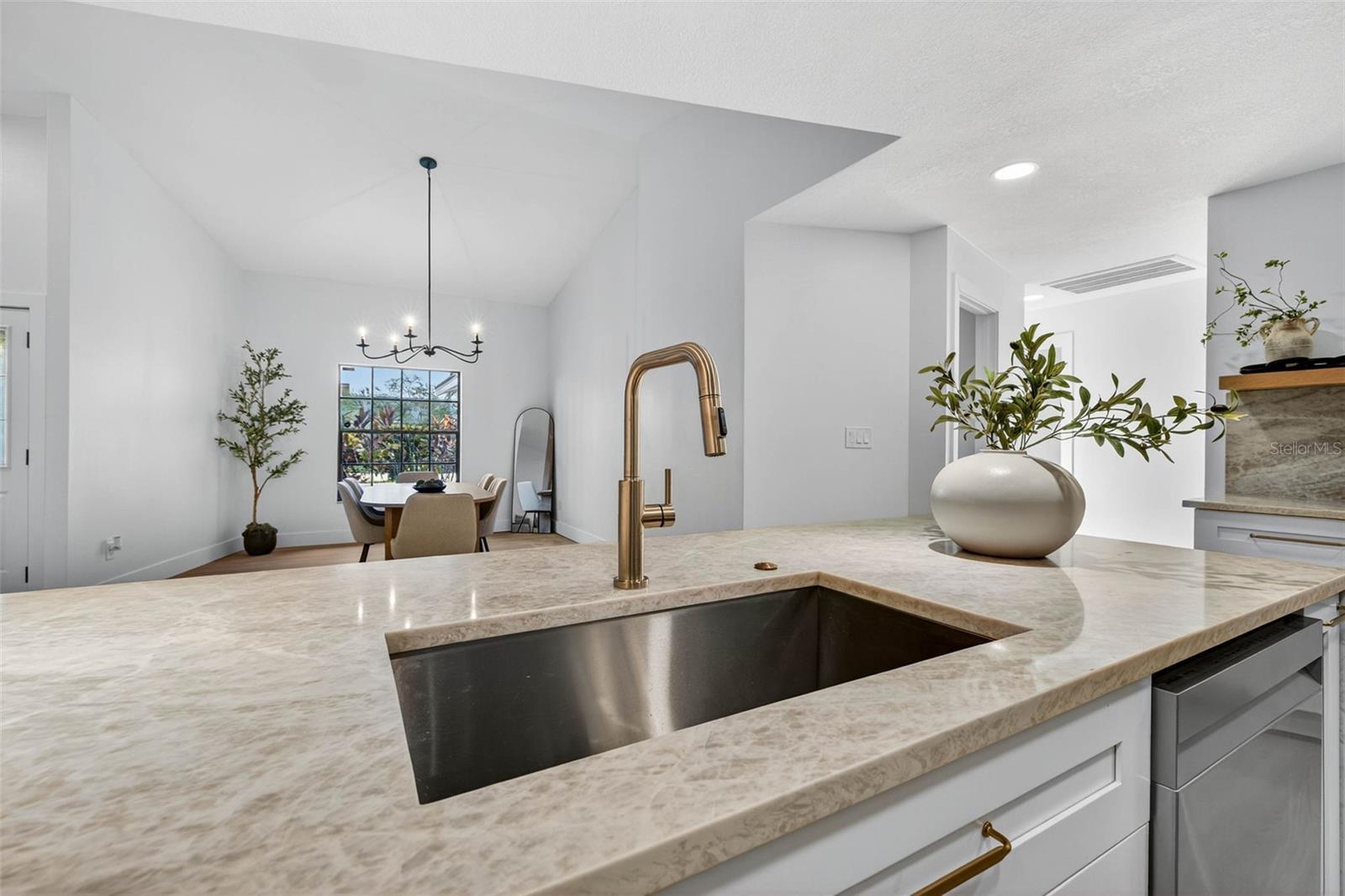 Located in one of Clearwaters most sought after neighborhoods, this 4 bed, 3.5 bath home has been beautifully renovated and sits on over a quarter of an acre lot. The homes chefs kitchen has a timeless design with white shaker cabinetry, topped with stunning waterfall Taj Mahal Quartz that also run up the backsplash and encase the range hood. The kitchen island is large in size with plenty of bar stool room for cooking and conversations. Adjacent to the kitchen there is additional cabinets that act as an extension to the main kitchen space with extra storage, a custom wooden shelf and modern sconces. The large walk-in pantry is tucked behind the kitchen for a seamless look with lots of shelving and plenty of additional storage. Off of the kitchen is the dinning space with views of the front yard and courtyard area. The home has two separate living spaces with a large living room in the front of the home and a family room towards the back. The living space in the front of the home has high vaulted ceilings and large sliders leading out to the pool and screened in lanai. The family room towards the back of home also has vaulted ceilings with beautiful exposed wooden beams creating a cozy modern feel, complete with an accent wall featuring a fireplace, exposed brick details and wooden decorative shelving. To finish it off, the space also has a wet bar area with the same finishes as the kitchen, complete with a sink, wine fridge, and wooden decorative shelves. The room has access via sliding doors to homes lanai creating the perfect indoor outdoor living combination. The home has a split floor plan with the primary suite on one side of the home and the remaining bedrooms and bathrooms on the other. The primary suite is large in size and has vaulted ceilings and access through siding glass doors to the pool and lanai. The primary suite bath resembles a luxury spa with double vanity sinks sitting in custom cabinetry and topped with Taj Mahal Quartz. The shower and soaking tub sit separately to the side in the bathroom with beautiful marble tile encasing the walls and flooring. The shower has a glass panel with black rim detailing and a separate wand in addition to the rainfall shower head. The bathroom also has a walk-in closet and private water closet. Set towards the front of the home is the 4th bedroom that could also pose as the perfect home office with double doors. The remaining bedrooms on the other side of the home are large in size with huge closets and share a common bath with double vanity sinks and tiled shower tub combo. The third full bathroom sits off of the back family room, convenient for guests, and has access to the lanai as well for the perfect pool bath. This bathroom has a standing shower with fluted decorative tiling and a rain fall shower head. The half bath is perfectly located towards the front of the home adjacent to the large laundry room with enough space to build out a drop station. The home has plenty of outdoor living space under the screened in lanai with pavers wrapping around the pool. There is also green space beyond the enclosure in the fully fenced in back yard. The home is located near the Countryside Mall and Highway 19, full of shops and restaurants. Downtown Dunedin is nearby and the Tampa International Airport and Gulf Beaches are a short drive away.