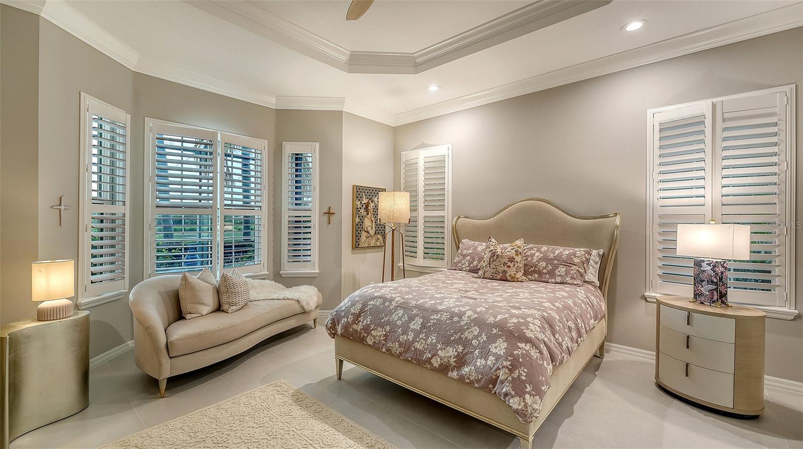 - Ceiling Fans(s), Chair Rail, Crown Molding, Eat-in Kitchen, High Ceilings, Kitchen/Family Room Combo, Open Floorplan, Solid Surface Counters, Split Bedroom, Stone Counters, Thermostat, Tray Ceiling(s), Walk-In Closet(s), Window Treatments