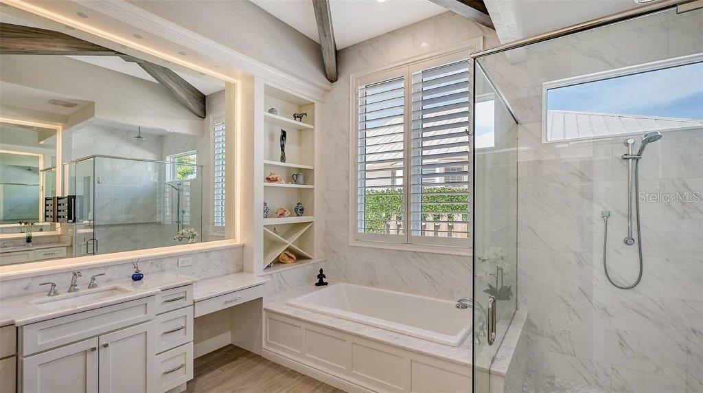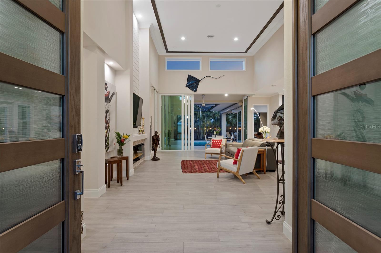 An exceptional single-story Allegra home in Sarasota’s coveted West of Trail Flower Streets, perfectly positioned within the Southside School district and just steps from the charming Southside Village restaurants, shops, and Morton’s Gourmet Market. This impeccably designed 3-bedroom + office + bonus room, 2.5-bathroom home epitomizes modern coastal living and showcases the esteemed Kristi Ann single story floor plan, offering a seamless blend of sophisticated design and everyday functionality, making it an ideal primary or seasonal residence. From the moment you step through the double doors, you’ll be captivated by the open and inviting main living space. The soaring 18-foot ceiling and wall of expansive 10-foot pocketing sliders draw you towards the resort-like outdoor retreat, perfect for relaxing or entertaining. The living room is a true architectural masterpiece, featuring a dramatic floating tray ceiling with Halo-LED lighting and a focal wall complete with a remote-controlled electric fireplace. The chef's kitchen is as functional as it is stylish, equipped with stainless steel appliances, a 5-burner gas range, Quartz island and countertops, and a generous walk-in pantry. The dining area, both intimate and elegant, includes a built-in Quartz-topped buffet, creating a serene space for family meals or hosting guests. The primary suite offers a tranquil escape, with vaulted ceiling accented by charming wood beams. The spacious custom walk-in closet ensures ample storage, while the spa-like en-suite bathroom, featuring glass-enclosed shower and designer tile, is the perfect respite after a long day. Two additional large guest bedrooms, along with a well-appointed guest bathroom and powder room, offer comfort and privacy for family or visitors. This award-winning floorplan also boasts a dedicated office, versatile bonus room, laundry room, and a 2-car garage with added storage, meeting the needs of modern living. Step outside and discover an expansive lanai with a resort-style heated pool, spa, and impressive summer kitchen, all surrounded by lush landscaping and illuminated by custom lighting. The disappearing corner sliders seamlessly blend indoor and outdoor spaces, offering the quintessential Sarasota lifestyle. This home is packed with custom features, including designer lighting and built-ins, PGT impact windows, solid-core interior doors, and spray foam insulation for optimal energy efficiency. Recent upgrades include remote-controlled Kevlar shades for additional hurricane protection/storage for outside furnishings/sunshade, new AC unit with UV lights, 2023 mini split AC unit in the garage, and a whole-home in-duct air purifier, ensuring comfort and peace of mind. This impeccably crafted residence captures the essence of Southside Village living, offering a single-level floor plan that balances everyday comfort with refined style. Ideally positioned near Southside School, Sarasota Memorial Hospital, Downtown Sarasota, and Siesta Key Beach, it delivers the ultimate blend of location, luxury, and lifestyle. Built to the latest hurricane codes and outside the flood zone, the home provides peace of mind along with timeless design. Every detail has been thoughtfully curated, creating an exceptional opportunity for discerning buyers to experience the best of Sarasota living in a true single-story gem.