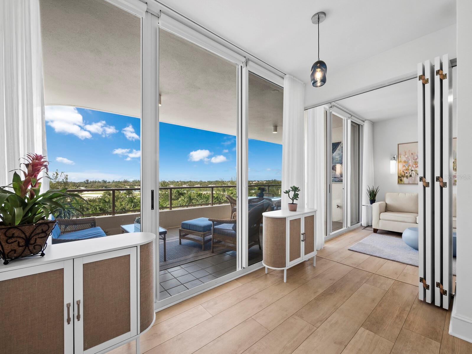 Under contract-accepting backup offers. Beautifully renovated and offered turnkey furnished, this 3BR/3.5BA residence is perfectly positioned on the 5th floor of Building I in Grand Bay on Longboat Key. A private elevator opens to an elegant, open layout with new wood floors, architectural details, and recessed lighting. Walls of glass frame sweeping views of Sarasota Bay and the Harbourside golf course. The updated kitchen features all-white cabinetry, stone countertops, designer backsplash, premium stainless-steel appliances, and a wine fridge. The spacious living and dining areas flow to an expansive balcony ideal for relaxing or entertaining. A flexible enclosed bonus room / bedroom offers space for an office, media room, or guests. The primary suite includes custom built-ins, balcony access, a large walk-in closet, and a luxurious updated bath with floating vanities, freestanding tub, and glass shower. Two guest suites offer private baths. Additional features include in-residence laundry and under-building parking. Grand Bay residents enjoy resort-style amenities—two pools and spas, a fitness center with saunas, tennis courts, clubhouse—and private Bay Isles Beach Club access. Optional membership to the Longboat Key Club offers golf, tennis, marina, dining, and beach resort privileges—enhancing the ultimate island lifestyle. Large dogs are welcome.
