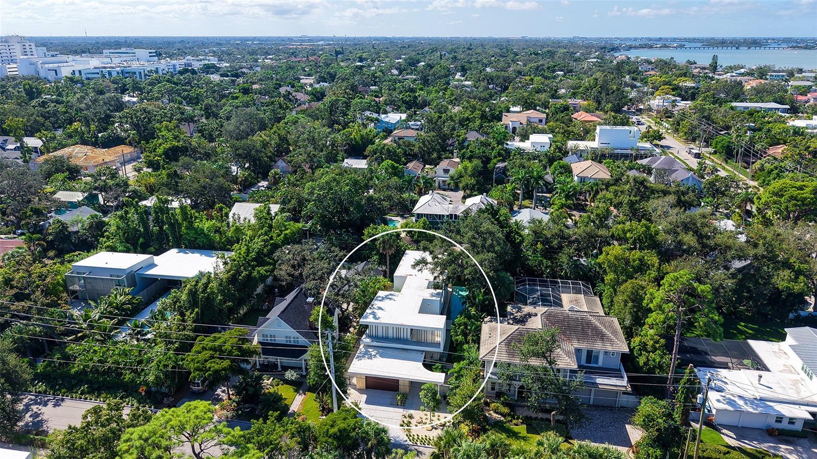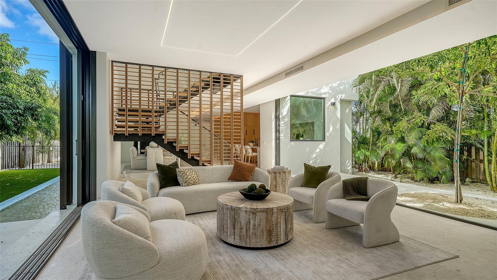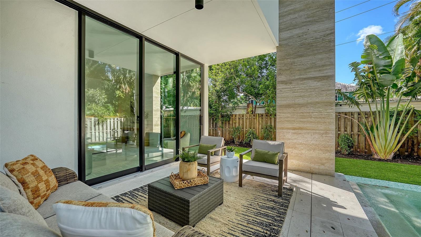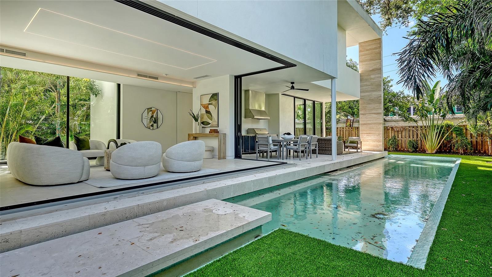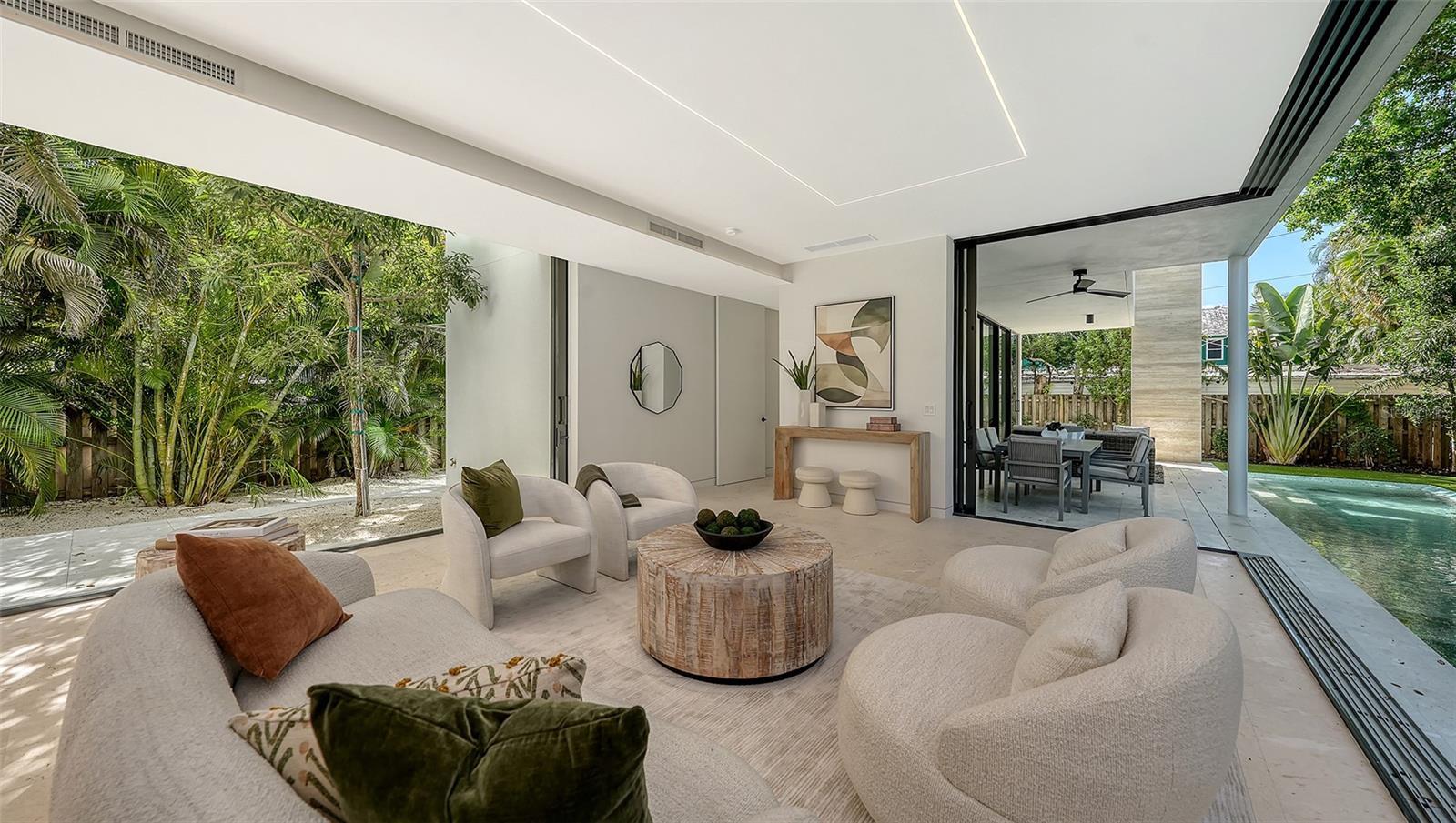 Stunning New Construction by Award-Winning Architect Dan Lear in coveted West of Trail Neighborhood** This meticulously designed luxury home offers the perfect blend of modern elegance and timeless sophistication. Near Selby Gardens, Morton's Market, and Sarasota Memorial Hospital, this exceptional property provides both convenience and style. Spanning over 3,800sqft of living area, this expansive residence boasts four spacious bedrooms, five full bathrooms, a enormous den with terrace, and a dedicated office space, all thoughtfully crafted for contemporary living. The grand, open-concept great room is the heart of the home, seamlessly floating over the pool area with a stunning large corner pocketing glass door that connects the interior to the beautifully landscaped outdoor oasis. The second floor features three guest suites, each with its own private terrace, offering tropical views and tranquility. The home's striking exterior showcases luxurious vein-cut travertine, creating a refined, sophisticated look. This is an extraordinary opportunity to move right in to a worry free one-of-a-kind masterpiece.