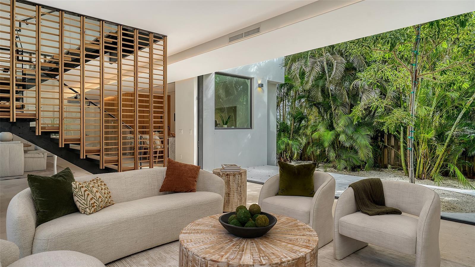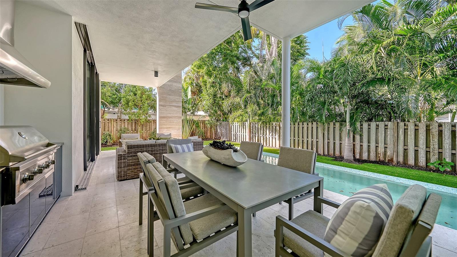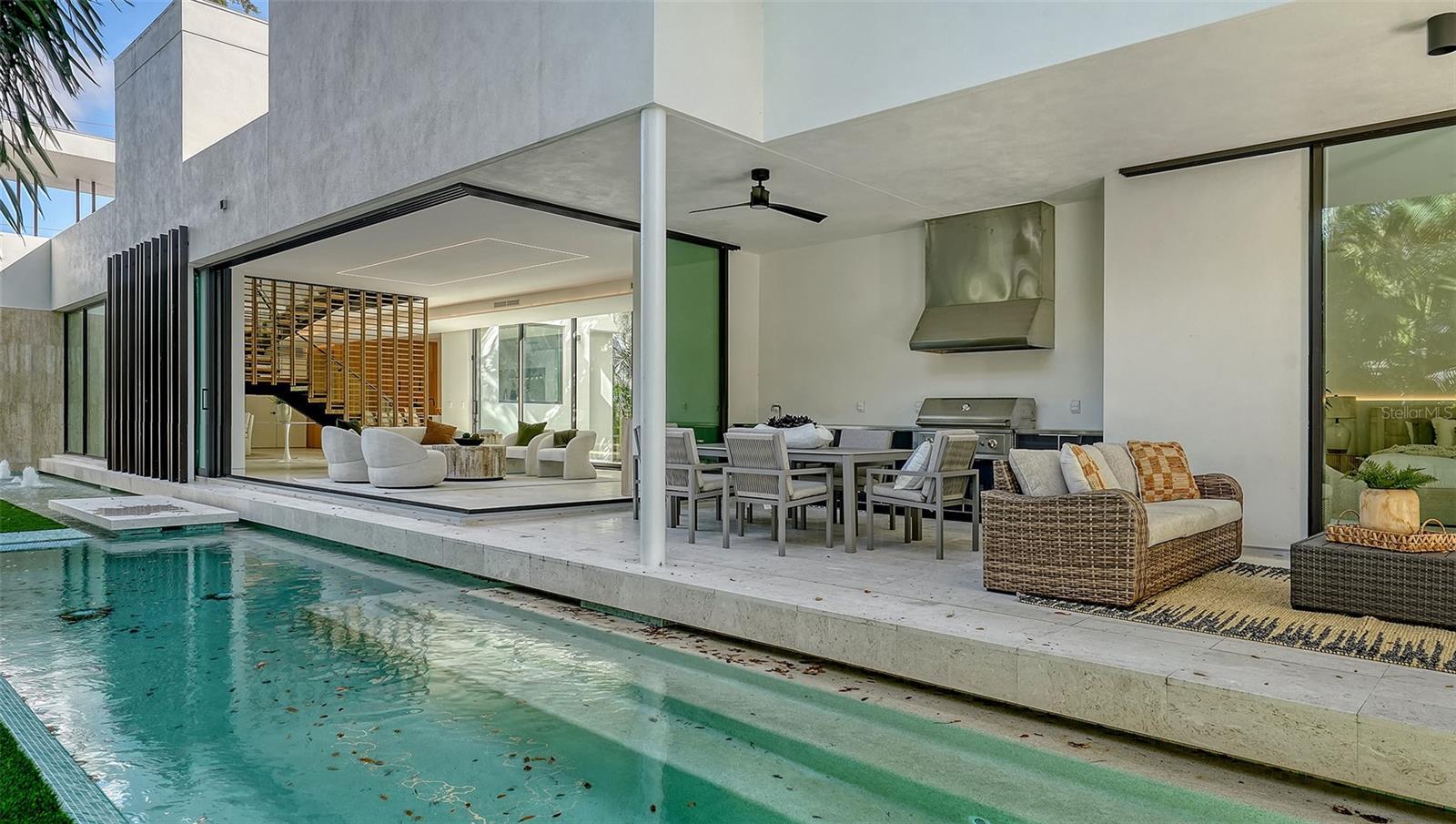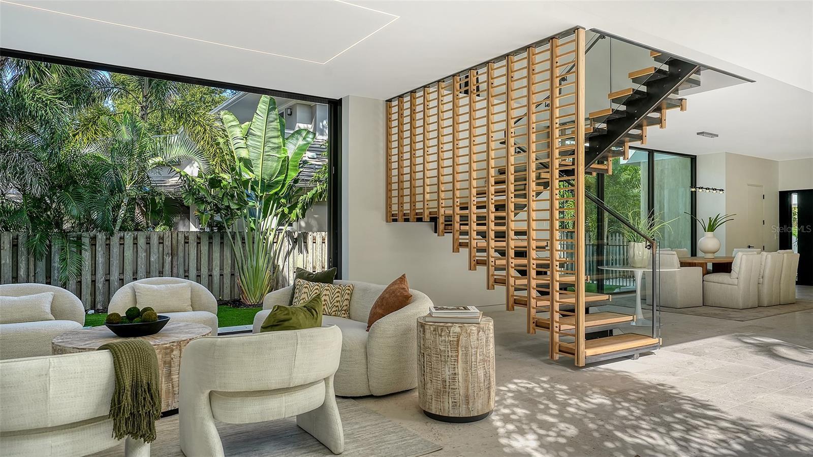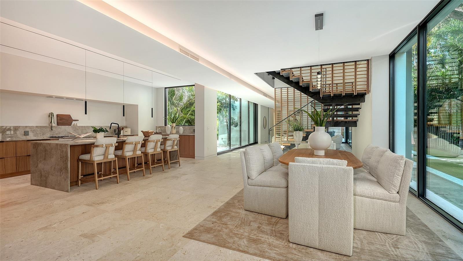 Stunning New Construction by Award-Winning Architect Dan Lear in coveted West of Trail Neighborhood** This meticulously designed luxury home offers the perfect blend of modern elegance and timeless sophistication. Near Selby Gardens, Morton's Market, and Sarasota Memorial Hospital, this exceptional property provides both convenience and style. Spanning over 3,800sqft of living area, this expansive residence boasts four spacious bedrooms, five full bathrooms, a enormous den with terrace, and a dedicated office space, all thoughtfully crafted for contemporary living. The grand, open-concept great room is the heart of the home, seamlessly floating over the pool area with a stunning large corner pocketing glass door that connects the interior to the beautifully landscaped outdoor oasis. The second floor features three guest suites, each with its own private terrace, offering tropical views and tranquility. The home's striking exterior showcases luxurious vein-cut travertine, creating a refined, sophisticated look. This is an extraordinary opportunity to move right in to a worry free one-of-a-kind masterpiece.