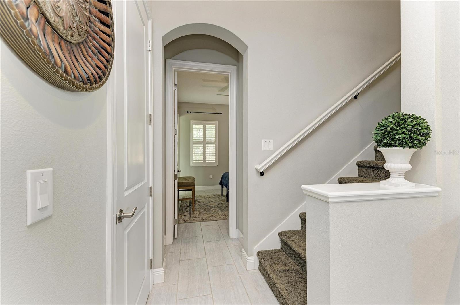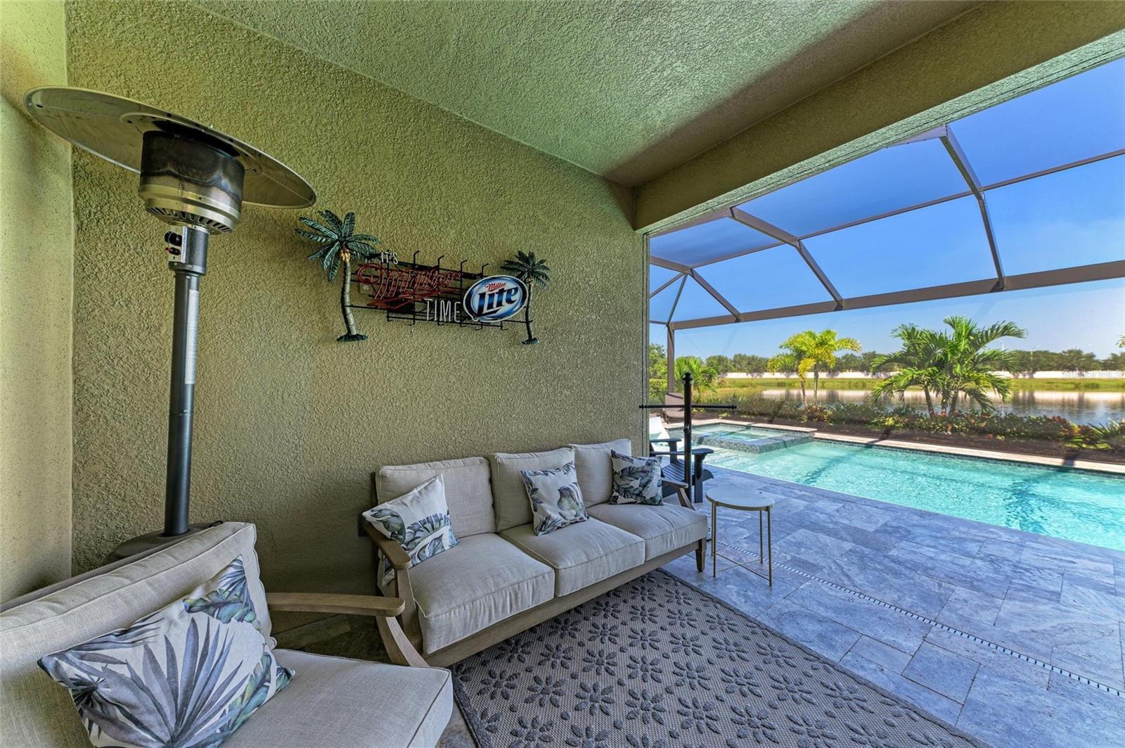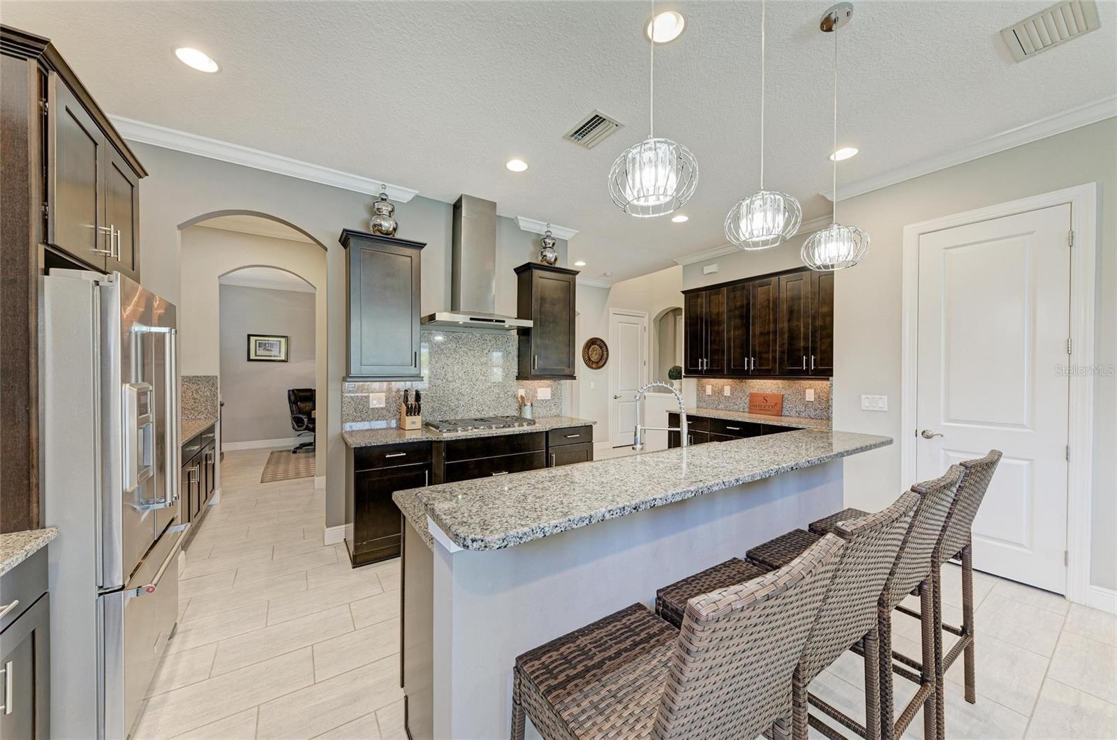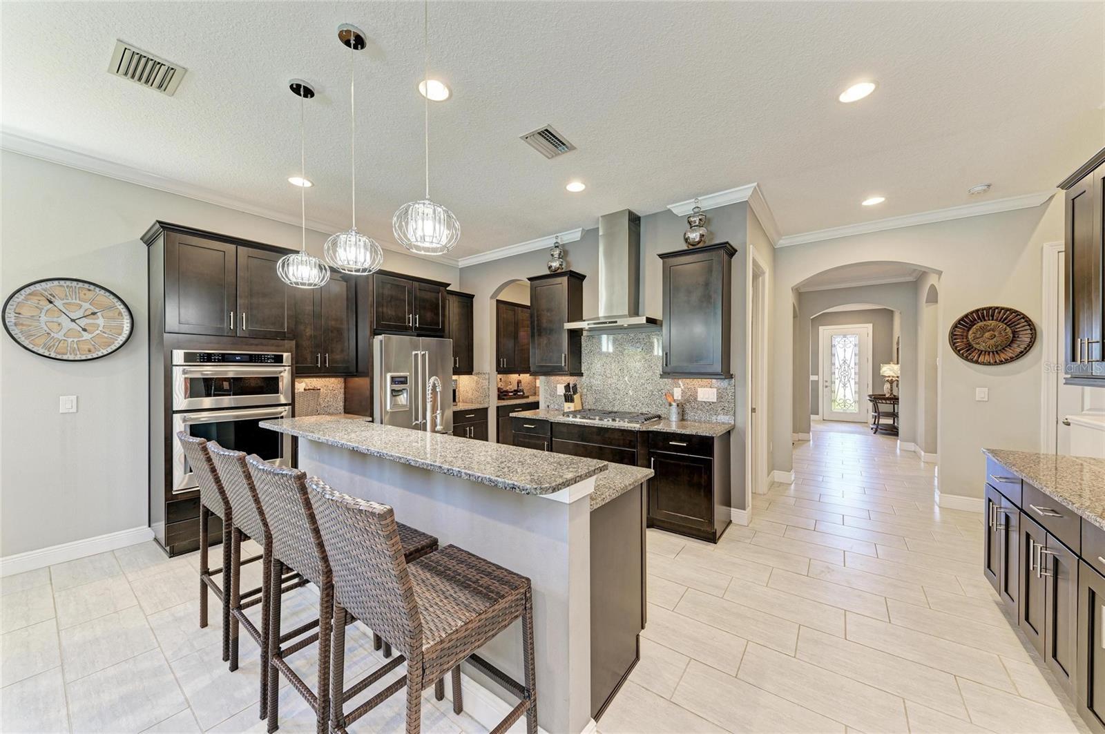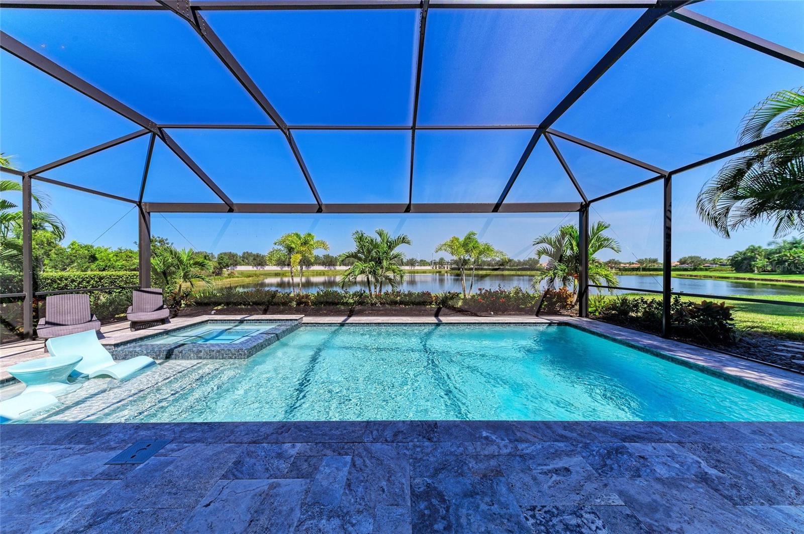 Discover this beautifully upgraded 4 bedroom, 4.5 bathroom home with tranquil water views in the gated Rosedale Golf & Country Club, designed for both luxury living and effortless entertaining. Featuring tile flooring throughout, crown molding, plantation shutters, custom draperies, and designer light fixtures, every detail has been thoughtfully curated to create a space that is sophisticated, welcoming, and move-in ready. The chef’s kitchen is a showpiece, offering granite counters and backsplash, custom cabinetry, abundant prep space, high-end KitchenAid appliances, a 5-burner gas cooktop, walk-in pantry, and a large island with breakfast bar and seating for family and friends. A butler’s pantry connects the kitchen to the formal dining room, making entertaining effortless. The kitchen opens to the great room, where sliding doors lead to the amazing outdoor living area. The backyard is an entertainer’s dream. Host gatherings or relax outdoors with a spacious entertaining area, heated saltwater pool and spa with sun shelf, travertine pavers, and lush, upgraded landscaping. The outdoor kitchen features two small beverage/wine refrigerators and a large island with seating, creating the perfect space for grilling, poolside dining, or enjoying quiet moments while taking in the beautiful water views. The owner’s suite is a luxurious retreat, offering picturesque water views, a large walk-in closet, dual sinks with granite counters, and a walk-in frameless glass shower. Two additional first-level bedrooms with ensuite bathrooms offer privacy and comfort. Upstairs, a generous loft bedroom suite with full bath and walk-in closet is ideal for overnight guests, extended stays, or a versatile media/game space. Additional upgrades include impact-resistant windows and sliding glass doors, tankless gas water heater, gutters, and designer touches throughout, ensuring both beauty and functionality. Living in Rosedale Golf & Country Club offers a resort-style lifestyle. Low HOA fees cover all landscaping and irrigation maintenance, high-speed fiber internet and cable, two manned 24/7 guard gates, plus two dog parks for residents. Social membership at the club provides access to tennis, a 22,000 sq ft clubhouse, fitness center, studio classes, full-service restaurant, Jr. Olympic-size heated pool, and year-round social events. For the avid golfer, Rosedale offers various levels of optional golf membership. Ideally located near I-75, Lakewood Ranch, UTC Mall, top-rated schools, shopping, dining, parks, medical facilities, and world-famous beaches, this home perfectly blends luxury, comfort, and an entertainer’s dream lifestyle.