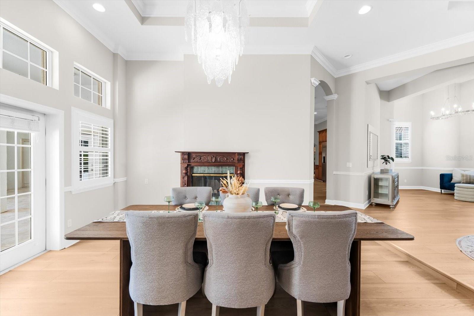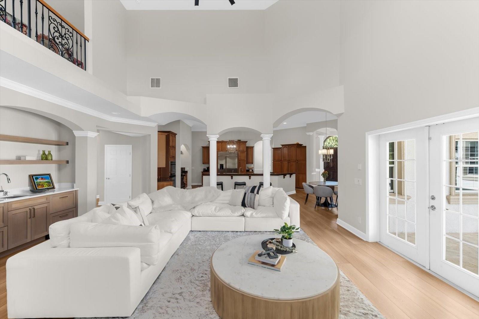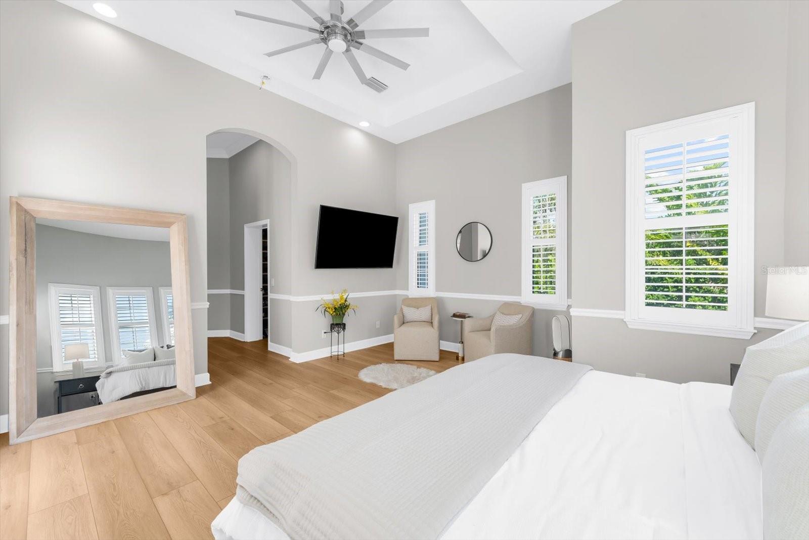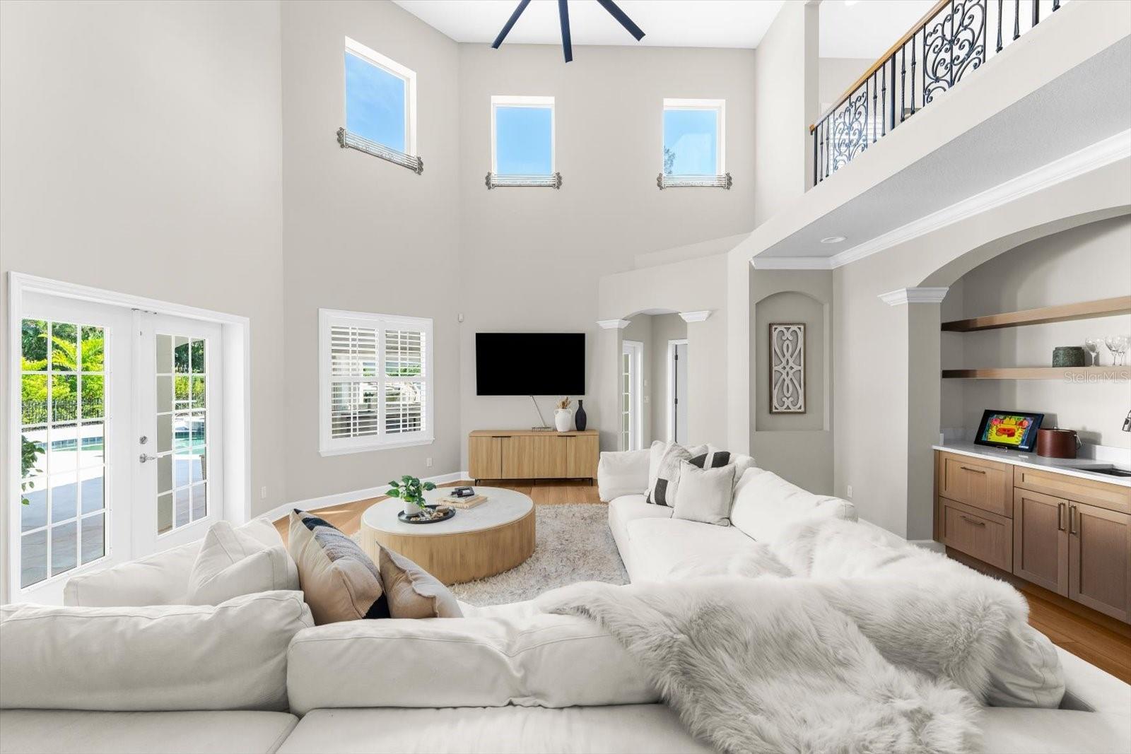 - Built-in Features, Cathedral Ceiling(s), Ceiling Fans(s), Crown Molding, Eat-in Kitchen, High Ceilings, Kitchen/Family Room Combo, Open Floorplan, Primary Bedroom Main Floor, Solid Surface Counters, Thermostat, Walk-In Closet(s), Wet Bar, Window Treatments