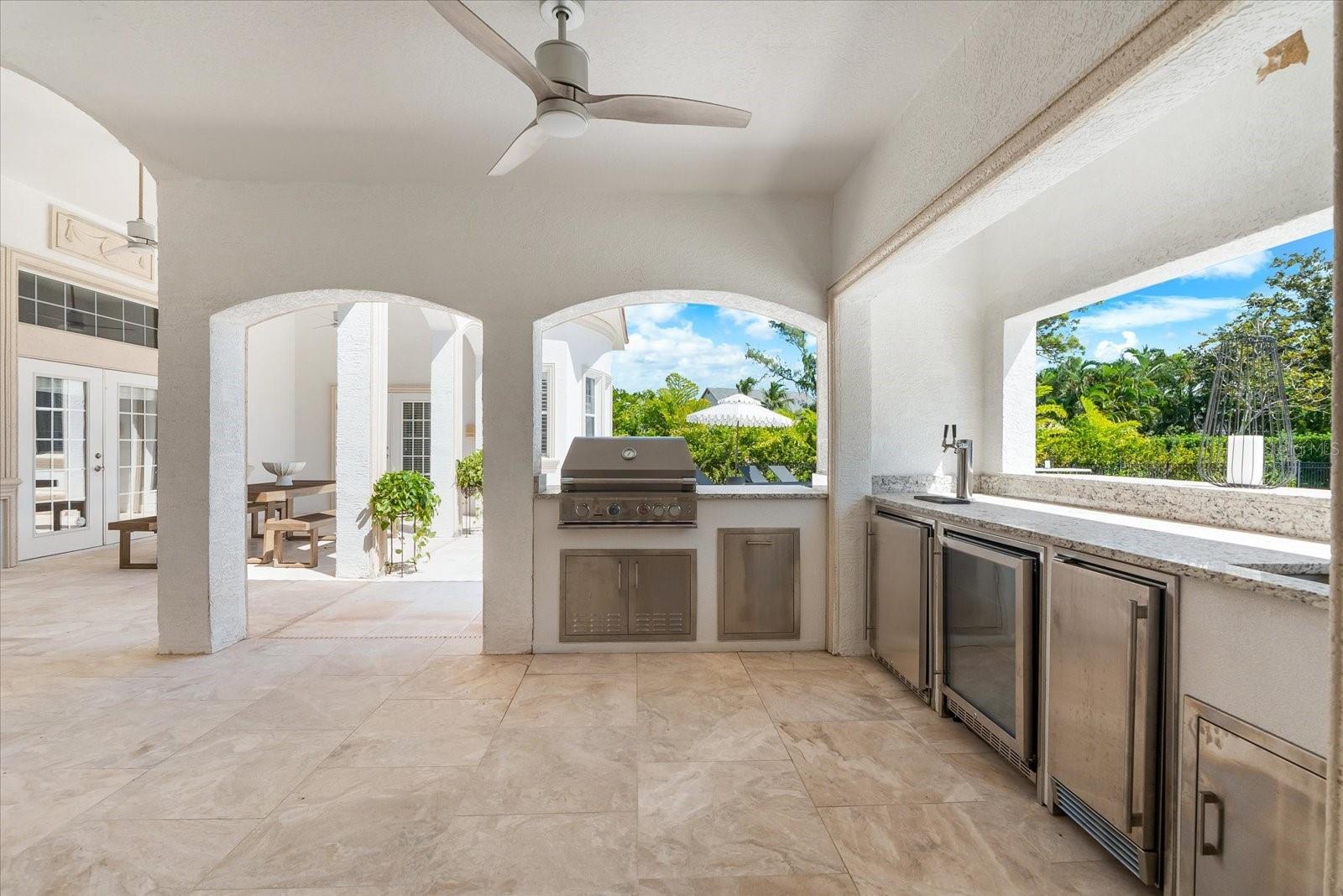 - French Doors, Outdoor Kitchen, Private Mailbox, Rain Gutters, Sidewalk, Storage