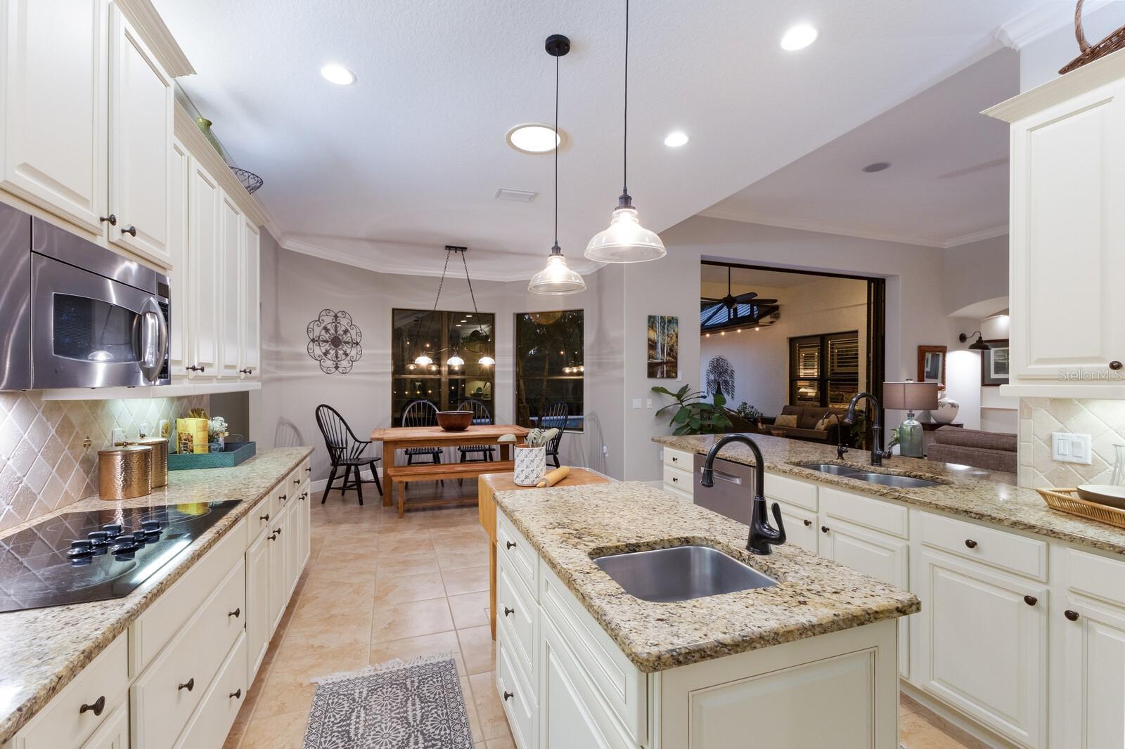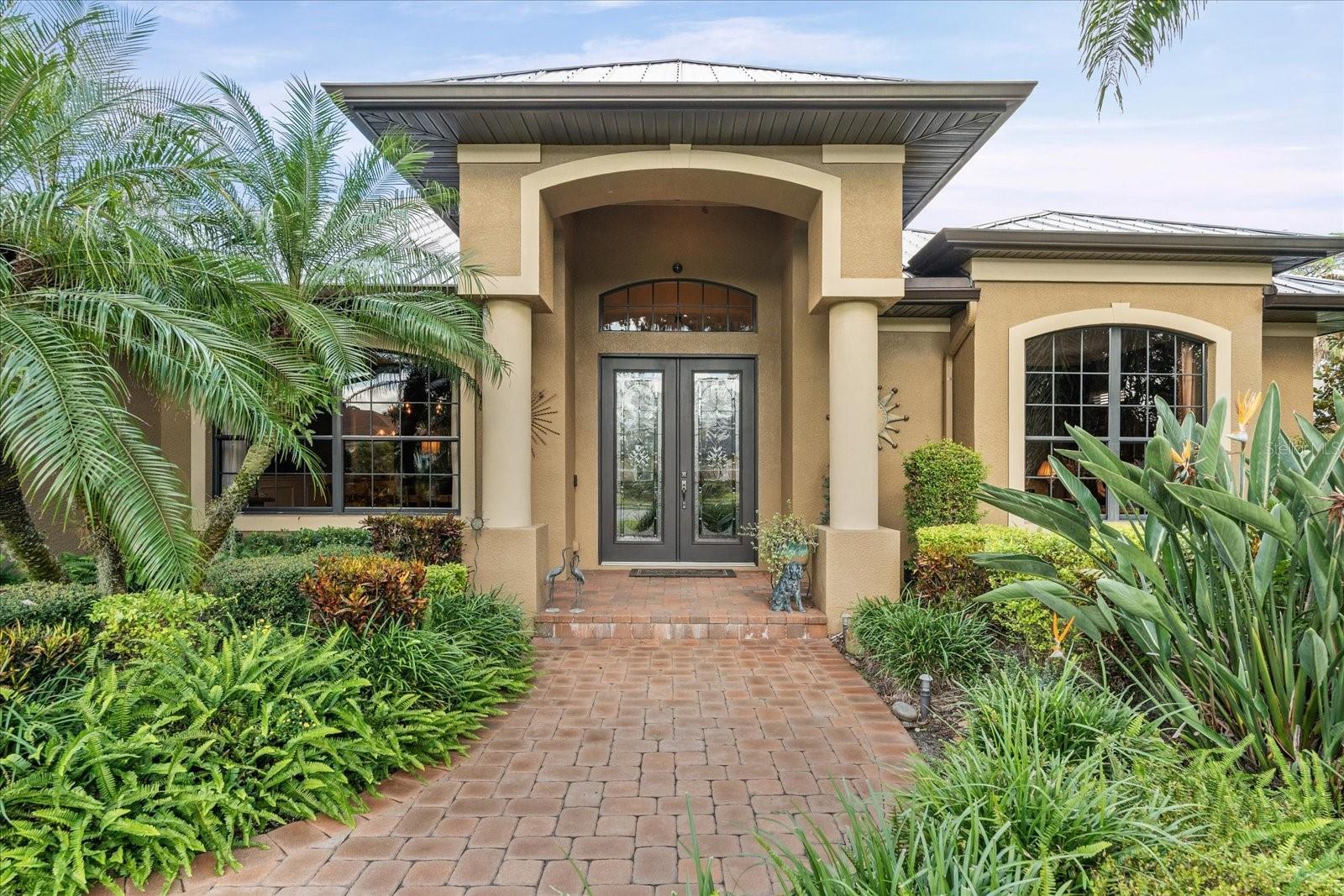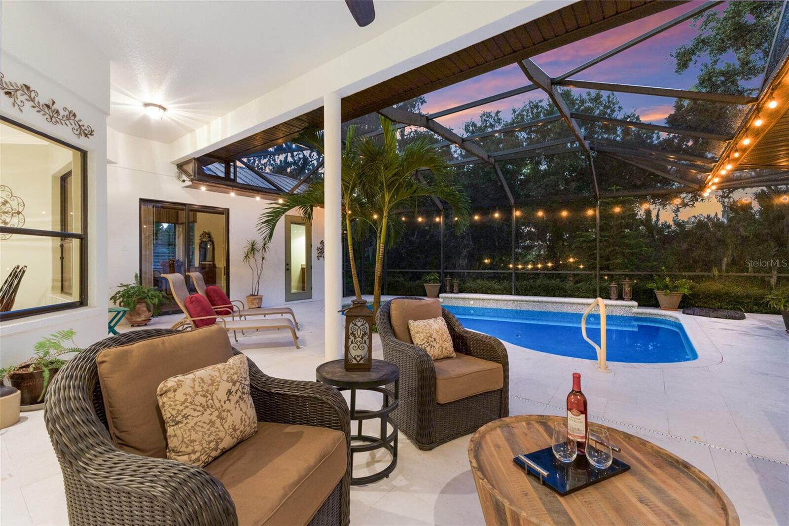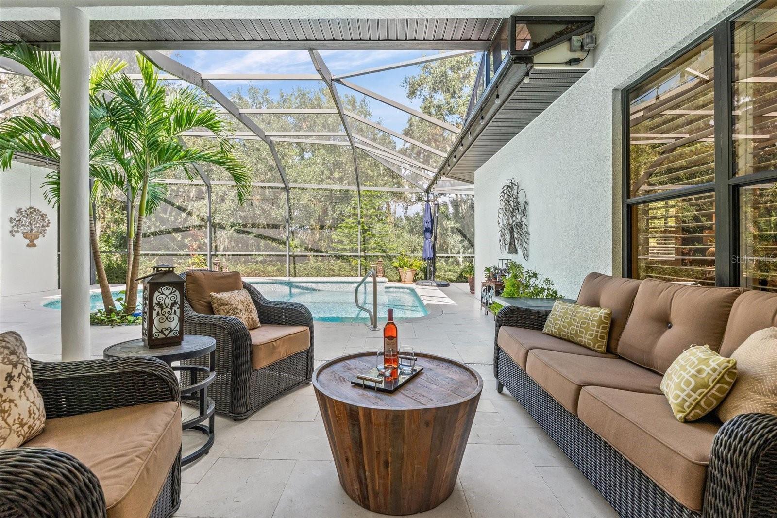 Highly sought-after Twin Rivers is where you’ll find this stunning, custom-built Mark Cahill home — perfectly positioned in a serene, park-like setting surrounded by majestic oaks, swaying palms, and lush lawns. This immaculately maintained residence blends timeless craftsmanship with thoughtful recent upgrades and incredible 'Old Florida' curb appeal. Step through the beautiful glass double doors into the inviting foyer and take in the open, well-designed floor plan. Beyond the wall of disappearing sliders, the private lanai and refreshed pool and decking create a true outdoor oasis framed by the tranquil natural preserve. Boasting 3,235 sq. ft. of living space, the home includes three bedrooms, three full baths, a spacious great room that flows effortlessly into the kitchen and pool areas, a formal living and dining room, and a dedicated office/den with French doors and built-in shelving — ideal for working from home or nursery. The chef’s kitchen is a showstopper — complete with double ovens, two prep sinks with disposals, granite counters, abundant 42” solid wood cabinetry with crown molding, a separate pantry, and a butler’s pantry with glass-front display cabinets. Ample natural light pours in from solar tubes, while under- and over-cabinet lighting enhances both style and function. The split bedroom floor plan ensures privacy for everyone. The luxurious primary suite offers his-and-her walk-in closets, plantation shutters, dual vanities, an oversized jetted soaking tub, and a fully tiled walk-in shower “room” with dual shower heads. The en-suite guest bedroom features its own large tiled shower and walk-in closet — perfect for extended stays. Throughout the home, you’ll find 6” crown molding and baseboards, upgraded lighting and ceiling fans, complete interior painting including ceilings, and updated fixtures that give the entire home a fresh, sophisticated feel. Outdoor living shines on the private, screened lanai — perfect for lounging by the sparkling pool, entertaining, or relaxing under the café lighting that adds a touch of evening magic. A new (2023) 5V painted metal roof crowns the home for years of beauty and durability. 2/26 Two New AC units installed! Garages & Storage- Main home: Oversized 612 sq. ft. two-car garage with tall ceilings and built-in storage. Detached garage: Additional 550 sq. ft. air-conditioned two-car garage ideal for hobby space, vehicles, or workshop use — both with pull-down attic storage. And a wide, paver driveway provides ample parking for guests. Additional Opportunity- An adjacent premium lakeside lot is also available under separate contract — ideal for additional privacy or future investment. Community Highlights- Residents enjoy a fishing dock, kayak/canoe launch, playground, basketball and volleyball courts, soccer field, and scenic walk/bike/golf cart-friendly streets throughout this beautiful Twin Rivers community.