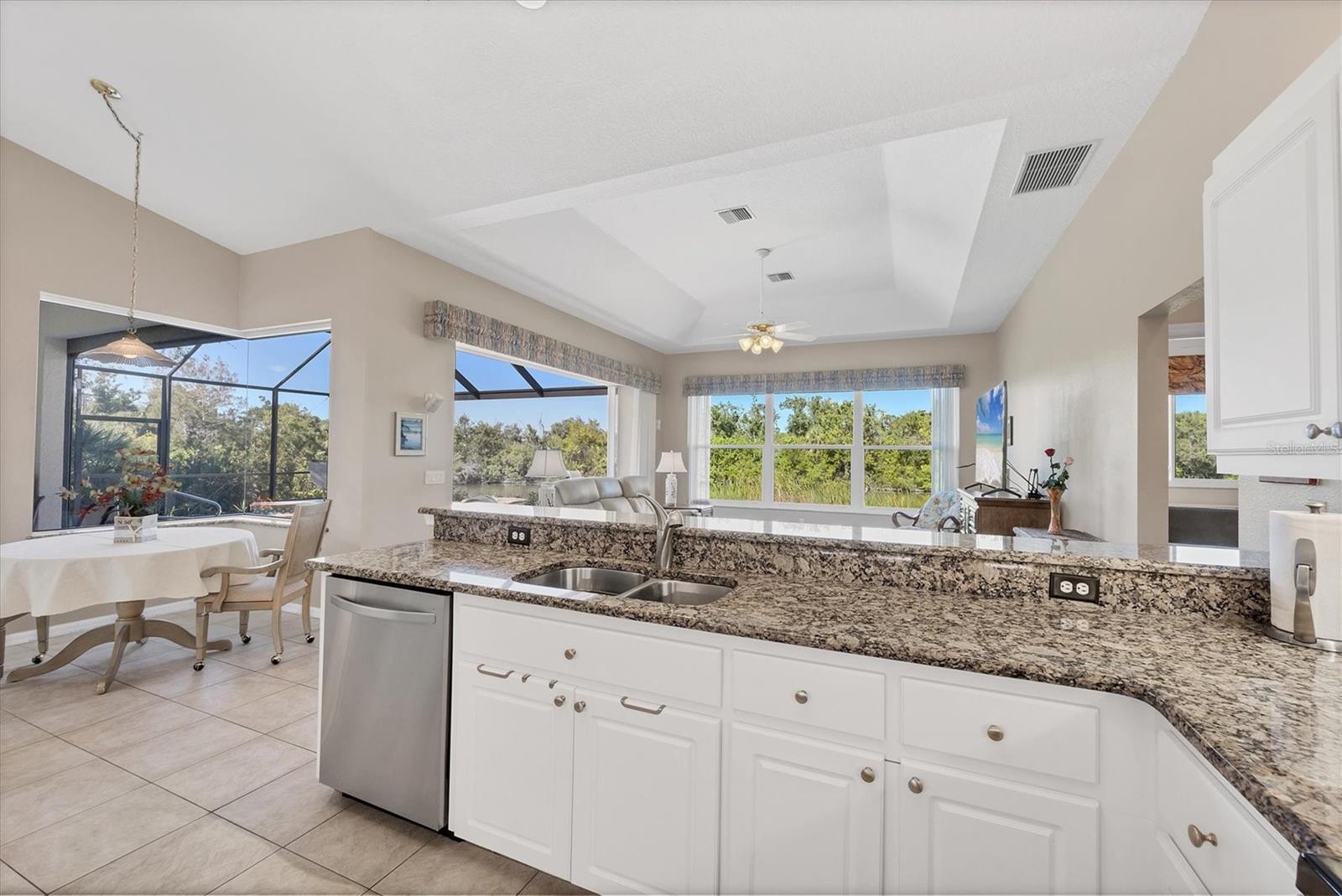Private. Peaceful. Perfectly reimagined. On one of the most private home sites in the Lakes of Jacaranda, this reimagined Aruba II model by J&J Homes blends serene pond views, modern design, and everyday resilience. Surrounded by lush tropical landscaping with no visible neighbors, the 2,282-square-foot layout features three bedrooms, two baths, and soaring ceilings. The open-concept plan shines with a gourmet kitchen featuring granite countertops, custom rollout pantry shelves, and seamless flow into sunlit living and dining areas. The primary suite is a spa-like retreat with a soaking tub, walk-in shower and dual closets. A guest room doubles as an office with a built-in Murphy bed and desk. Enjoy Florida living at its best with a new tile roof, new solar panels (which run the entire house for $45/month) and a saltwater pool (with resurfaced pool deck, pool heater, pool pump), enclosed by a new lanai cage. Smart upgrades include 34 solar panels, hurricane-rated windows and doors, UV air purification and push-button shutters. Many upgrades completed to the highest standards offering turnkey peace of mind. Coupled with low HOA fees, the Lake of the Woods community offers a resort-inspired lifestyle featuring a clubhouse, pool, tennis courts, walking trails, bicycle lanes and tranquil ponds that enhance the natural beauty of the Lakes of Jacaranda. Just four miles from Gulf beaches and minutes from downtown Venice, this residence offers proximity to award-winning golf, dining, shopping and year-round recreation. A showcase of design and distinction, this exceptional home invites you to enjoy the best of coastal Florida living, crafted for those who appreciate elegance, privacy and peace of mind. Each office is independently owned and operated. HUGE PRICE IMPROVEMENT ON 2-3-2026.