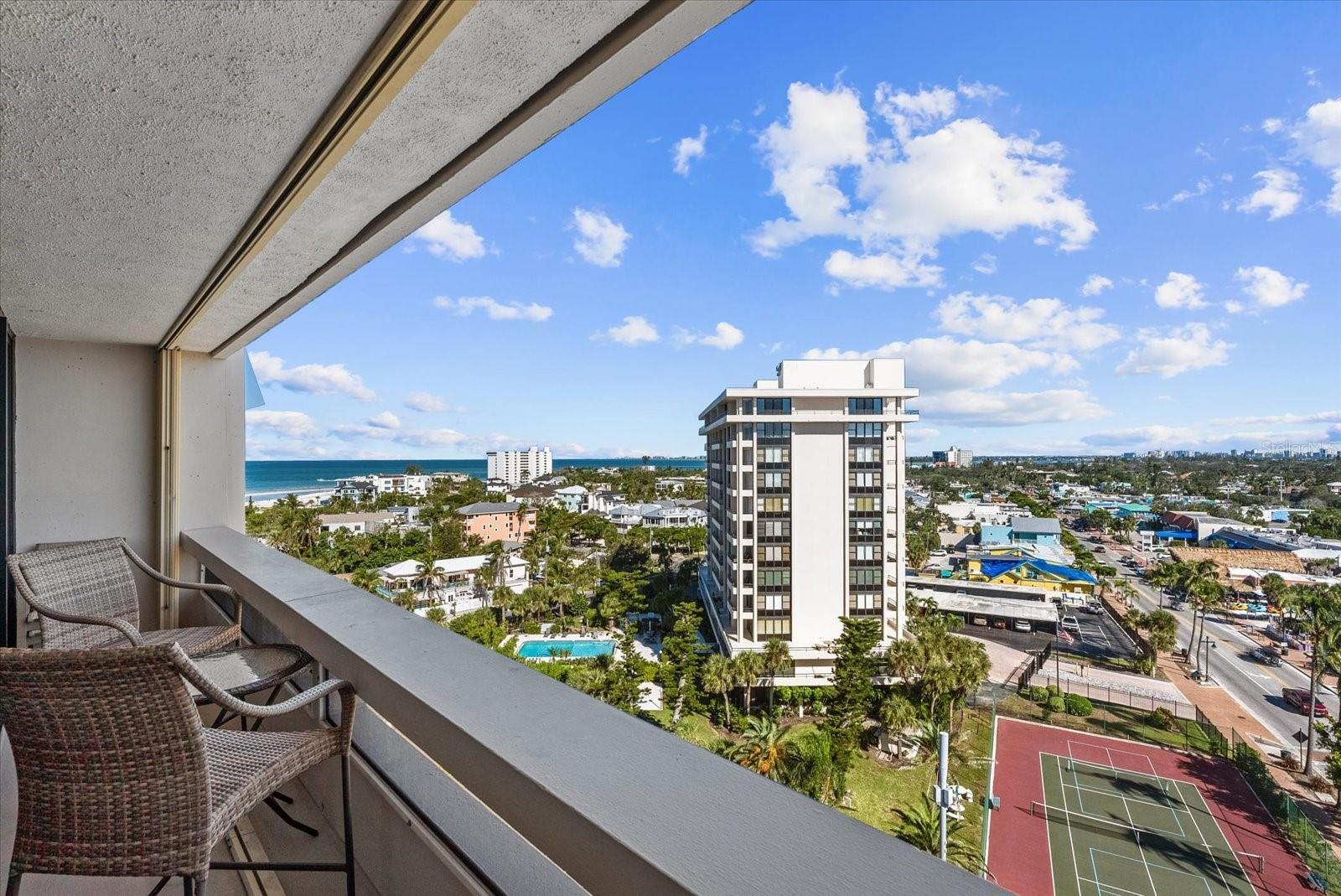 Discover coastal luxury at Beach Terrace, one of Siesta Key's most coveted addresses. Perfectly positioned at the end of the village with direct Gulf of Mexico frontage, this exceptional 1 bedroom, 1 bathroom corner residence offers an unparalleled beachfront lifestyle with breathtaking panoramic views that truly set it apart. This thoughtfully designed condominium showcases sweeping vistas that capture the essence of Florida's Gulf Coast living. From the pristine white sands of Siesta Key Beach to the sparkling aqua waters of the Gulf, and extending to the glittering skyline of downtown Sarasota and even Longboat Key in the distance, the views are simply extraordinary. At night, watch as the twinkling lights of Siesta Key Village and downtown Sarasota create a magical backdrop that makes this easily one of the best views on Siesta Key. One of the standout features of this residence is the three spacious private balconies that provide the perfect vantage points to embrace the coastal lifestyle. Start your morning with coffee while watching the sunrise, unwind with spectacular sunset views in the evening, or simply soak in the panoramic scenery throughout the day. These outdoor spaces are truly an extension of your living area and offer unmatched opportunities to experience the beauty of Siesta Key from every angle. Enter through an inviting tiled foyer that flows seamlessly into the well-appointed kitchen. The generous living area features dual sliding glass doors that flood the space with natural light and frame the expansive views of Siesta Key and the beach beyond. Imagine relaxing on your couch while gazing at the sparkling waters of the Gulf, this is everyday living at Beach Terrace. The dining area offers ample room for entertaining family and friends with gorgeous views. Beach Terrace provides resort-style amenities that complete the coastal living experience. Residents enjoy an elevated heated saltwater pool, a modern fitness center, and a welcoming community room, all just steps from your private beach access. Everything you need for the ultimate Florida lifestyle is right at your doorstep. This is more than just a home; it's a lifestyle. Beach Terrace combines the tranquility of a secluded Gulf-front location with the convenience of being nestled at the end of the charming Siesta Key Village. Location, location, location! Don't miss this rare opportunity to own a piece of paradise in one of Florida's most desirable beach communities, where stunning views and coastal elegance come together in perfect harmony.