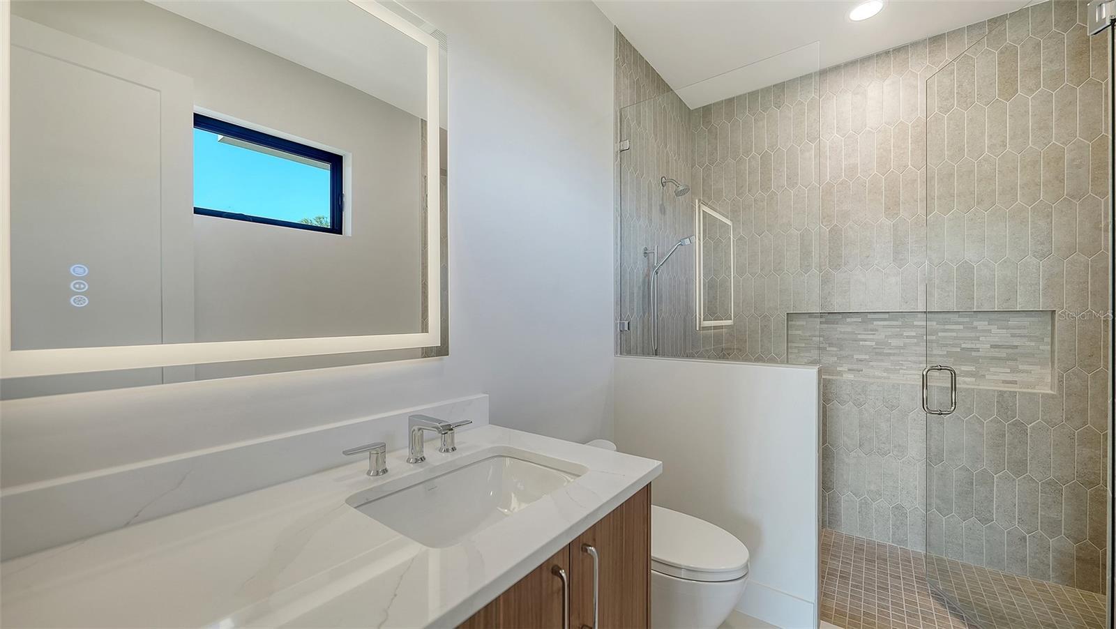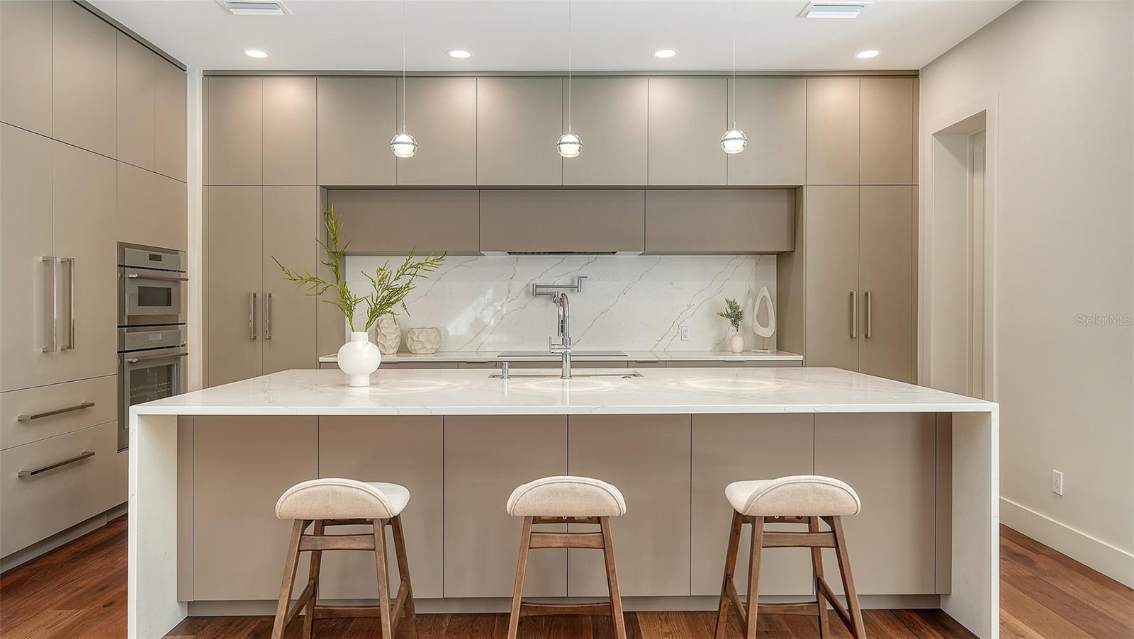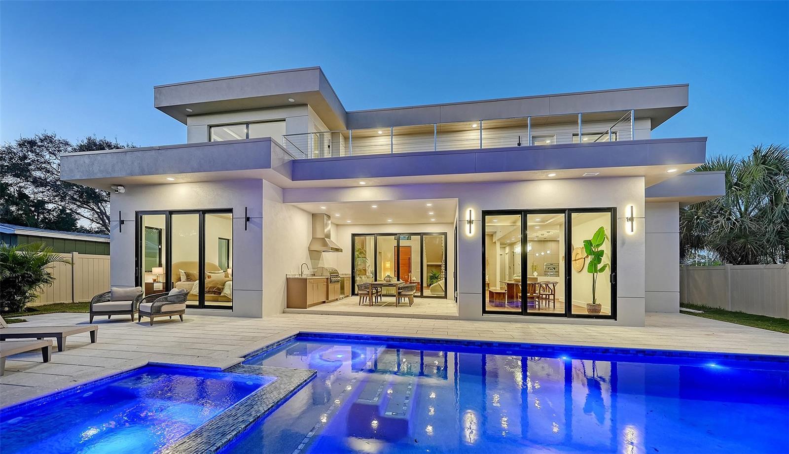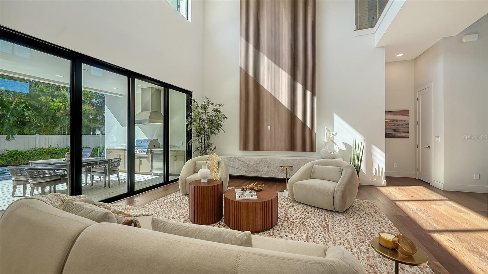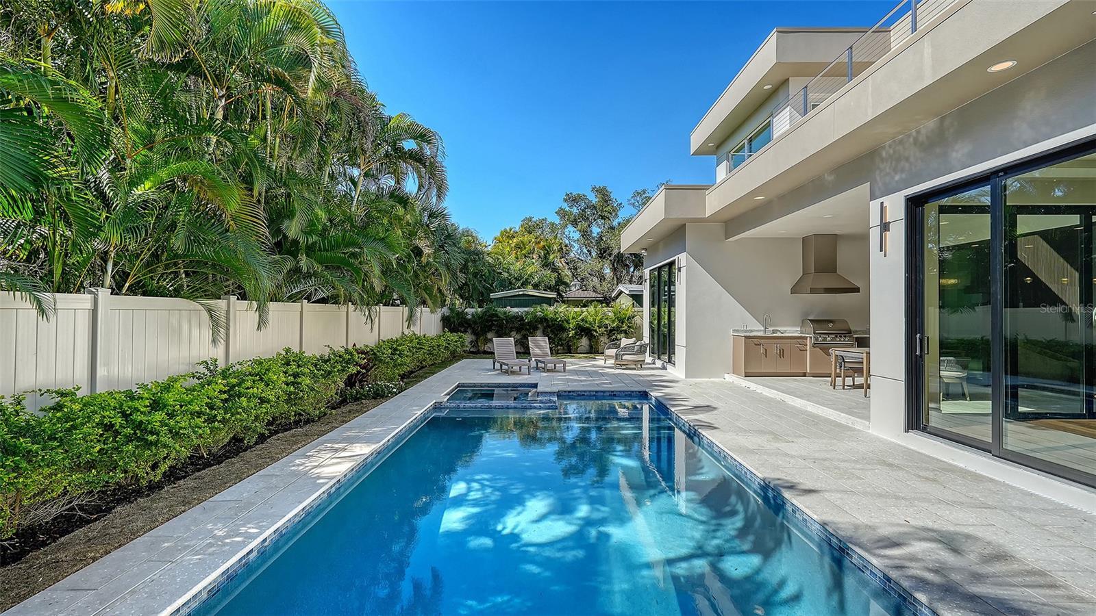Set within the coveted West of the Trail enclave, this newly constructed estate is a striking statement of contemporary design and quality craftsmanship. Thoughtfully designed with clean architectural lines and seamless indoor-outdoor flow. Exceptional attention to detail throughout the residence with 4-bedrooms + office/den + bonus loft and 6-bathrooms. European engineered hardwood and porcelain tile flooring, 9-foot interior doors, recessed ceilings and lighting, and a Level 5 wall finish. PGT impact-resistant, Low-E windows and expansive sliding glass doors flood the interiors with natural light. The open-concept great room is a dramatic focal point, featuring a soaring double-height ceiling and a striking slatted wood accent wall. State-of-the-art kitchen with premium Thermador appliance package, custom Studio Luxe cabinetry by Miralis, quartz countertops, and a waterfall island with designer breakfast bar seating. Opening seamlessly to the dining area and covered lanai, creating an ideal setting for entertaining. Large walk-in pantry, dedicated laundry room with Electrolux washer and dryer, elevator-ready storage space, and private office ensure everyday convenience is met with elegance. The main-level primary suite serves as a private retreat, featuring a spa-inspired bathroom and professionally designed, boutique-style custom closet. The second level offers three en-suite bedrooms, each with beautifully finished bathrooms and walk-in closets. Bathrooms are appointed with quartz countertops, LED mirrors, frameless glass shower enclosures, designer tilework, multiple shower heads, built-in niches, and integrated bench seating. A spacious loft lounge includes a wet bar with beverage refrigerator. Two expansive balconies provide additional space for relaxation or entertaining. Enjoy serene moments by the heated saltwater pool and integrated spa, covered lanai with summer kitchen, including grill, sink and refrigerator, and a dedicated poolside half bath. The backyard is fully enclosed with a six-foot privacy fence and includes green space suitable for pets or gardening. The pool area is screen-enclosure ready for year-round enjoyment. Ideally located just minutes from downtown Sarasota, top-rated schools, dining, shopping, and cultural attractions, this exceptional residence offers a rare opportunity to enjoy sophisticated West of Trail living with uncompromising design integrity and quality. Offering a one-year full developer warranty.