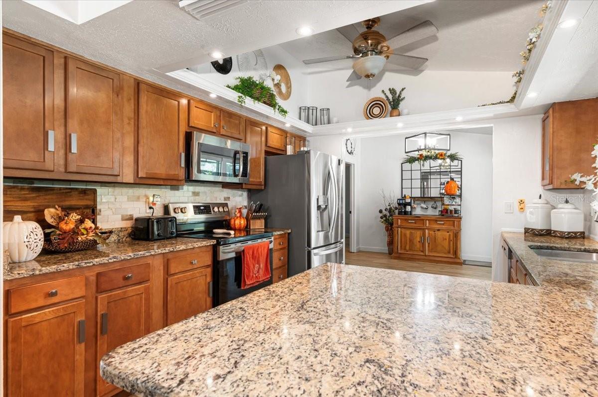 - Ceiling Fans(s), Eat-in Kitchen, Open Floorplan, Primary Bedroom Main Floor, Solid Surface Counters, Solid Wood Cabinets, Split Bedroom, Stone Counters, Thermostat, Walk-In Closet(s), Window Treatments