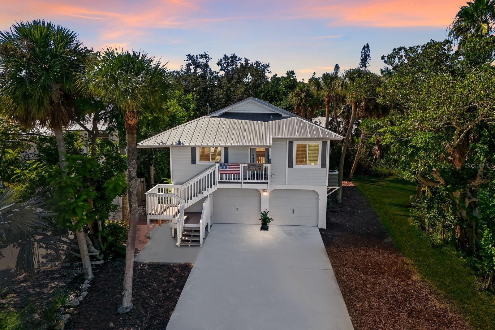 Experience the best of island living in this beautifully maintained Turnkey FULLY FURNISHED, Key West-style home just moments from Siesta Key Public Beach and the vibrant Siesta Village. Offering 3 bedrooms, 2 bathrooms, and a 2-car garage with brand-new doors, this residence has been thoughtfully updated over the years with major recent improvements including a 2023 metal roof and all-new impact glass windows and doors for peace of mind. Head upstairs to the main living level where an open-concept layout welcomes you with luxury vinyl plank flooring, vaulted ceilings, and plantation shutters that fill the space with natural light. The kitchen features stainless steel appliances only a few years old, granite countertops, and a convenient connection to the dining area—ideal for hosting friends and family. Each bedroom showcases plantation shutters and crown molding for added charm. The primary suite is a true retreat, complete with a walk-in closet with built-in organization, an ensuite bathroom with a glass-enclosed shower tucked behind a stylish barn door, and direct access to the backyard deck through sliding glass doors. The two guest bedrooms share a tastefully updated full bathroom. Step outside to the elevated deck overlooking the private backyard, where a cozy fire pit area awaits in the corner—perfect for evening conversations and coastal breezes. An outdoor shower is the perfect spot to rinse off after a long day at the beach. Whether you’re seeking a full-time residence or the ideal vacation getaway, the flexibility of no HOA allows you to live as you please. Located just down the road from the powdery white sands of world-renowned Siesta Beach and only a half mile from the charming shops and restaurants of Siesta Village, this home delivers the quintessential Siesta Key lifestyle.