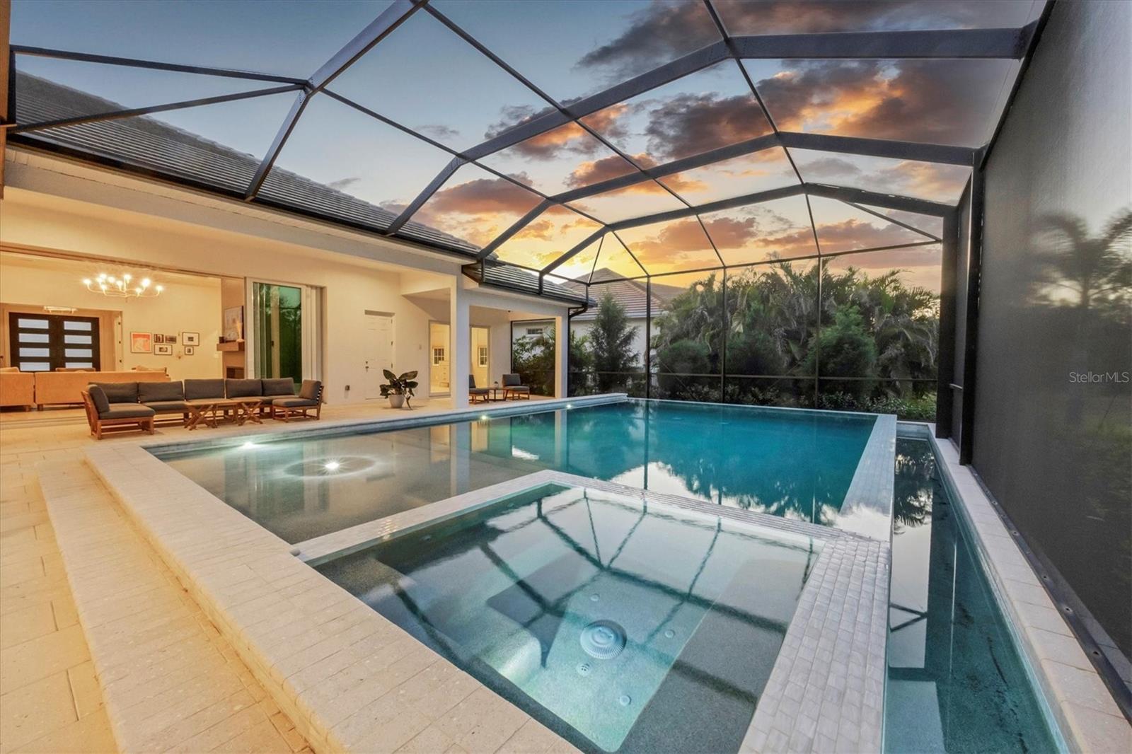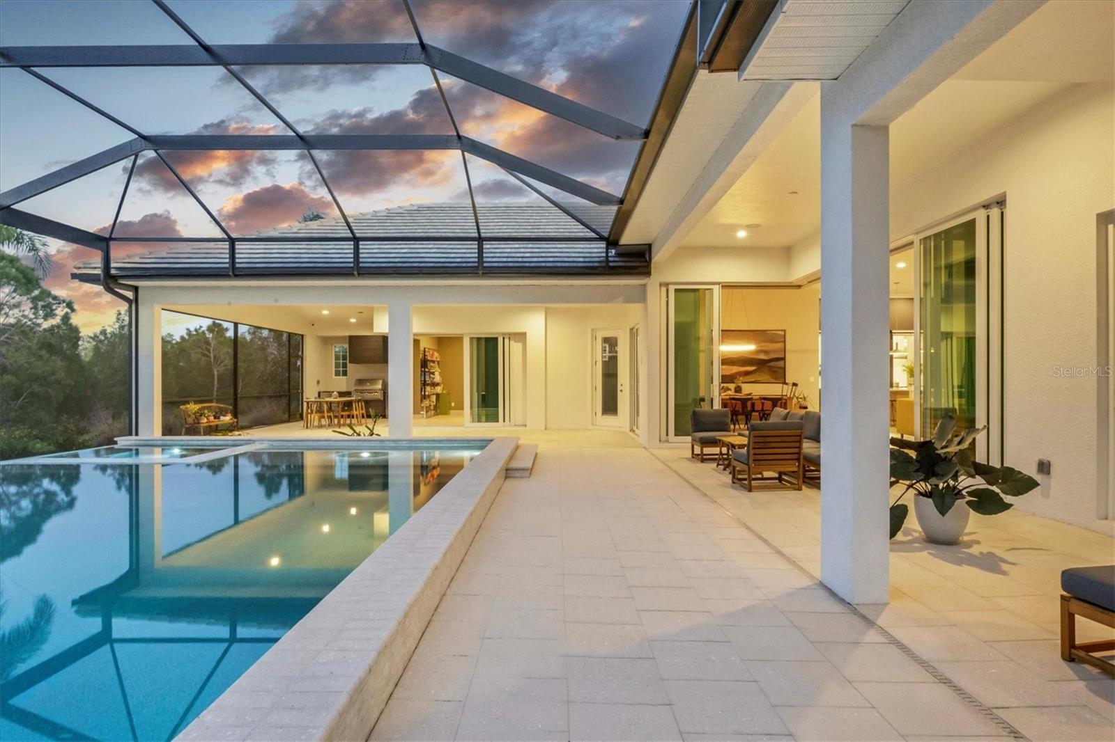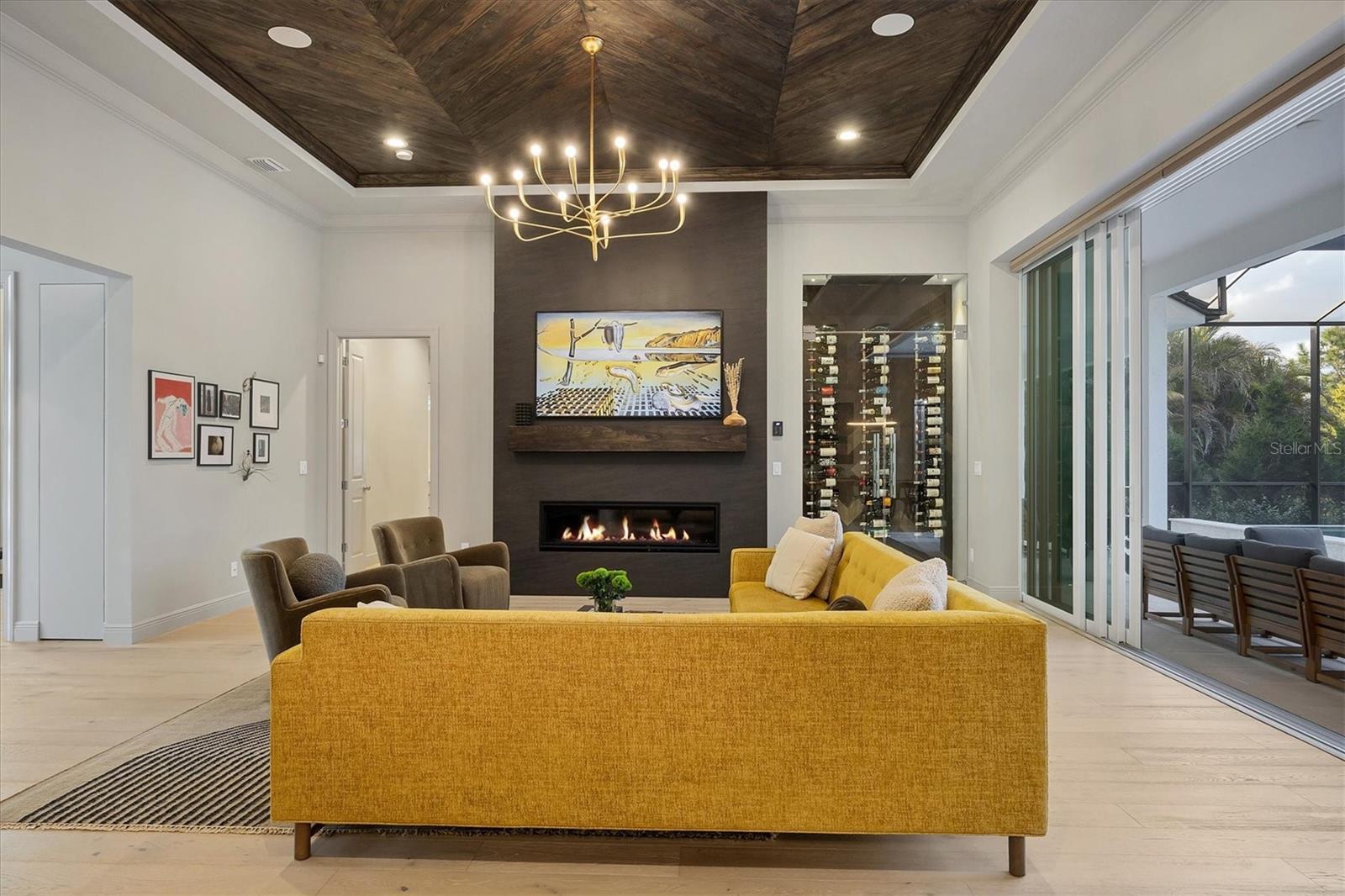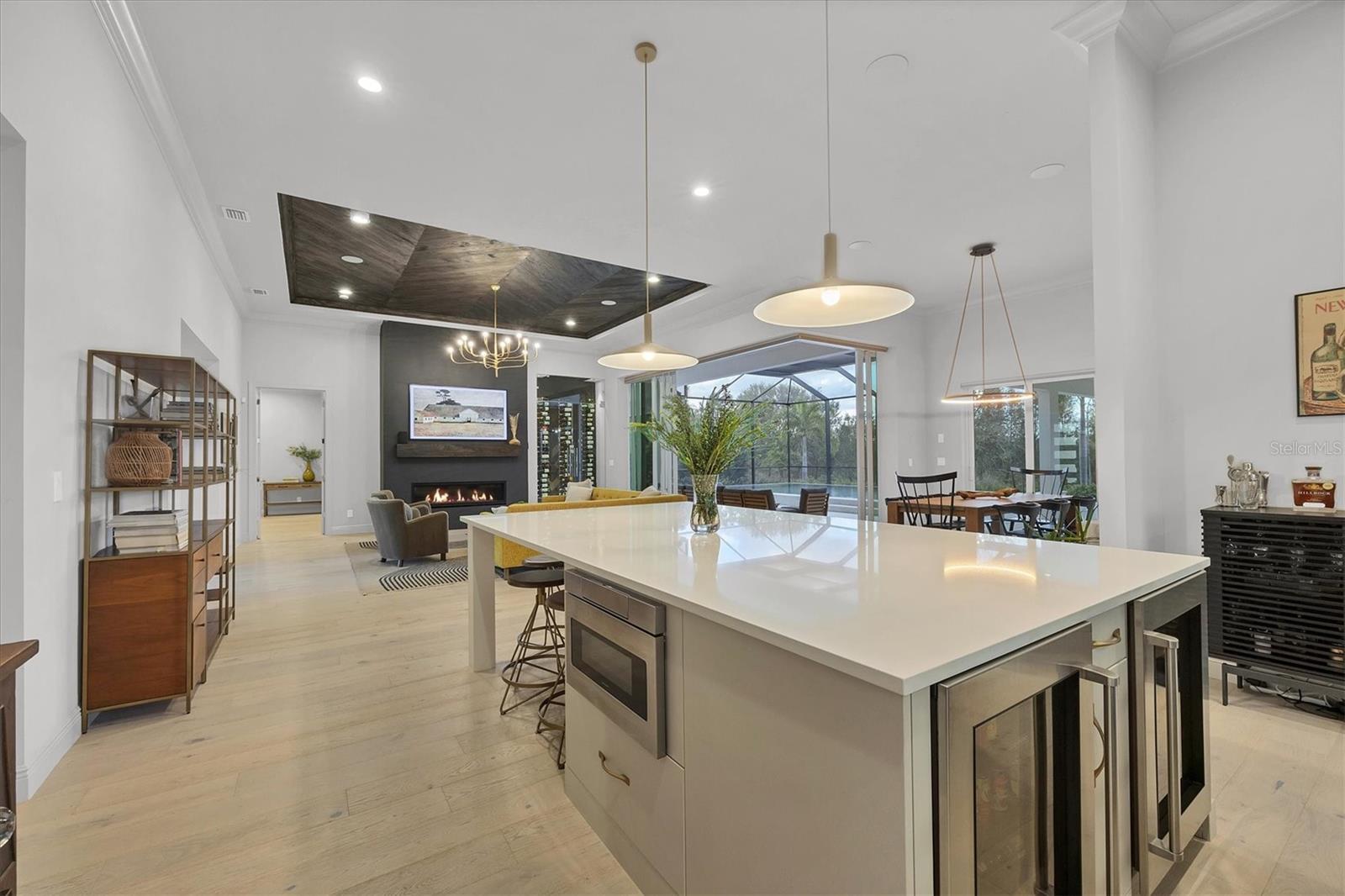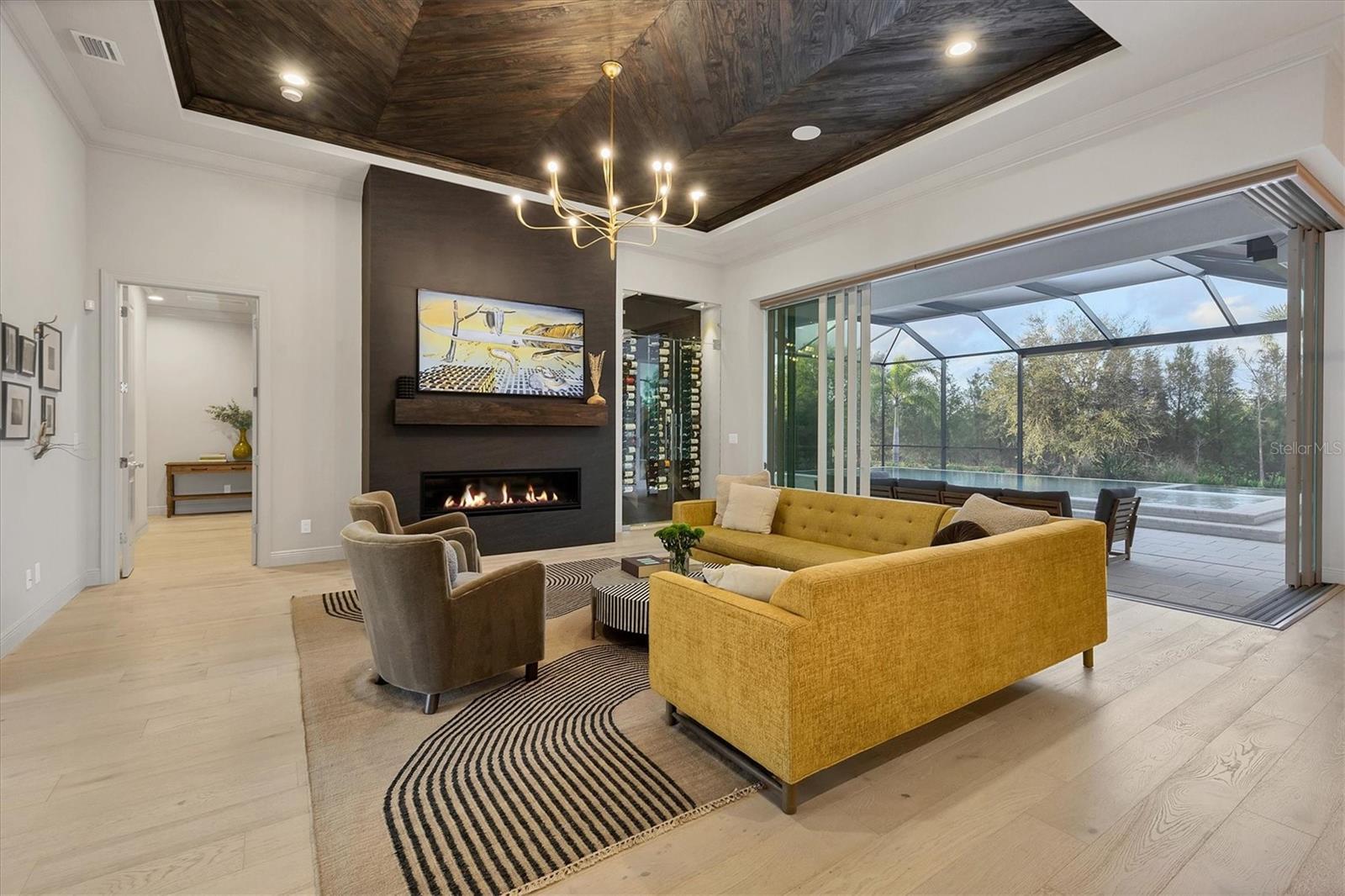 On a quiet preserve in the exclusive gated enclave of Country Club East, this exceptional John Cannon residence showcases refined craftsmanship, modern luxury, and seamless indoor-outdoor living. Designed for comfort and impact, the home features impact-rated windows and doors, a full-house generator, and an open layout that’s as functional as it is beautiful. Enter through 10-foot iron and glass double doors into a dramatic great room with whitewashed European oak flooring, soaring 13-foot ceilings with chevron wood detail, and a striking natural gas fireplace framed by Basalt volcanic tile and reclaimed wood mantle. A custom Whisperkool wine wall holds up to 130 bottles, accented by a chevron Stickwood backdrop. The main foyer features a hidden closet for bags and shoes. The chef’s kitchen boasts Sub-Zero and Wolf appliances, a six-burner range, built-in oven and microwave, quartz countertops, a prep island outfitted with pullout drawers, two for spices, a farmhouse sink and a standalone ice maker. An entertaining-sized island outside the kitchen features Sub-Zero beverage and wine coolers, an additional microwave and ample hidden storage. A spacious walk-in pantry is nearby and includes a built-in tall closet. The great room’s 10-foot sliders fold back into a disappearing corner and lead to the expansive lanai with a PebbleTec infinity-edge heated saltwater pool and spa, panoramic screen enclosure, Shell Lock pavers and a fully outfitted summer kitchen with Alfresco grill, Trailwinds hood, True ice machine, Uline refrigerator and Blanco sink. The private owner’s wing includes two walk-in closets, tray ceiling with crown molding, lanai access, and a spa-style bath with radiant heated floors and a steam shower. Two guest suites are positioned in separate wings, each with its full bath and walk-in closet, one with a private entrance and drop zone, the other with pool bath access. Additional living spaces include a bonus room with 10-foot sliders as a second disappearing corner as well as a study/exercise room with 15-foot ceilings. The laundry room features abundant cabinet storage, designer tile, sink and an additional 60 square feet of dedicated storage carved out behind two double doors. Adding even more value, the home is equipped with a whole-house water filtration system, designer lighting, automatic blinds and an oversized three-car garage. Every detail of this home has been thoughtfully curated for elevated living in one of Lakewood Ranch’s prestigious communities.