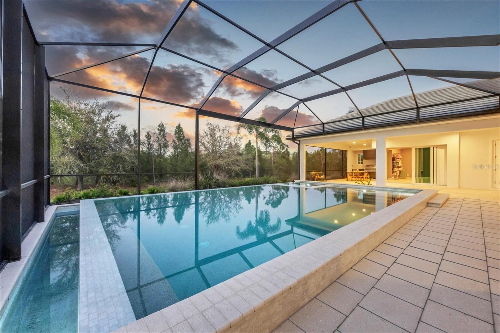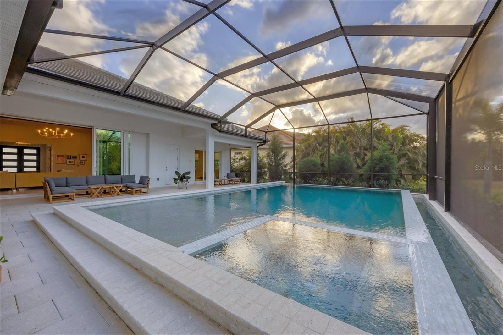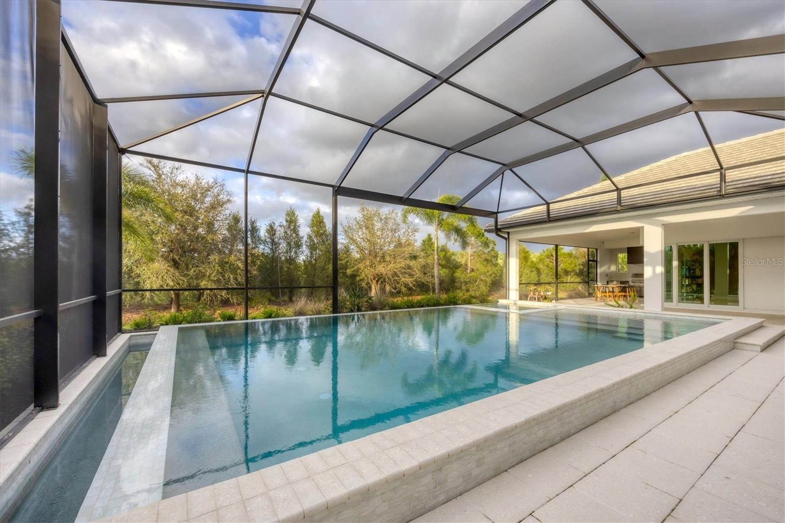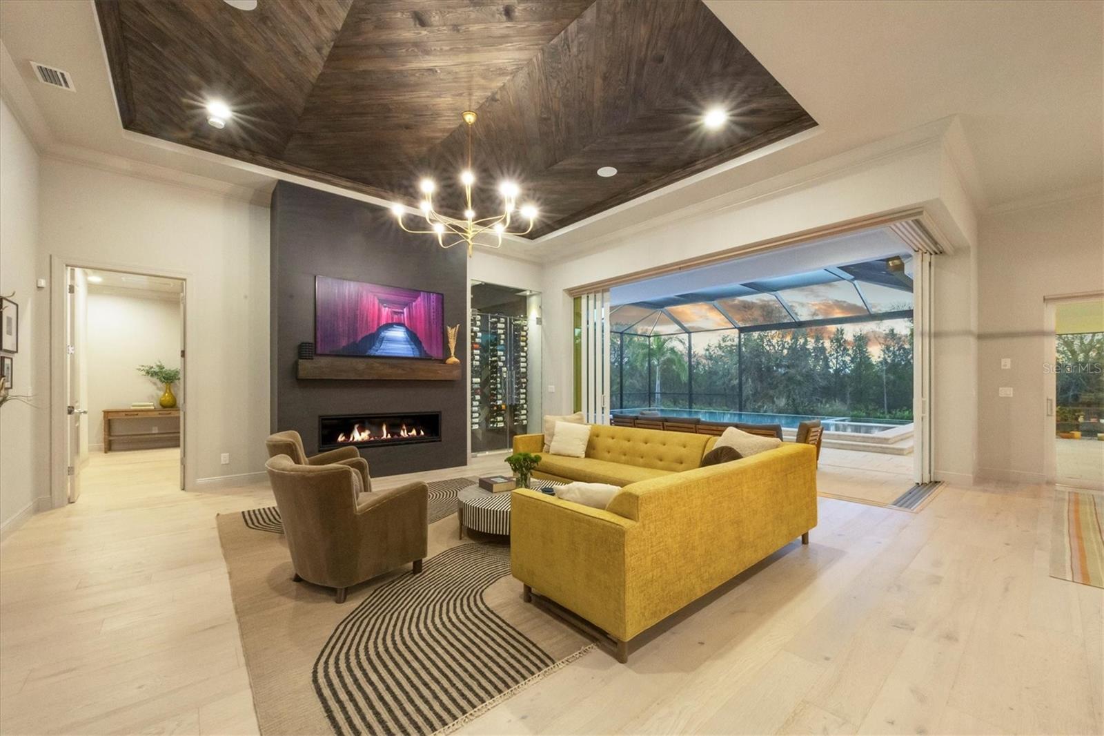 On a quiet preserve in the exclusive gated enclave of Country Club East, this exceptional John Cannon residence showcases refined craftsmanship, modern luxury, and seamless indoor-outdoor living. Designed for comfort and impact, the home features impact-rated windows and doors, a full-house generator, and an open layout that’s as functional as it is beautiful. Enter through 10-foot iron and glass double doors into a dramatic great room with whitewashed European oak flooring, soaring 13-foot ceilings with chevron wood detail, and a striking natural gas fireplace framed by Basalt volcanic tile and reclaimed wood mantle. A custom Whisperkool wine wall holds up to 130 bottles, accented by a chevron Stickwood backdrop. The main foyer features a hidden closet for bags and shoes. The chef’s kitchen boasts Sub-Zero and Wolf appliances, a six-burner range, built-in oven and microwave, quartz countertops, a prep island outfitted with pullout drawers, two for spices, a farmhouse sink and a standalone ice maker. An entertaining-sized island outside the kitchen features Sub-Zero beverage and wine coolers, an additional microwave and ample hidden storage. A spacious walk-in pantry is nearby and includes a built-in tall closet. The great room’s 10-foot sliders fold back into a disappearing corner and lead to the expansive lanai with a PebbleTec infinity-edge heated saltwater pool and spa, panoramic screen enclosure, Shell Lock pavers and a fully outfitted summer kitchen with Alfresco grill, Trailwinds hood, True ice machine, Uline refrigerator and Blanco sink. The private owner’s wing includes two walk-in closets, tray ceiling with crown molding, lanai access, and a spa-style bath with radiant heated floors and a steam shower. Two guest suites are positioned in separate wings, each with its full bath and walk-in closet, one with a private entrance and drop zone, the other with pool bath access. Additional living spaces include a bonus room with 10-foot sliders as a second disappearing corner as well as a study/exercise room with 15-foot ceilings. The laundry room features abundant cabinet storage, designer tile, sink and an additional 60 square feet of dedicated storage carved out behind two double doors. Adding even more value, the home is equipped with a whole-house water filtration system, designer lighting, automatic blinds and an oversized three-car garage. Every detail of this home has been thoughtfully curated for elevated living in one of Lakewood Ranch’s prestigious communities.