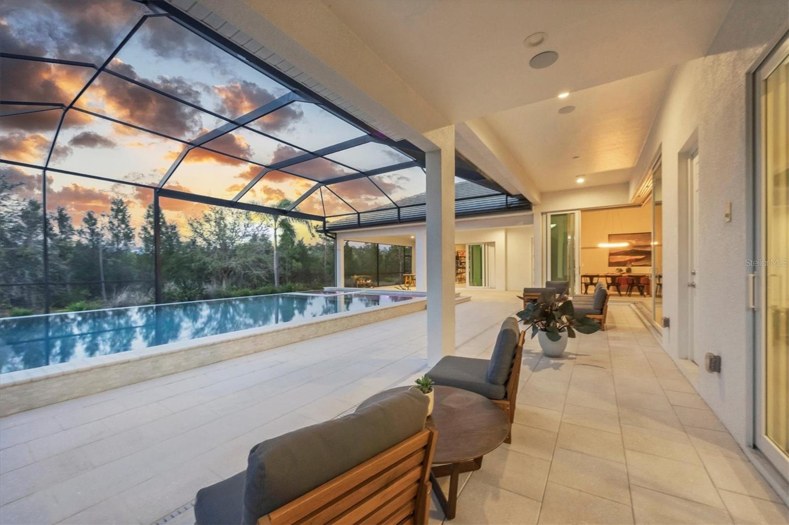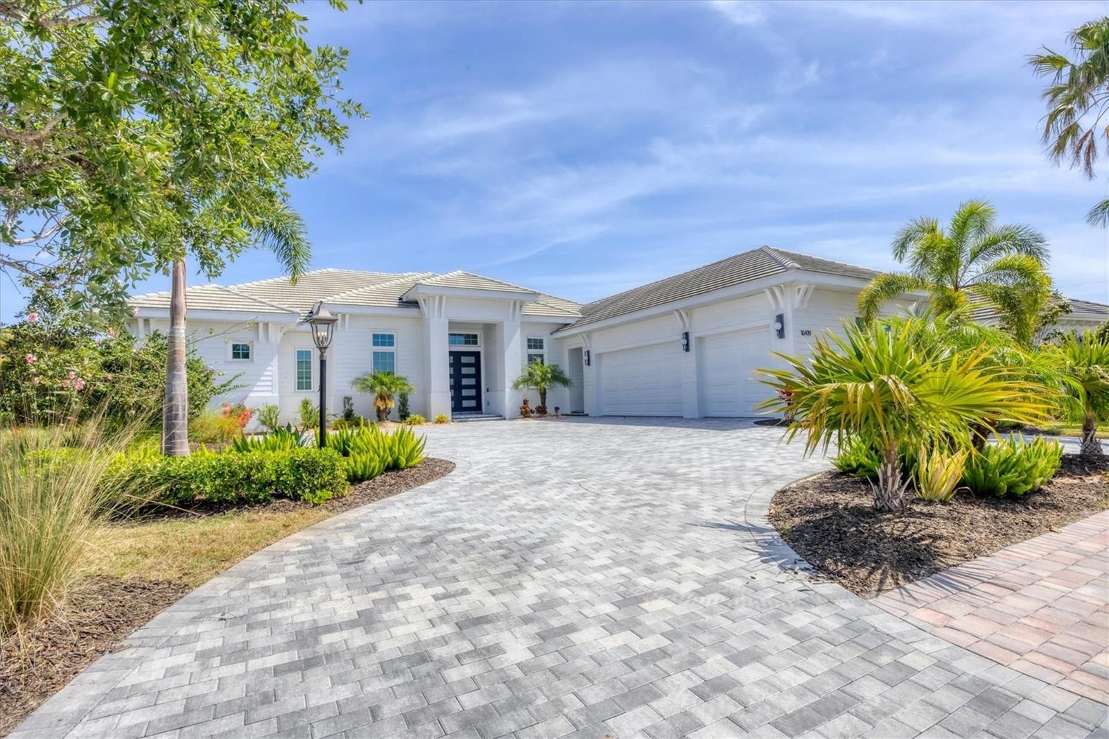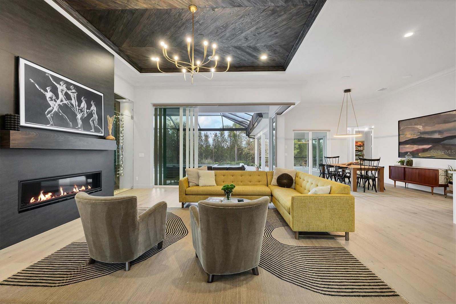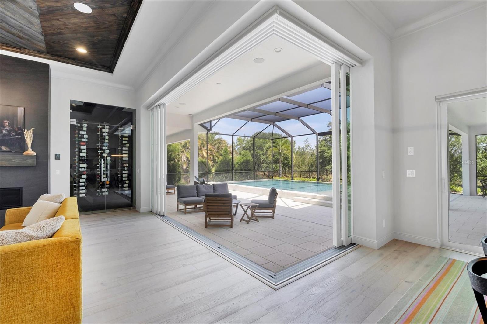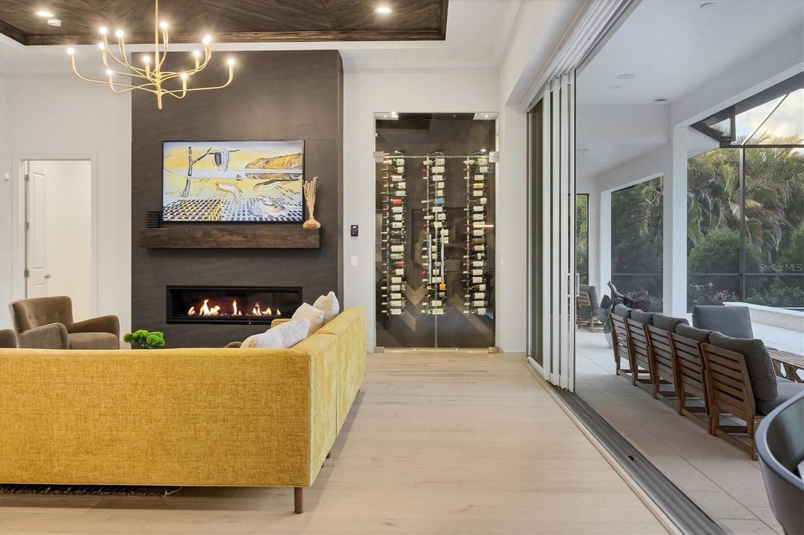 On a quiet preserve in the exclusive gated enclave of Country Club East, this exceptional John Cannon residence showcases refined craftsmanship, modern luxury, and seamless indoor-outdoor living. Designed for comfort and impact, the home features impact-rated windows and doors, a full-house generator, and an open layout that’s as functional as it is beautiful. Enter through 10-foot iron and glass double doors into a dramatic great room with whitewashed European oak flooring, soaring 13-foot ceilings with chevron wood detail, and a striking natural gas fireplace framed by Basalt volcanic tile and reclaimed wood mantle. A custom Whisperkool wine wall holds up to 130 bottles, accented by a chevron Stickwood backdrop. The main foyer features a hidden closet for bags and shoes. The chef’s kitchen boasts Sub-Zero and Wolf appliances, a six-burner range, built-in oven and microwave, quartz countertops, a prep island outfitted with pullout drawers, two for spices, a farmhouse sink and a standalone ice maker. An entertaining-sized island outside the kitchen features Sub-Zero beverage and wine coolers, an additional microwave and ample hidden storage. A spacious walk-in pantry is nearby and includes a built-in tall closet. The great room’s 10-foot sliders fold back into a disappearing corner and lead to the expansive lanai with a PebbleTec infinity-edge heated saltwater pool and spa, panoramic screen enclosure, Shell Lock pavers and a fully outfitted summer kitchen with Alfresco grill, Trailwinds hood, True ice machine, Uline refrigerator and Blanco sink. The private owner’s wing includes two walk-in closets, tray ceiling with crown molding, lanai access, and a spa-style bath with radiant heated floors and a steam shower. Two guest suites are positioned in separate wings, each with its full bath and walk-in closet, one with a private entrance and drop zone, the other with pool bath access. Additional living spaces include a bonus room with 10-foot sliders as a second disappearing corner as well as a study/exercise room with 15-foot ceilings. The laundry room features abundant cabinet storage, designer tile, sink and an additional 60 square feet of dedicated storage carved out behind two double doors. Adding even more value, the home is equipped with a whole-house water filtration system, designer lighting, automatic blinds and an oversized three-car garage. Every detail of this home has been thoughtfully curated for elevated living in one of Lakewood Ranch’s prestigious communities.