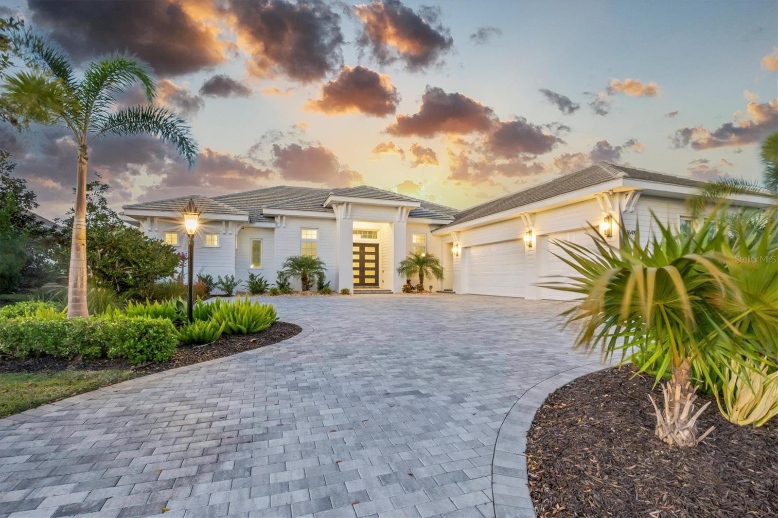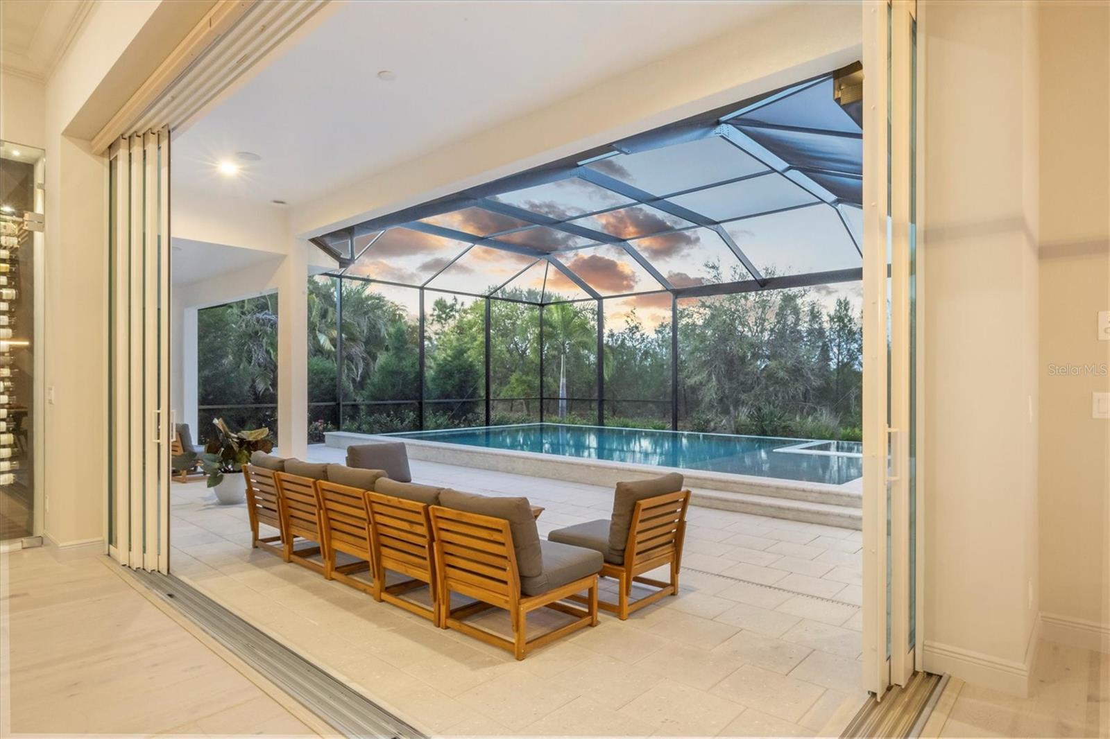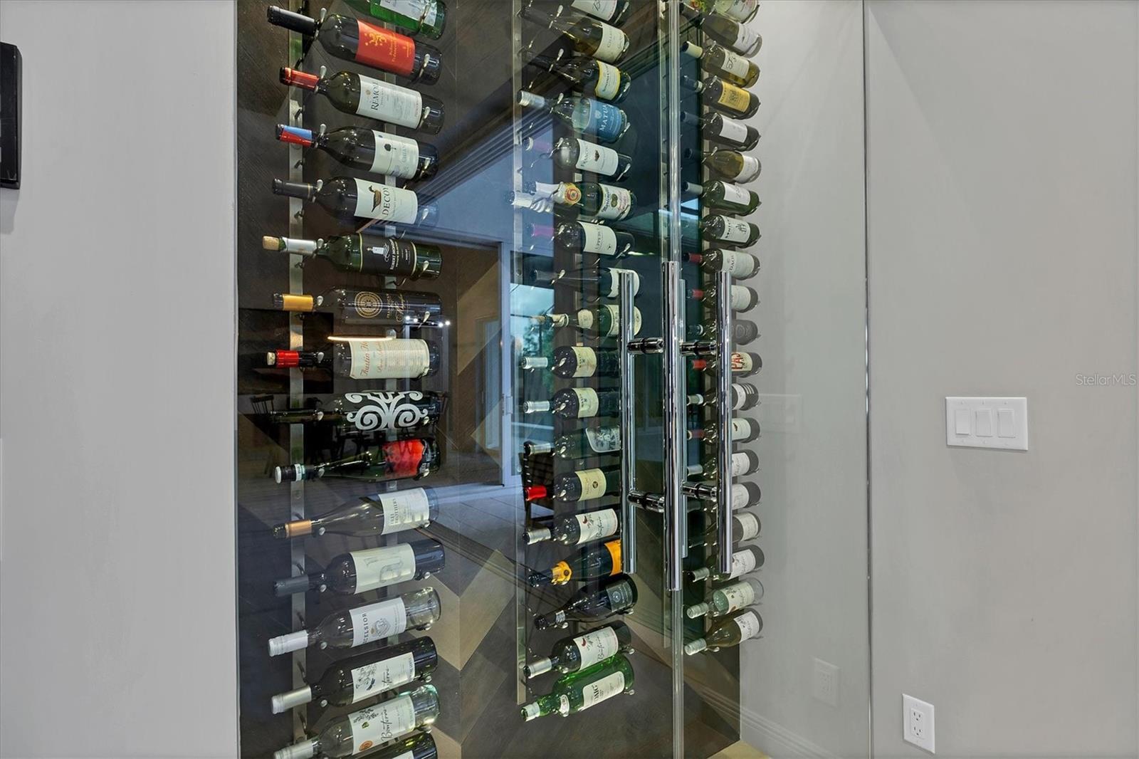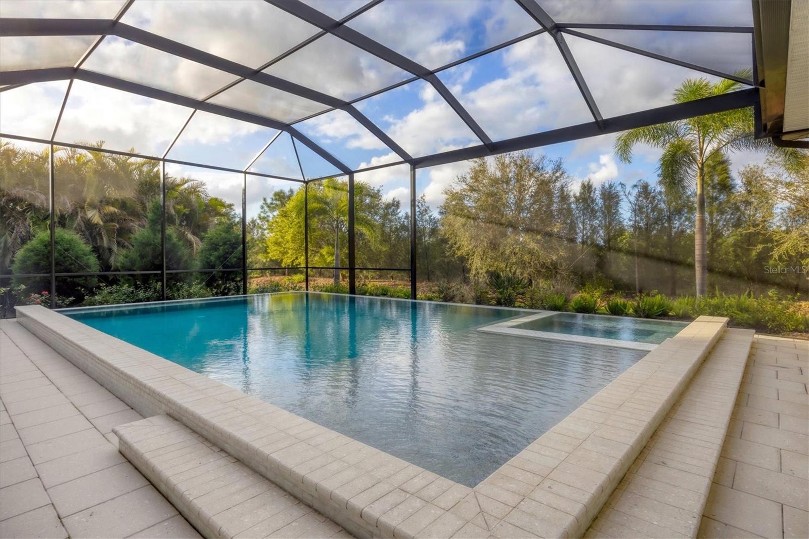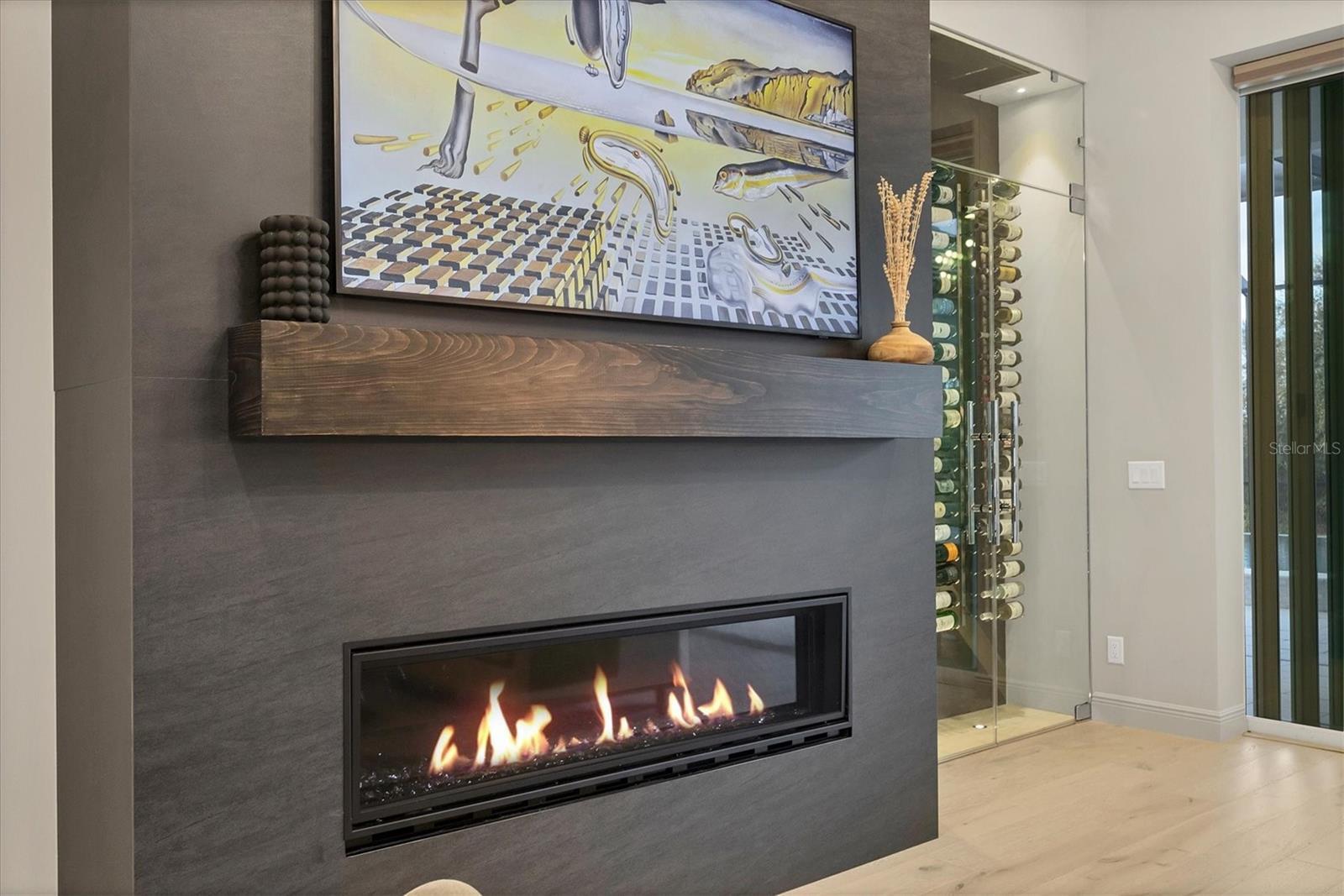 On a quiet preserve in the exclusive gated enclave of Country Club East, this exceptional John Cannon residence showcases refined craftsmanship, modern luxury, and seamless indoor-outdoor living. Designed for comfort and impact, the home features impact-rated windows and doors, a full-house generator, and an open layout that’s as functional as it is beautiful. Enter through 10-foot iron and glass double doors into a dramatic great room with whitewashed European oak flooring, soaring 13-foot ceilings with chevron wood detail, and a striking natural gas fireplace framed by Basalt volcanic tile and reclaimed wood mantle. A custom Whisperkool wine wall holds up to 130 bottles, accented by a chevron Stickwood backdrop. The main foyer features a hidden closet for bags and shoes. The chef’s kitchen boasts Sub-Zero and Wolf appliances, a six-burner range, built-in oven and microwave, quartz countertops, a prep island outfitted with pullout drawers, two for spices, a farmhouse sink and a standalone ice maker. An entertaining-sized island outside the kitchen features Sub-Zero beverage and wine coolers, an additional microwave and ample hidden storage. A spacious walk-in pantry is nearby and includes a built-in tall closet. The great room’s 10-foot sliders fold back into a disappearing corner and lead to the expansive lanai with a PebbleTec infinity-edge heated saltwater pool and spa, panoramic screen enclosure, Shell Lock pavers and a fully outfitted summer kitchen with Alfresco grill, Trailwinds hood, True ice machine, Uline refrigerator and Blanco sink. The private owner’s wing includes two walk-in closets, tray ceiling with crown molding, lanai access, and a spa-style bath with radiant heated floors and a steam shower. Two guest suites are positioned in separate wings, each with its full bath and walk-in closet, one with a private entrance and drop zone, the other with pool bath access. Additional living spaces include a bonus room with 10-foot sliders as a second disappearing corner as well as a study/exercise room with 15-foot ceilings. The laundry room features abundant cabinet storage, designer tile, sink and an additional 60 square feet of dedicated storage carved out behind two double doors. Adding even more value, the home is equipped with a whole-house water filtration system, designer lighting, automatic blinds and an oversized three-car garage. Every detail of this home has been thoughtfully curated for elevated living in one of Lakewood Ranch’s prestigious communities.