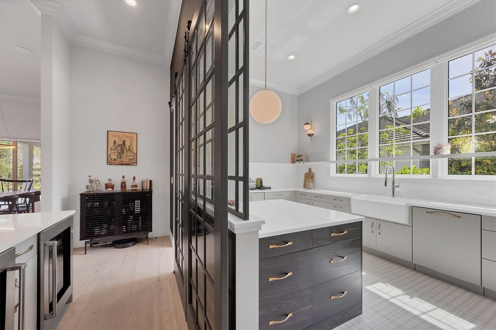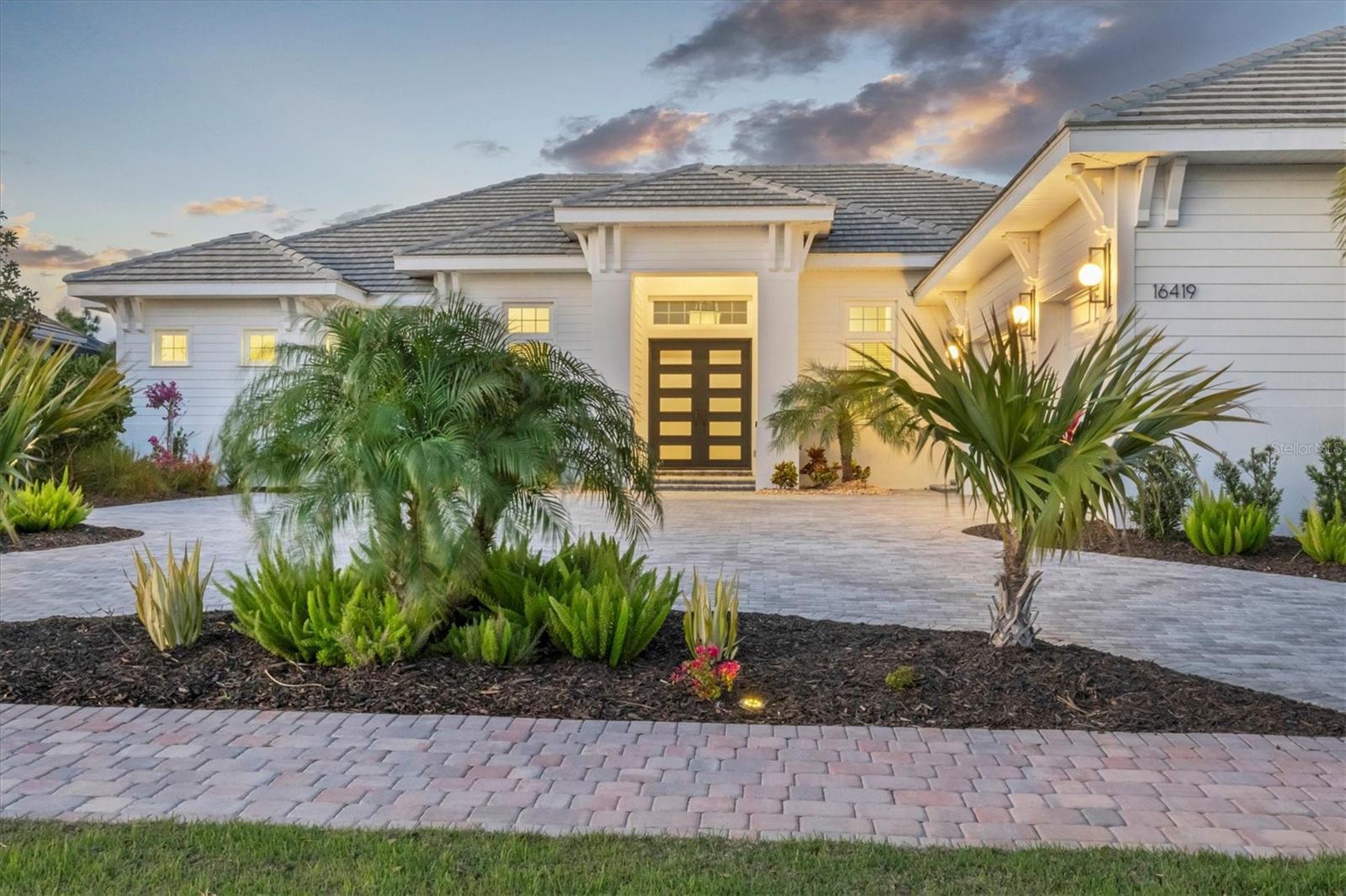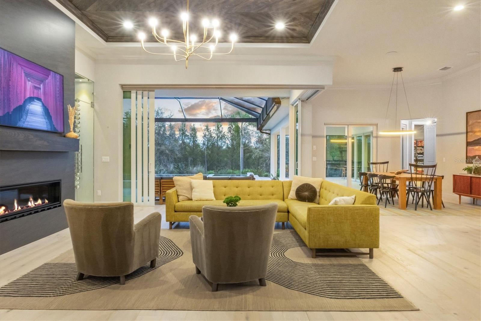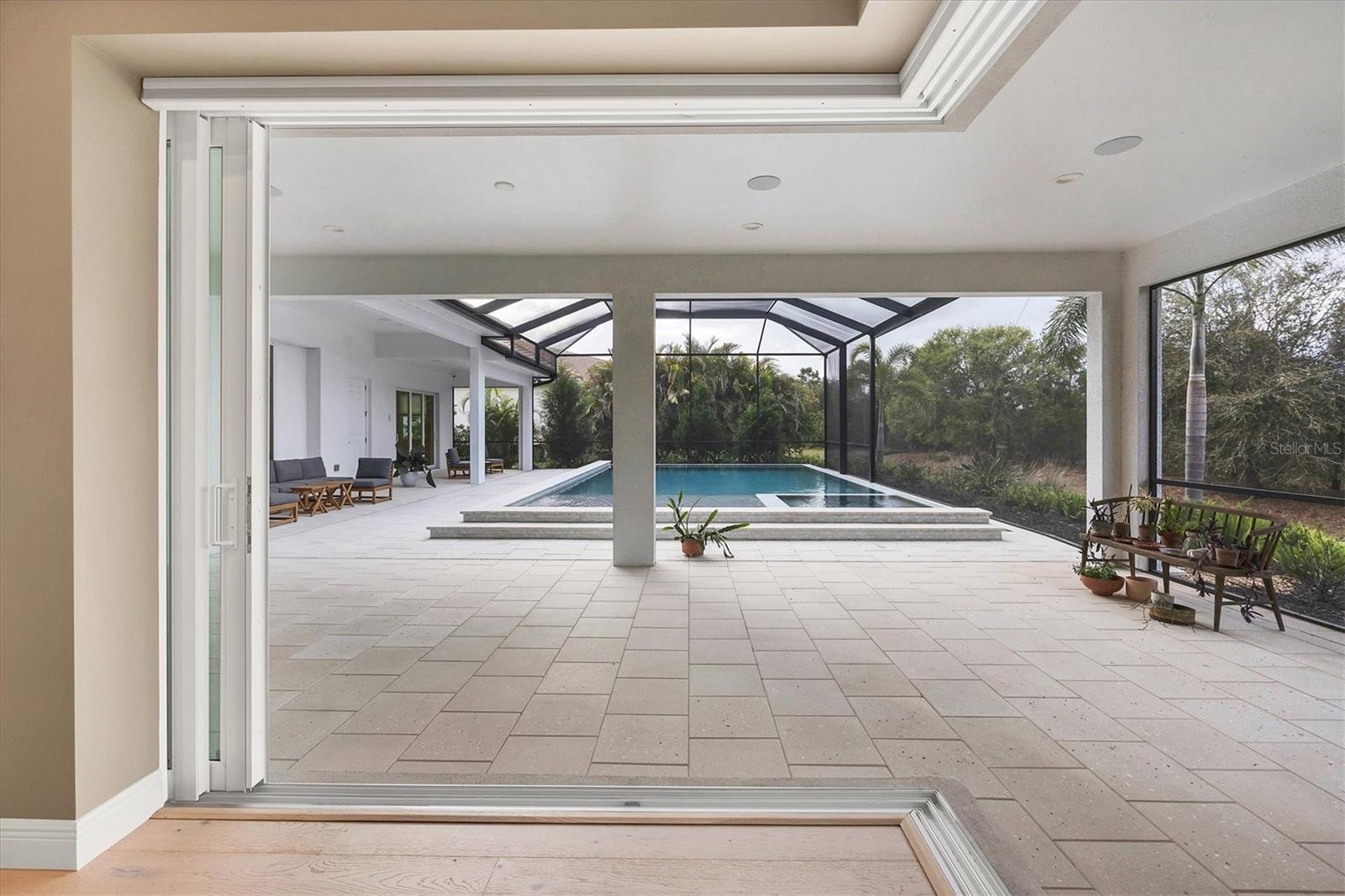 On a quiet preserve in the exclusive gated enclave of Country Club East, this exceptional John Cannon residence showcases refined craftsmanship, modern luxury, and seamless indoor-outdoor living. Designed for comfort and impact, the home features impact-rated windows and doors, a full-house generator, and an open layout that’s as functional as it is beautiful. Enter through 10-foot iron and glass double doors into a dramatic great room with whitewashed European oak flooring, soaring 13-foot ceilings with chevron wood detail, and a striking natural gas fireplace framed by Basalt volcanic tile and reclaimed wood mantle. A custom Whisperkool wine wall holds up to 130 bottles, accented by a chevron Stickwood backdrop. The main foyer features a hidden closet for bags and shoes. The chef’s kitchen boasts Sub-Zero and Wolf appliances, a six-burner range, built-in oven and microwave, quartz countertops, a prep island outfitted with pullout drawers, two for spices, a farmhouse sink and a standalone ice maker. An entertaining-sized island outside the kitchen features Sub-Zero beverage and wine coolers, an additional microwave and ample hidden storage. A spacious walk-in pantry is nearby and includes a built-in tall closet. The great room’s 10-foot sliders fold back into a disappearing corner and lead to the expansive lanai with a PebbleTec infinity-edge heated saltwater pool and spa, panoramic screen enclosure, Shell Lock pavers and a fully outfitted summer kitchen with Alfresco grill, Trailwinds hood, True ice machine, Uline refrigerator and Blanco sink. The private owner’s wing includes two walk-in closets, tray ceiling with crown molding, lanai access, and a spa-style bath with radiant heated floors and a steam shower. Two guest suites are positioned in separate wings, each with its full bath and walk-in closet, one with a private entrance and drop zone, the other with pool bath access. Additional living spaces include a bonus room with 10-foot sliders as a second disappearing corner as well as a study/exercise room with 15-foot ceilings. The laundry room features abundant cabinet storage, designer tile, sink and an additional 60 square feet of dedicated storage carved out behind two double doors. Adding even more value, the home is equipped with a whole-house water filtration system, designer lighting, automatic blinds and an oversized three-car garage. Every detail of this home has been thoughtfully curated for elevated living in one of Lakewood Ranch’s prestigious communities.
