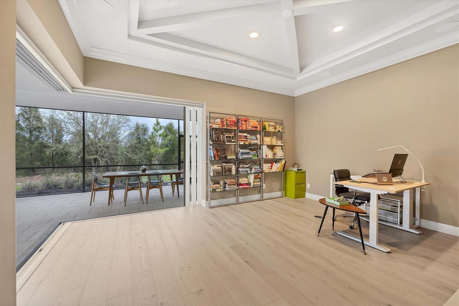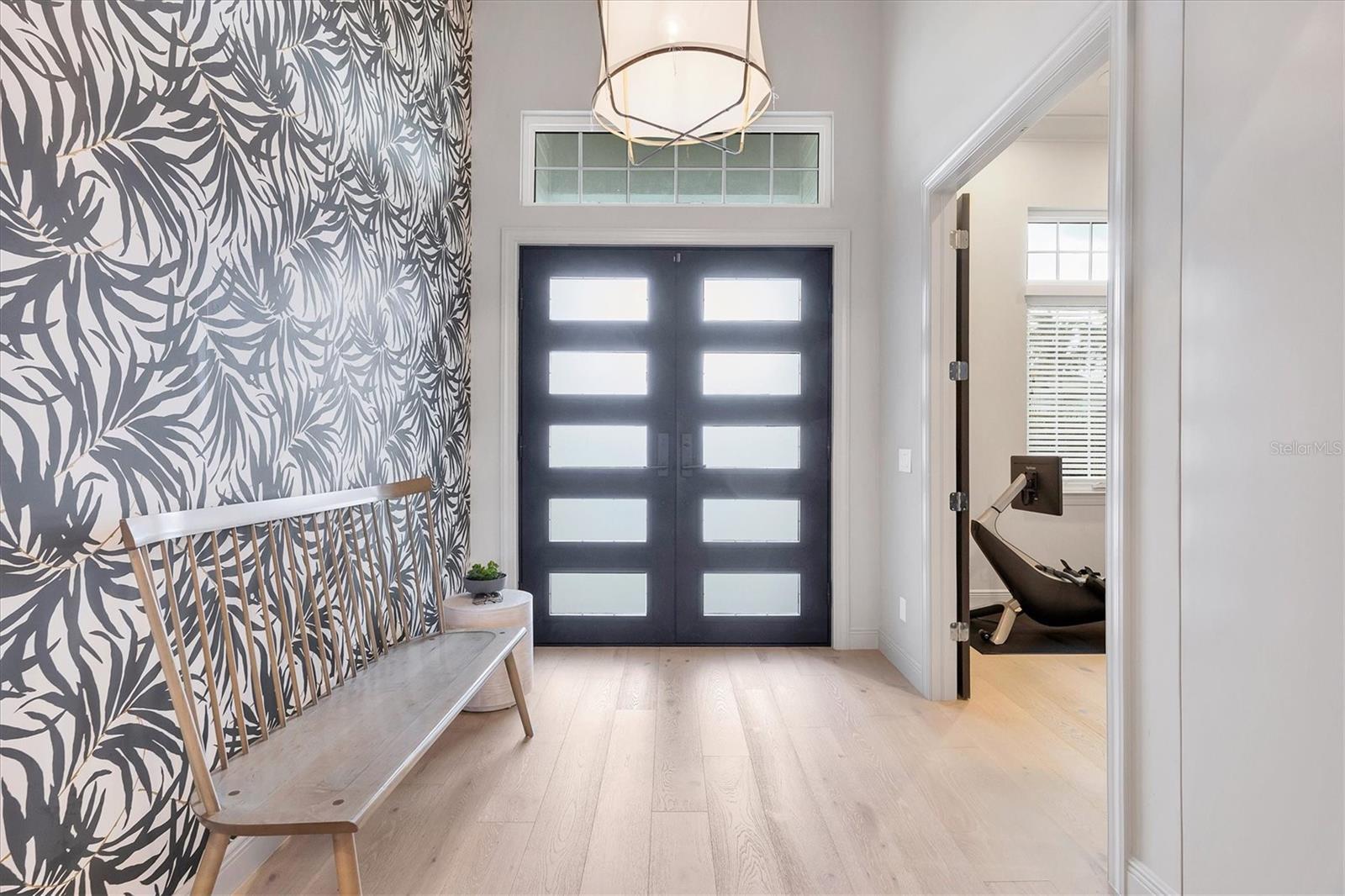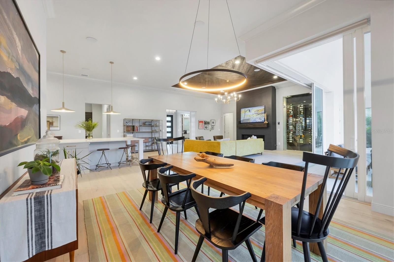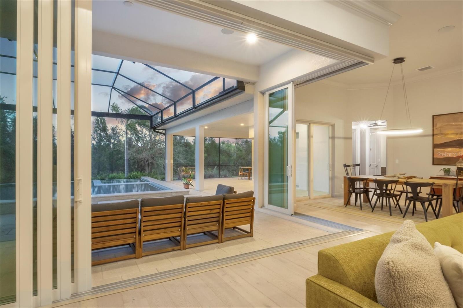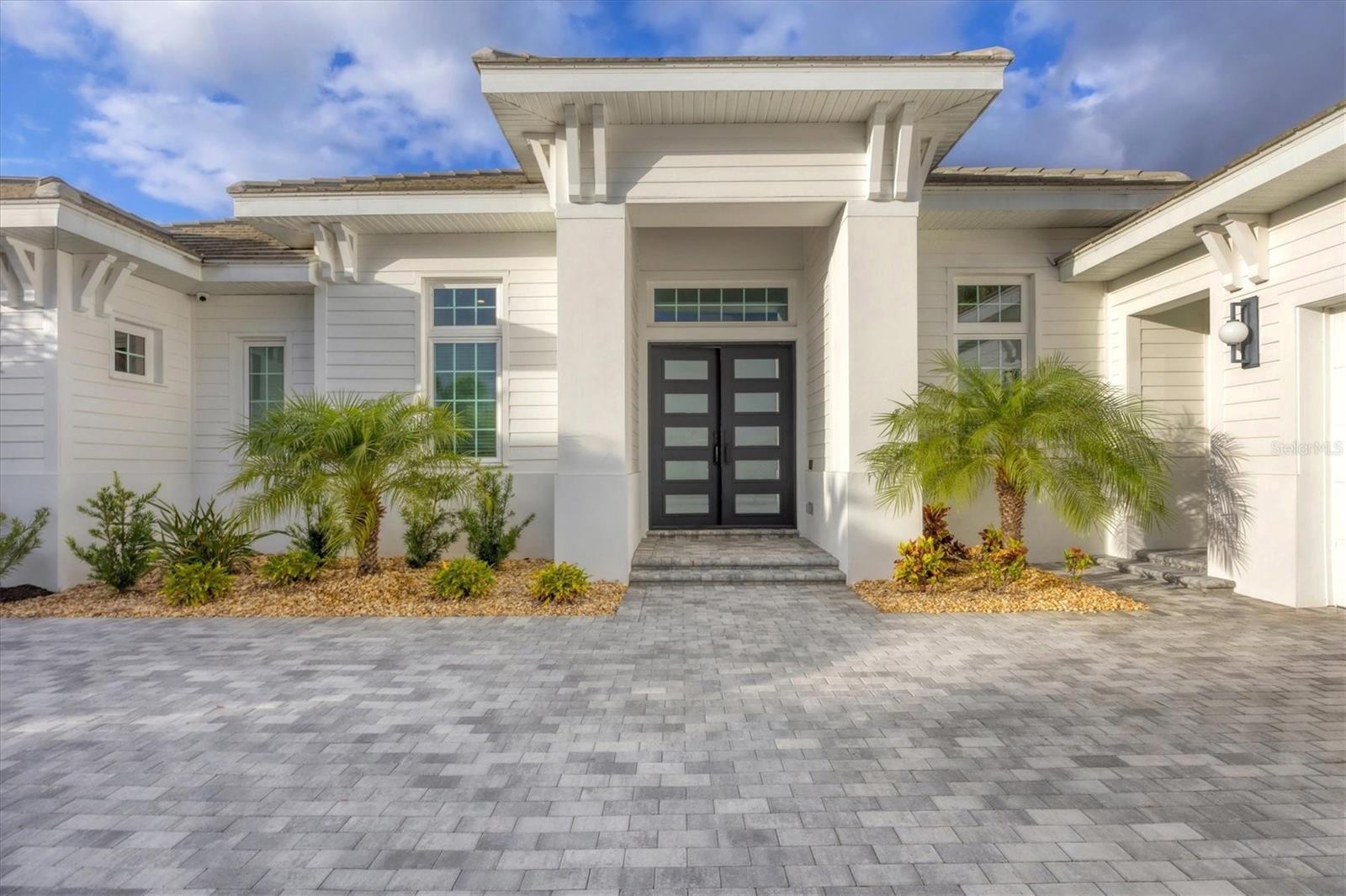 On a quiet preserve in the exclusive gated enclave of Country Club East, this exceptional John Cannon residence showcases refined craftsmanship, modern luxury, and seamless indoor-outdoor living. Designed for comfort and impact, the home features impact-rated windows and doors, a full-house generator, and an open layout that’s as functional as it is beautiful. Enter through 10-foot iron and glass double doors into a dramatic great room with whitewashed European oak flooring, soaring 13-foot ceilings with chevron wood detail, and a striking natural gas fireplace framed by Basalt volcanic tile and reclaimed wood mantle. A custom Whisperkool wine wall holds up to 130 bottles, accented by a chevron Stickwood backdrop. The main foyer features a hidden closet for bags and shoes. The chef’s kitchen boasts Sub-Zero and Wolf appliances, a six-burner range, built-in oven and microwave, quartz countertops, a prep island outfitted with pullout drawers, two for spices, a farmhouse sink and a standalone ice maker. An entertaining-sized island outside the kitchen features Sub-Zero beverage and wine coolers, an additional microwave and ample hidden storage. A spacious walk-in pantry is nearby and includes a built-in tall closet. The great room’s 10-foot sliders fold back into a disappearing corner and lead to the expansive lanai with a PebbleTec infinity-edge heated saltwater pool and spa, panoramic screen enclosure, Shell Lock pavers and a fully outfitted summer kitchen with Alfresco grill, Trailwinds hood, True ice machine, Uline refrigerator and Blanco sink. The private owner’s wing includes two walk-in closets, tray ceiling with crown molding, lanai access, and a spa-style bath with radiant heated floors and a steam shower. Two guest suites are positioned in separate wings, each with its full bath and walk-in closet, one with a private entrance and drop zone, the other with pool bath access. Additional living spaces include a bonus room with 10-foot sliders as a second disappearing corner as well as a study/exercise room with 15-foot ceilings. The laundry room features abundant cabinet storage, designer tile, sink and an additional 60 square feet of dedicated storage carved out behind two double doors. Adding even more value, the home is equipped with a whole-house water filtration system, designer lighting, automatic blinds and an oversized three-car garage. Every detail of this home has been thoughtfully curated for elevated living in one of Lakewood Ranch’s prestigious communities.