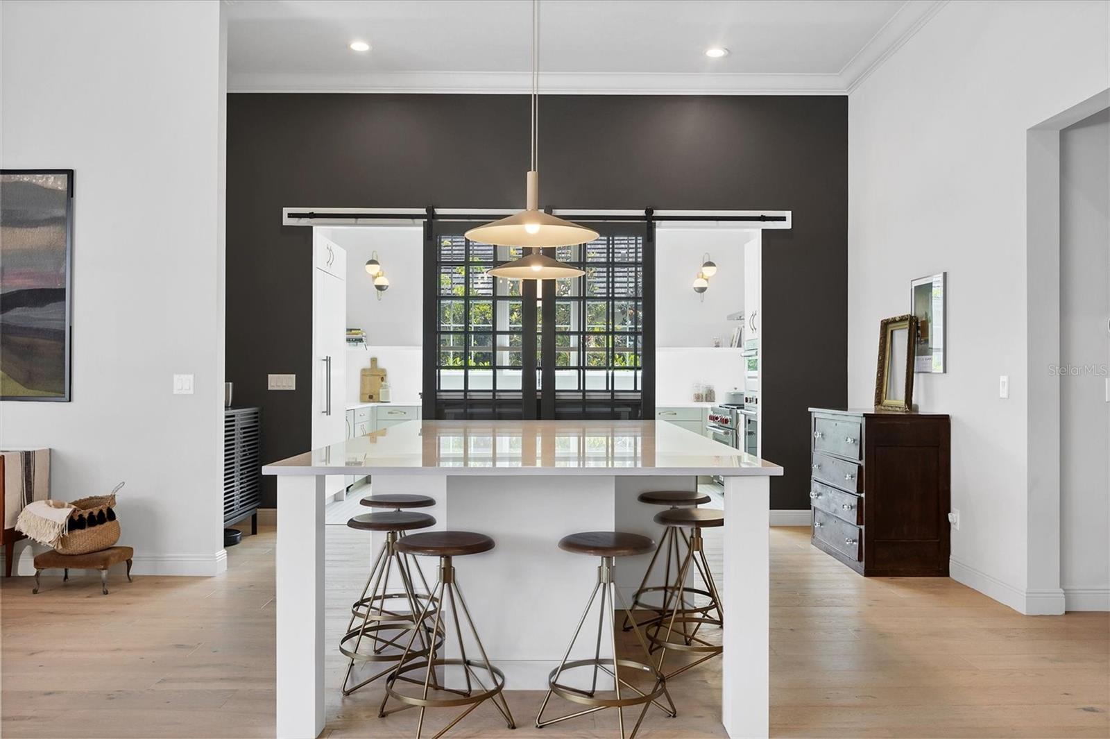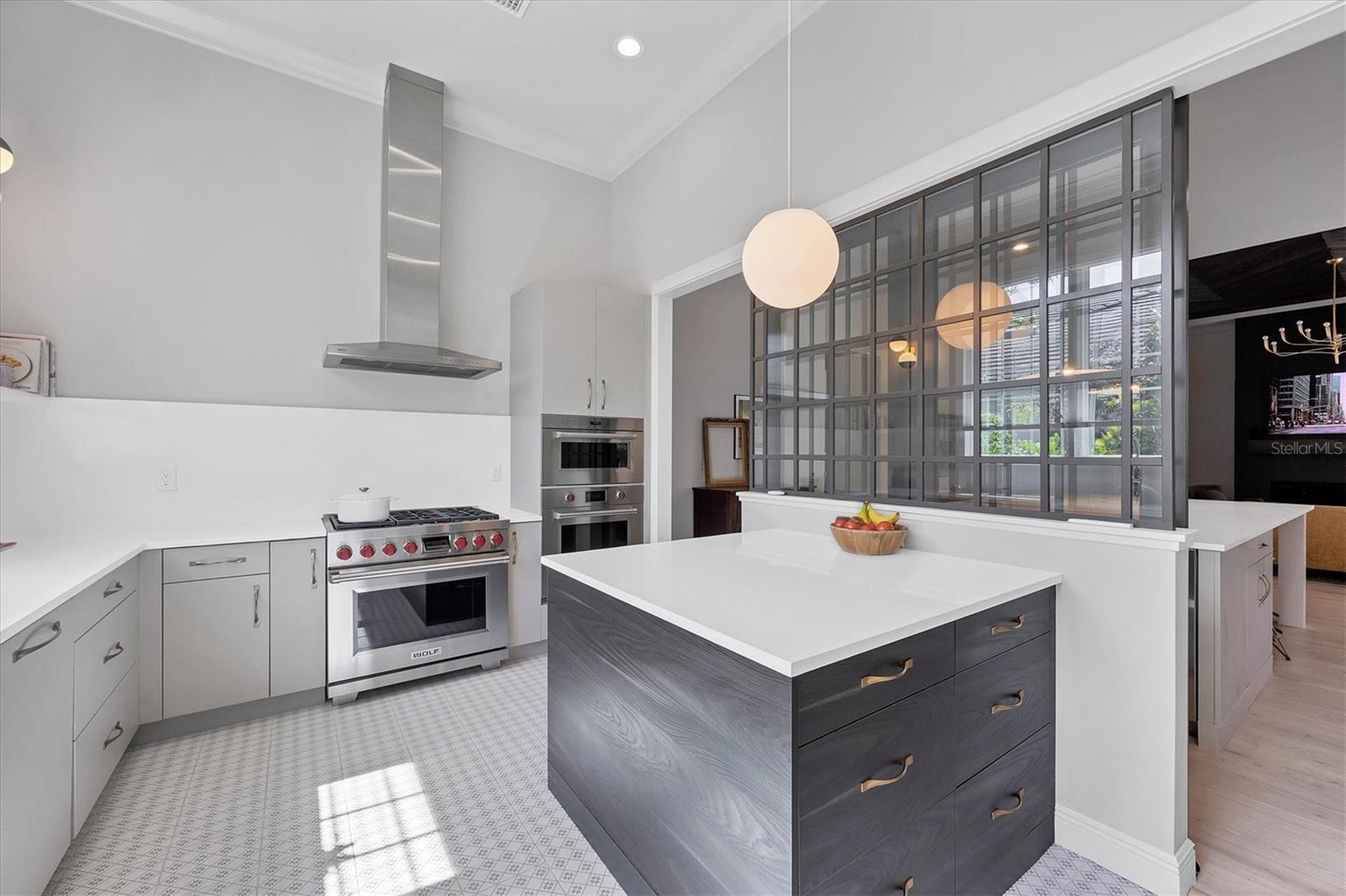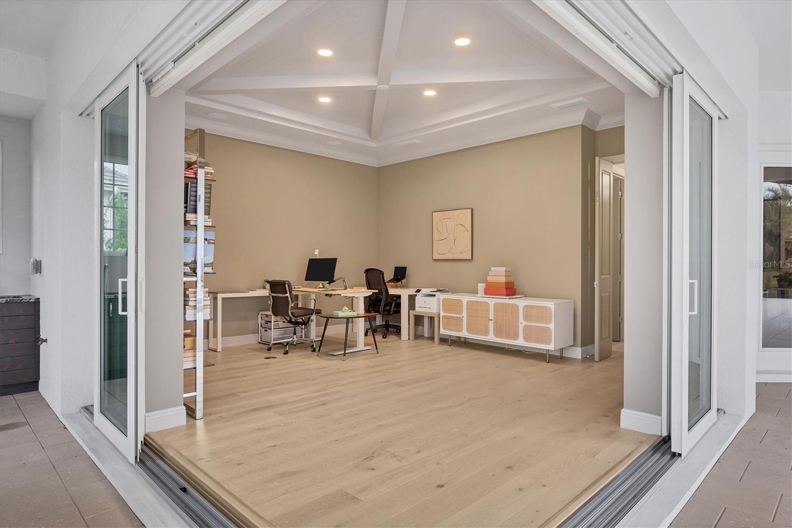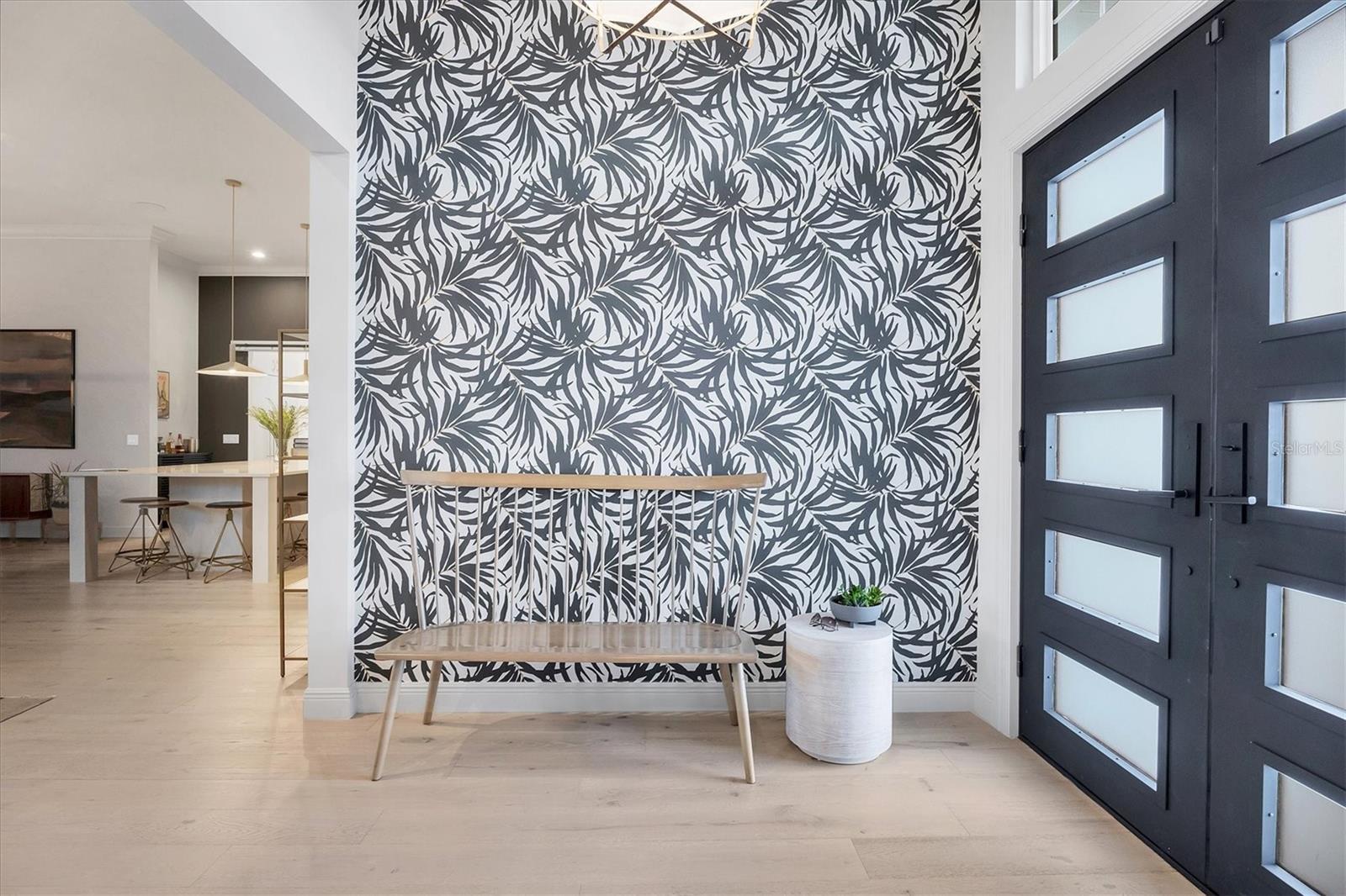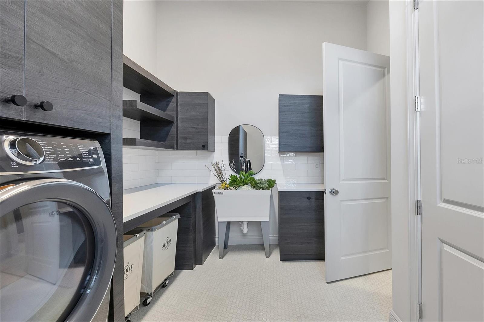 On a quiet preserve in the exclusive gated enclave of Country Club East, this exceptional John Cannon residence showcases refined craftsmanship, modern luxury, and seamless indoor-outdoor living. Designed for comfort and impact, the home features impact-rated windows and doors, a full-house generator, and an open layout that’s as functional as it is beautiful. Enter through 10-foot iron and glass double doors into a dramatic great room with whitewashed European oak flooring, soaring 13-foot ceilings with chevron wood detail, and a striking natural gas fireplace framed by Basalt volcanic tile and reclaimed wood mantle. A custom Whisperkool wine wall holds up to 130 bottles, accented by a chevron Stickwood backdrop. The main foyer features a hidden closet for bags and shoes. The chef’s kitchen boasts Sub-Zero and Wolf appliances, a six-burner range, built-in oven and microwave, quartz countertops, a prep island outfitted with pullout drawers, two for spices, a farmhouse sink and a standalone ice maker. An entertaining-sized island outside the kitchen features Sub-Zero beverage and wine coolers, an additional microwave and ample hidden storage. A spacious walk-in pantry is nearby and includes a built-in tall closet. The great room’s 10-foot sliders fold back into a disappearing corner and lead to the expansive lanai with a PebbleTec infinity-edge heated saltwater pool and spa, panoramic screen enclosure, Shell Lock pavers and a fully outfitted summer kitchen with Alfresco grill, Trailwinds hood, True ice machine, Uline refrigerator and Blanco sink. The private owner’s wing includes two walk-in closets, tray ceiling with crown molding, lanai access, and a spa-style bath with radiant heated floors and a steam shower. Two guest suites are positioned in separate wings, each with its full bath and walk-in closet, one with a private entrance and drop zone, the other with pool bath access. Additional living spaces include a bonus room with 10-foot sliders as a second disappearing corner as well as a study/exercise room with 15-foot ceilings. The laundry room features abundant cabinet storage, designer tile, sink and an additional 60 square feet of dedicated storage carved out behind two double doors. Adding even more value, the home is equipped with a whole-house water filtration system, designer lighting, automatic blinds and an oversized three-car garage. Every detail of this home has been thoughtfully curated for elevated living in one of Lakewood Ranch’s prestigious communities.