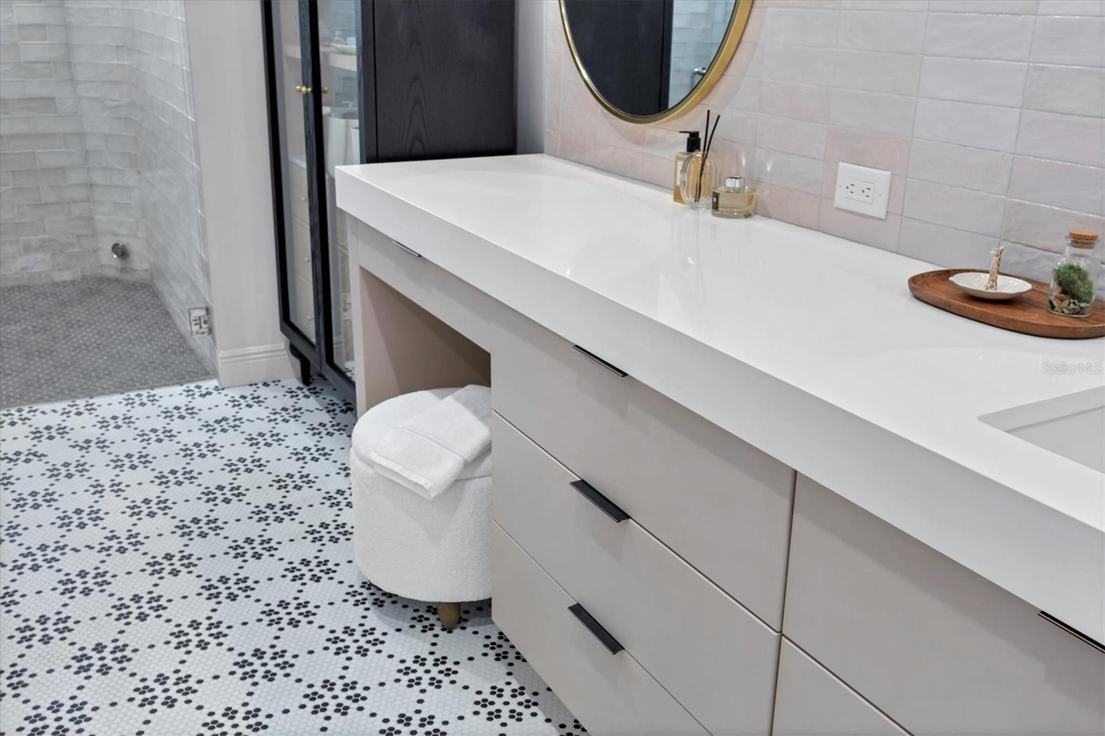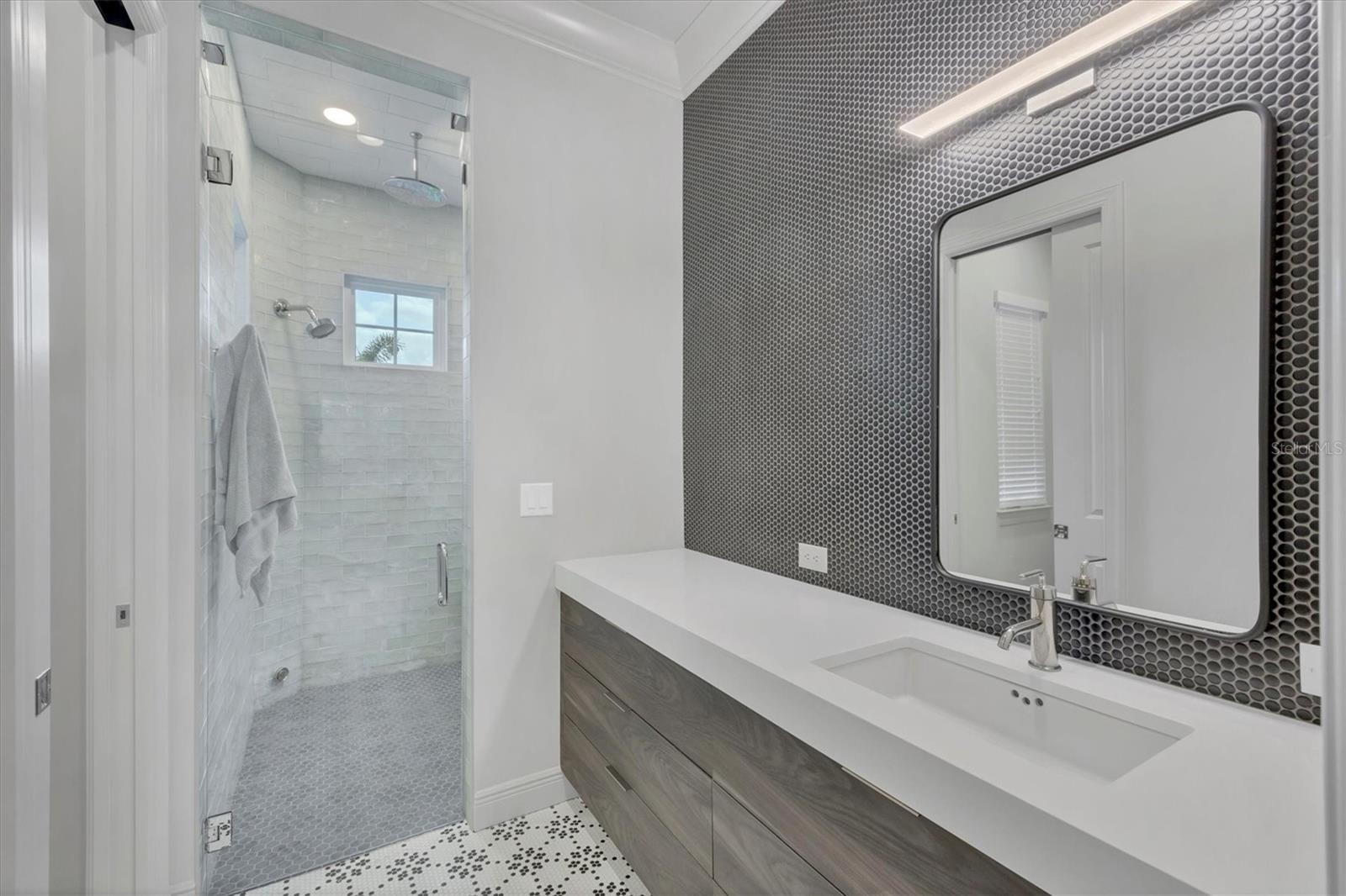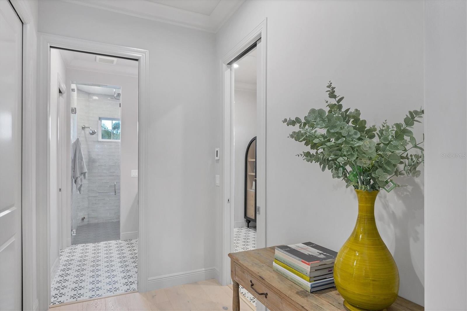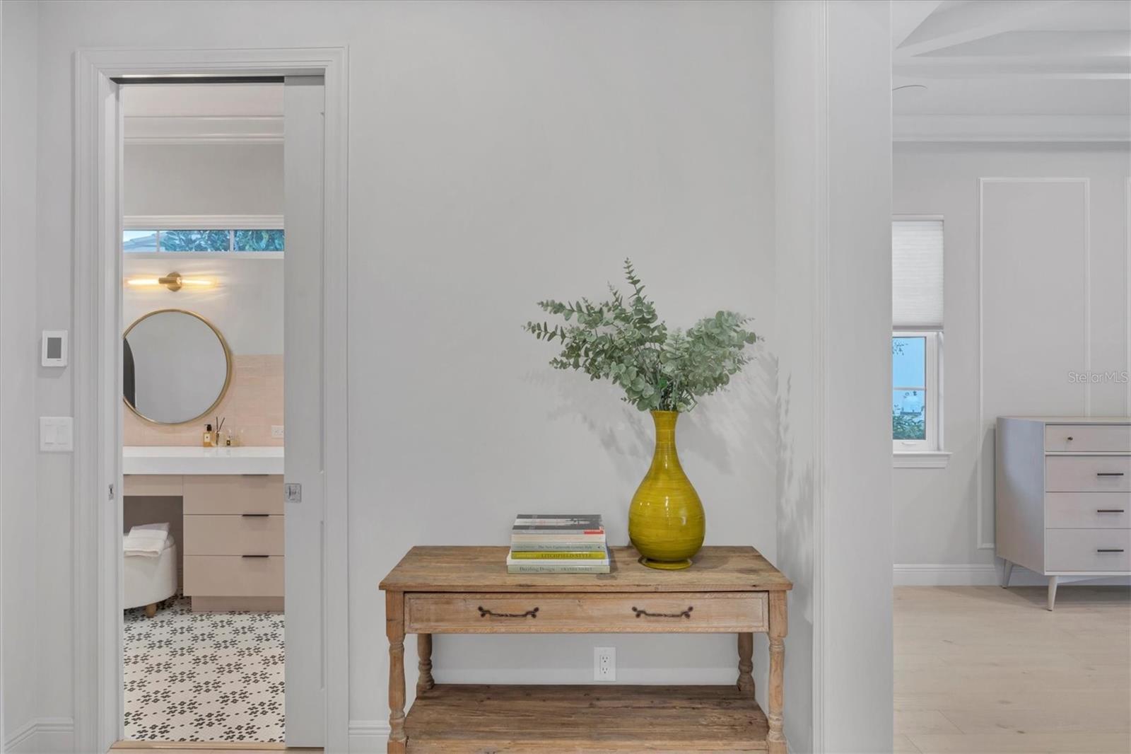 On a quiet preserve in the exclusive gated enclave of Country Club East, this exceptional John Cannon residence showcases refined craftsmanship, modern luxury, and seamless indoor-outdoor living. Designed for comfort and impact, the home features impact-rated windows and doors, a full-house generator, and an open layout that’s as functional as it is beautiful. Enter through 10-foot iron and glass double doors into a dramatic great room with whitewashed European oak flooring, soaring 13-foot ceilings with chevron wood detail, and a striking natural gas fireplace framed by Basalt volcanic tile and reclaimed wood mantle. A custom Whisperkool wine wall holds up to 130 bottles, accented by a chevron Stickwood backdrop. The main foyer features a hidden closet for bags and shoes. The chef’s kitchen boasts Sub-Zero and Wolf appliances, a six-burner range, built-in oven and microwave, quartz countertops, a prep island outfitted with pullout drawers, two for spices, a farmhouse sink and a standalone ice maker. An entertaining-sized island outside the kitchen features Sub-Zero beverage and wine coolers, an additional microwave and ample hidden storage. A spacious walk-in pantry is nearby and includes a built-in tall closet. The great room’s 10-foot sliders fold back into a disappearing corner and lead to the expansive lanai with a PebbleTec infinity-edge heated saltwater pool and spa, panoramic screen enclosure, Shell Lock pavers and a fully outfitted summer kitchen with Alfresco grill, Trailwinds hood, True ice machine, Uline refrigerator and Blanco sink. The private owner’s wing includes two walk-in closets, tray ceiling with crown molding, lanai access, and a spa-style bath with radiant heated floors and a steam shower. Two guest suites are positioned in separate wings, each with its full bath and walk-in closet, one with a private entrance and drop zone, the other with pool bath access. Additional living spaces include a bonus room with 10-foot sliders as a second disappearing corner as well as a study/exercise room with 15-foot ceilings. The laundry room features abundant cabinet storage, designer tile, sink and an additional 60 square feet of dedicated storage carved out behind two double doors. Adding even more value, the home is equipped with a whole-house water filtration system, designer lighting, automatic blinds and an oversized three-car garage. Every detail of this home has been thoughtfully curated for elevated living in one of Lakewood Ranch’s prestigious communities.