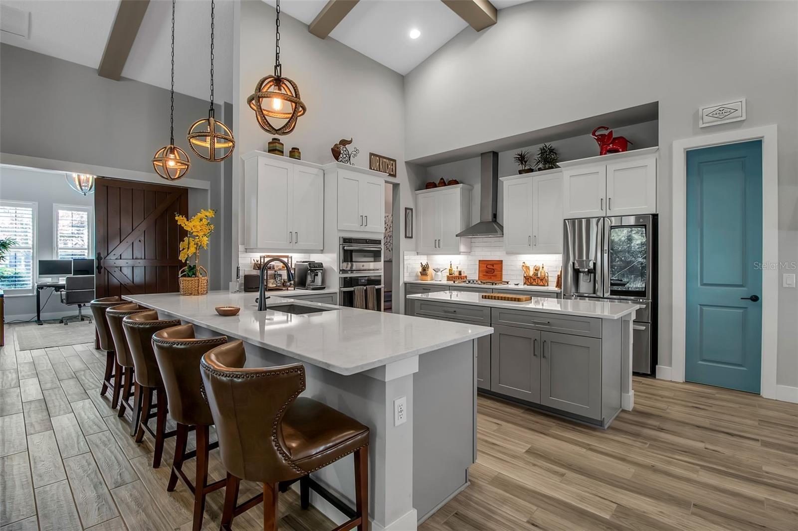 Under contract-accepting backup offers. Introducing a residence of exceptional craftsmanship and timeless elegance, the Fairlead model by Homes by Towne, a gem in the desired Lakehouse Cove at Waterside in Lakewood Ranch. Encompassing over 3,000 square feet of refined single-story living, this impeccably maintained home offers three bedrooms, a private office, an expansive flex/game room, 2.5 baths and a spacious three-car garage, all set against a serene preserve backdrop with only one neighboring residence. Every detail of the home has been curated with an uncompromising commitment to luxury and style. The residence makes a stunning first impression with a beautifully landscaped exterior, slate tile roof, paver driveway and impact-rated windows. A grand entryway welcomes you into an open-concept layout that effortlessly balances everyday comfort with elevated design. Soaring ceilings with wood beam accents, designer lighting, and abundant natural light frame a warm and sophisticated interior. The great room is a showpiece, featuring a bespoke media wall with floating shelving, shiplap detailing, and contemporary finishes that invite relaxation and refined entertaining. At the heart of the home lies the chef’s kitchen, a masterclass in form and function. Outfitted with LG InstaView ThinQ refrigerator, a five-burner gas cooktop, a combination wall oven and microwave, quartz counters, continuous backsplash and a large island with bar seating for five, this kitchen is a culinary enthusiast’s dream. Two-tone cabinetry, metal hood and water filtration system complete the space. Adjacent, the formal dining area is elevated with board and batten detailing, ideal for intimate gatherings or stylish dinner parties. Enter through 9-foot impact sliders into a private outdoor retreat designed for year-round enjoyment. The expansive screened lanai features panoramic screening to fully showcase the breathtaking preserve views. Over 600 square feet of covered outdoor living includes a rich tongue-and-groove-stained wood ceiling, a luxurious 10-person spa, a summer kitchen with a custom garage-style door and elegant brick pavers, a setting designed to impress. The primary suite is a sanctuary of tranquility, thoughtfully at rear of the home to maximize privacy. Enjoy custom feature walls, dual walk-in closets with bespoke built-ins and a spa-inspired bath complete with dual vanities, a freestanding soaking tub and a walk-in shower. Two guest bedrooms offer deep custom closets and blackout shades for optimal comfort. Additional high-end appointments include a whole house generator, 8-foot interior doors, rolling barn doors, soundproof wall in the flex room, plantation shutters, plank tile flooring throughout, custom mudroom and laundry room, designer ceiling fans, built-in storage and a fenced backyard. Residents of Lakehouse Cove enjoy unparalleled amenities such as a boathouse for kayak and paddleboard storage and launch, two lakeside fire pits, a water taxi to Waterside Place, a stunning clubhouse with catering kitchen and lounge, fitness center, resort-style pool and spa, six pickleball courts, bocce ball, playground, dog parks and over 20 acres of pristine shoreline. Positioned just moments from the amenities and a golf cart ride to Waterside Place, and a quick drive to UTC and SRQ Intl Airport, this home also offers effortless access to world-class beaches such as Siesta Key and Anna Maria Island. This is more than a residence, it is a lifestyle of elegance, comfort and connection.