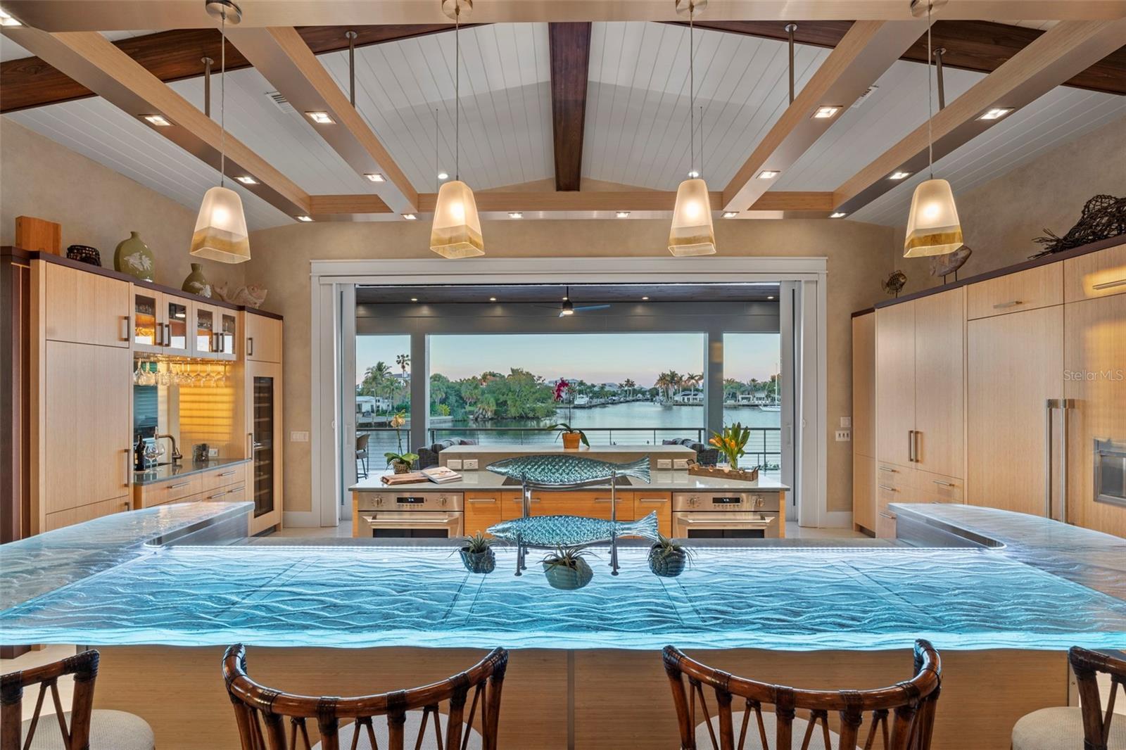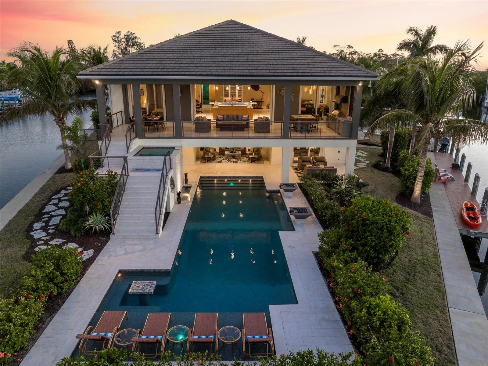 One of the MOST BEAUTIFUL HOMES on Anna Maria Island, this remarkable family estate has it all! A stunning gated waterfront location, beautiful design and quality, elevated construction. Located on the only street on the island that directly accesses both the famous beaches of Anna Maria and the pristine boating waters of Bimini Bay, this property stands out as a true family residence. Set on a stunning triangular property with over 500 feet of water frontage, every room in this home has water views, while the spacious open plan design creates a seamless flow between indoor and outdoor Florida living. Throughout the home, imported cabinetry and Tahitian-inspired finishes reflect craftsmanship and thoughtful design. In the main house, there are two luxurious primary bedrooms, enhanced with full ensuites, while in the guest house, connected by a covered bridge, there are two additional bedrooms, a full bathroom and a kitchenette providing a private retreat for your guests or the grandkids! Stepping out of the glass walled elevator into the huge vaulted great room, you are met with spectacular views over Bimini Bay. Twenty foot wide, hurricane safe, glass doors disappear into the outside walls, allowing a seamless flow of indoor outdoor living from the great room onto the massive covered lanai. The centrally located chef’s kitchen, with stunning bamboo finish and an illuminated glass countertop, adjoins both the inside family dining room, with seating for ten, and the 800 square foot outdoor lanai. Steps away there is a full outdoor kitchen, a Teppanyaki cooking table with seating for eight, a built in fire table, outdoor dining table, lounge seating areas and direct access to the whirlpool spa…all just off the kitchen and at the same elevated and protected level as the main floor. And all with unobstructed views of the dolphins and manatees in Bimini Bay. One level below, next to the gym, the resort-style pool has fire and waterfall features and is set in tropical gardens that lead to a waterfront “sandy beach” fire pit, where family and guests gather beneath the stars. A 20-foot dock is ideal for launching the Kayaks or SUP, while serious boating enthusiasts will appreciate 500 feet of new concrete reinforced seawall, a 60-foot boat dock, and a 12,000 lb. boatlift, with direct access to Tampa Bay and the Gulf of Mexico. With far too many features to list, this estate truly represents one of the island’s most distinguished offerings and has to be seen be truly appreciated. Private viewings are available exclusively by appointment. Meanwhile, you are welcome to enjoy a narrated video preview at the property’s private website, amidreamhome.com