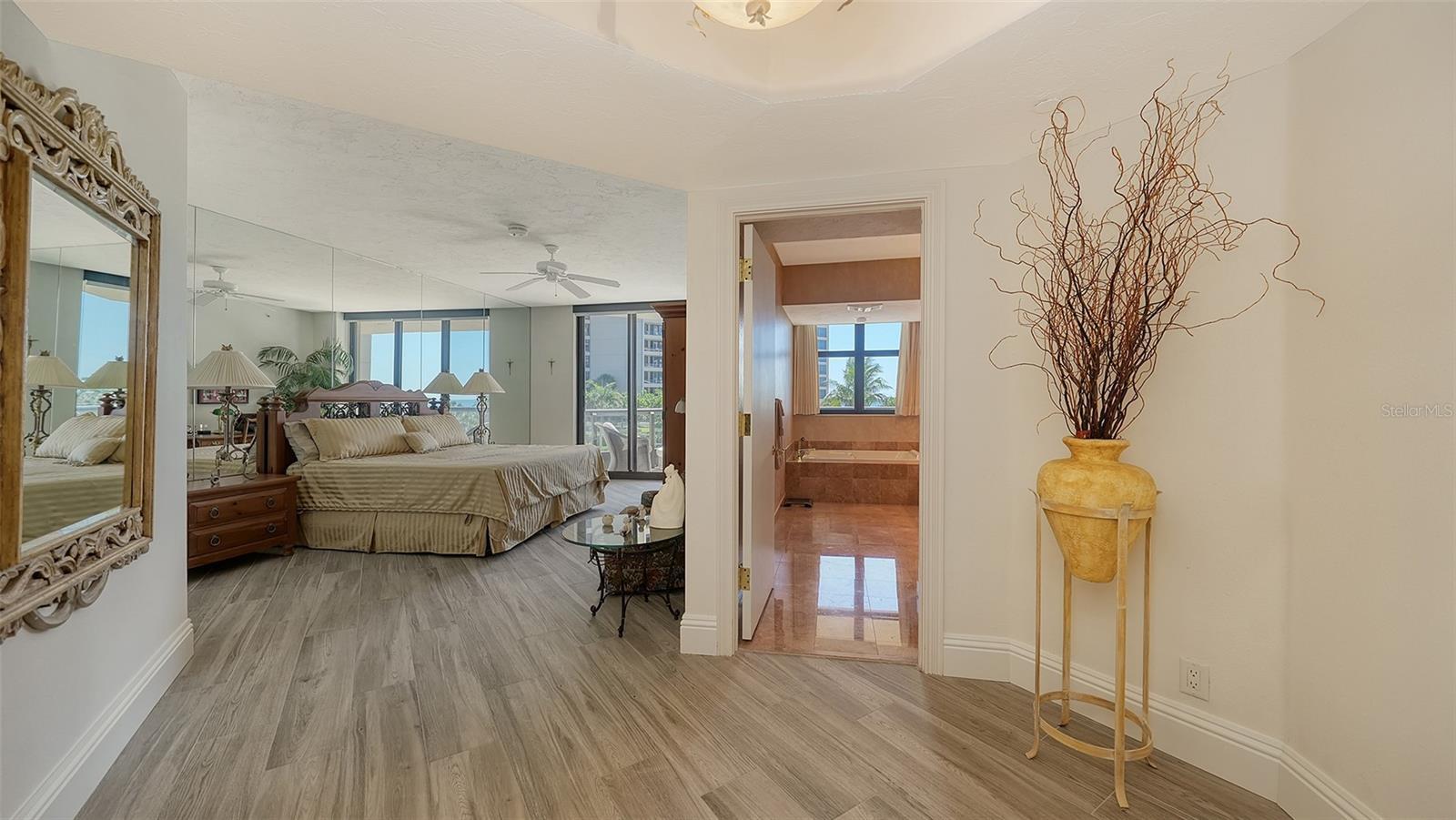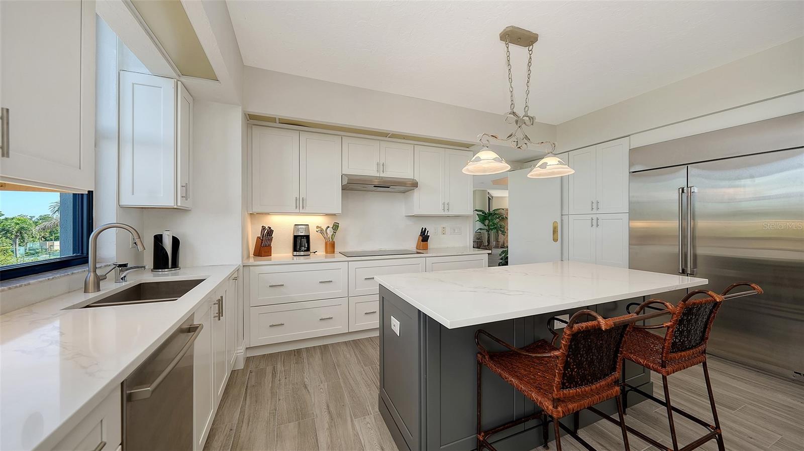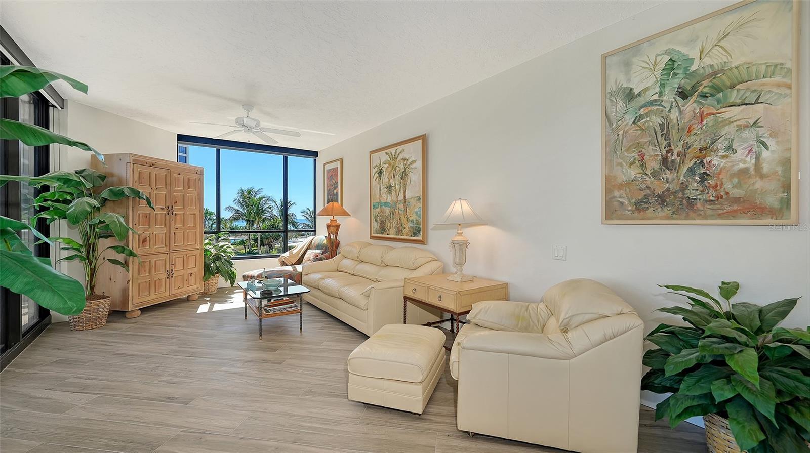 PRICE REDUCED! This beautifully furnished, move-in-ready residence at The Water Club stands among the best values in one of Longboat Key's most sought-after gulf-front addresses. Featuring two bedrooms plus a den and four baths, this refined coastal retreat offers an ideal combination of comfort, style, and convenience. Spanning 2,965 square feet, this residence welcomes you with new designer flooring, an open-concept layout, and abundant natural light. The spacious 2024 custom kitchen renovation showcases premium white cabinetry, quartz countertops, an island with bar seating, and Cafe' appliances-perfectly blending modern style with everyday functionality. Enjoy serene views of tropical landscaping and partial ocean views from the private terraces throughout. The primary master suite is a peaceful retreat featuring a spa-inspired bath with soaking tub, bidet, and glass-enclosed shower. The second bedroom also includes its own en-suite bath and terrace, while the open den provides flexible space for work or relaxation. This unit also has a separate controlled climate storage area and convenient ground-level garage parking. At the Water Club, residents enjoy resort-style living with 24-hour gated security, full concierge service, and a 17,000 square foot clubhouse featuring a spa, state-of-the-art fitness center, library, catering kitchen, and grand ballroom. Ideal for entertaining! Outdoors, residents can enjoy the Olympic-sized heated pool and Har-Tru tennis courts. The 600 feet of private white-sand beachfront is perfect for morning walks, sunset views, or relaxed days by the water. All this is just minutes from St. Armands Circle and downtown Sarasota. With its refined updates, including new flooring and a custom kitchen, this move-in-ready residence stands out as one of the best opportunities at The Water Club at Longboat Key.