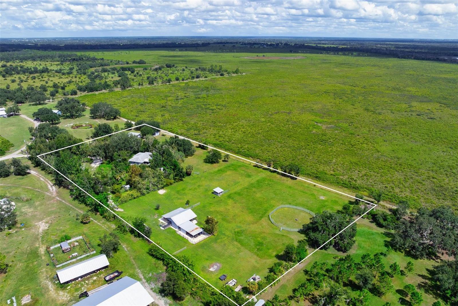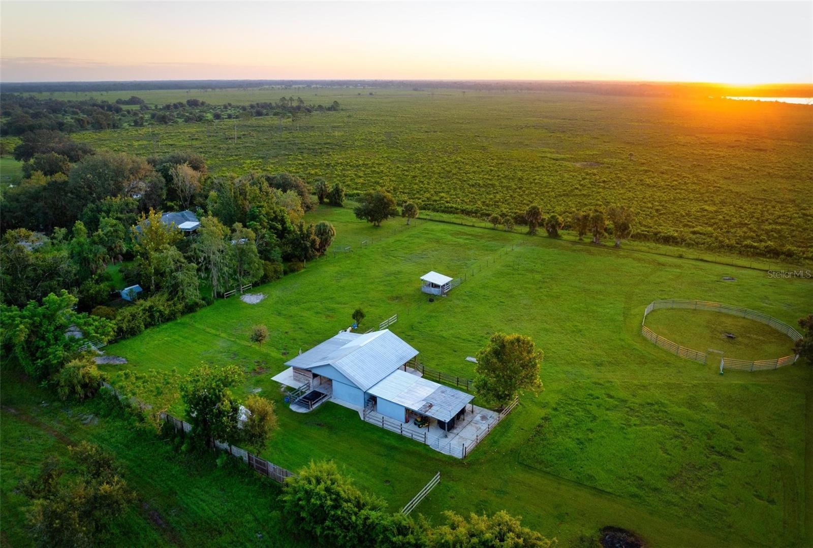 Under contract-accepting backup offers. This rare 5.15 acres in the equestrian estates of Myakka Valley Ranches is one of just a handful that borders the breathtaking Myakka River State Park (the largest and oldest Florida state park), nearly 29,000 acres of protected Florida wilderness right in your backyard. Imagine morning coffee as the sun rises over the lake, your horses grazing in the pasture, and not a neighbor in sight behind you. As you pull through the private gate, a tree-lined concrete drive leads you to not one, but two block homes, each light, bright, and thoughtfully cared for. The MAIN HOME offers three spacious bedrooms with walk-in closets, two full baths, and an open layout centered around a cozy wood-burning fireplace. The ROOF is just 5 years old (2020), and the ELECTRICAL PANEL was updated in 2022. The kitchen includes stainless steel appliances, solid surface counters, a tile backsplash, and a pantry, perfectly designed for everyday living. Step out to the screened porch and hot tub overlooking the koi pond, outdoor shower, and gardens, or unwind on the large wood deck with built-in seating, ideal for morning coffee or a quiet evening under the stars. Just beyond, you’ll find the charming 12x12 “Doll House” with a metal roof and A/C, perfect for a studio, office, or playhouse. The SECOND HOME, built in 2007, offers two bedrooms, one bath, and 744 square feet of open, comfortable living space. It features a metal roof, granite counters, wood cabinetry, its own well and septic system, plus a screened porch and laundry room, ideal for multi-generational living, rental income, or hosting guests who won’t want to leave. The land sits high and dry, not in a flood zone, and the homes have had no previous storm damage for peace of mind. And for the horse lover, the 1,278 square foot barn (36 x 35.5) is a dream. With thick poured concrete, three oversized stalls, a tack and feed room, wash station, 10-foot center aisle, and a run-in stall connecting directly to three lush, cross-fenced lush pastures totaling about three acres. There’s also a round pen, a fenced area for chickens or a garden, and a 30-amp RV hookup ready for your rig or visiting friends. Living here means riding or hiking on nearly 30 miles of scenic trails, exploring the park next door, and coming home to a property that feels like a private retreat. You’re just 7 miles east of I-75 and 14 miles from the #1 world-famous Siesta Key Beach with its white quartz sand, offering the perfect balance of country serenity and coastal convenience. Out here, there’s no traffic, no stress, just space to breathe, a sky full of stars, and a quiet you can feel.
