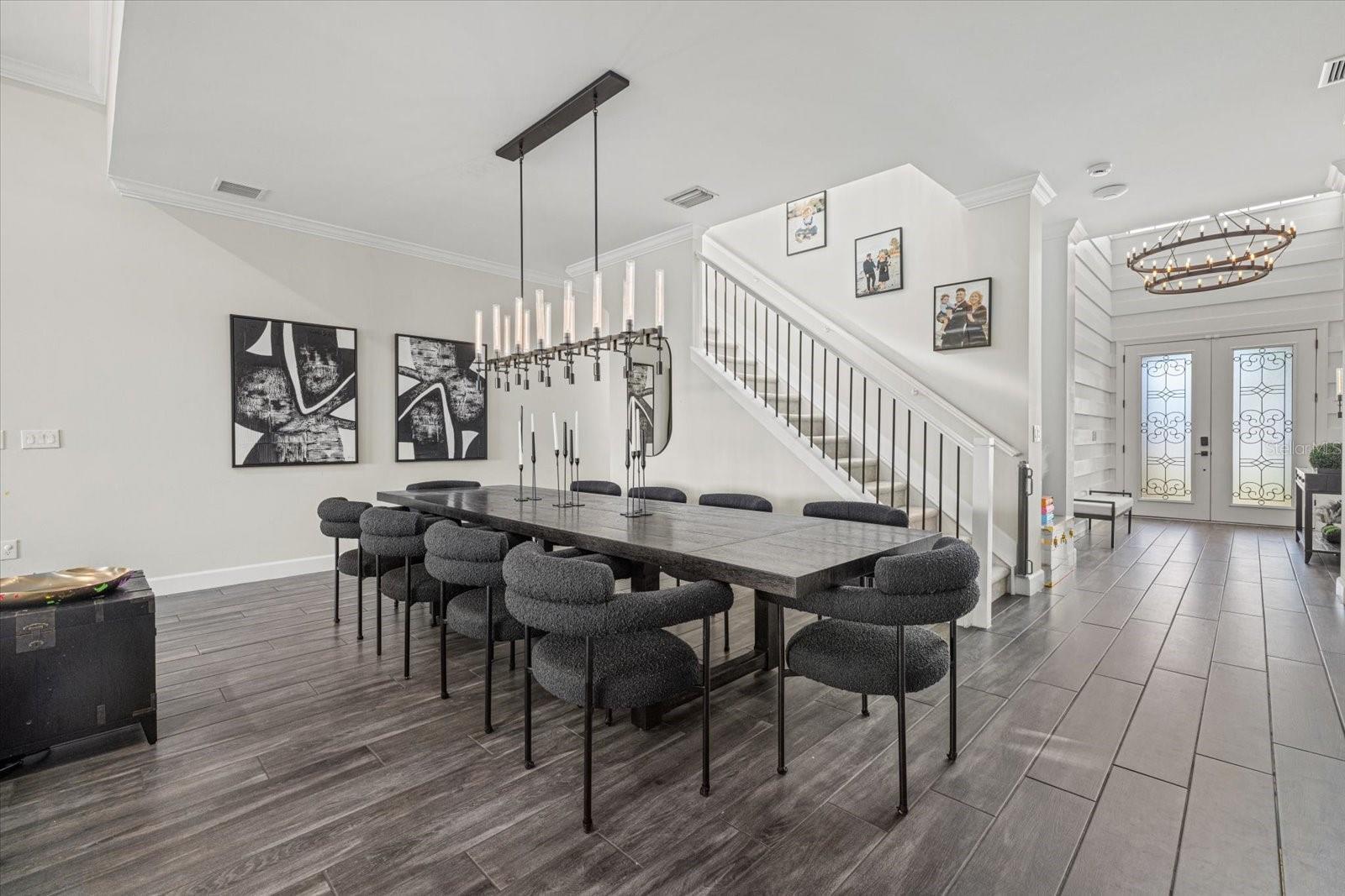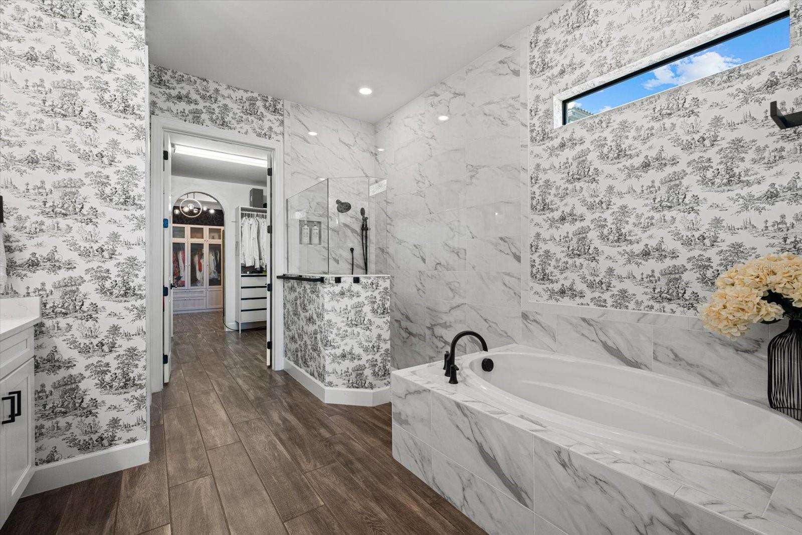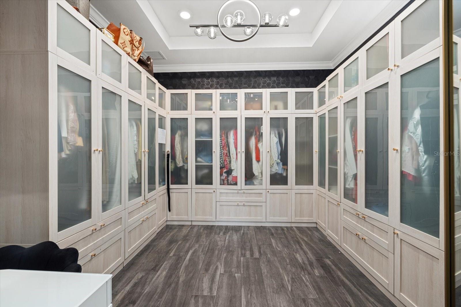 - Ceiling Fans(s), Coffered Ceiling(s), Crown Molding, Eat-in Kitchen, High Ceilings, Kitchen/Family Room Combo, Living Room/Dining Room Combo, Open Floorplan, Primary Bedroom Main Floor, Smart Home, Solid Surface Counters, Split Bedroom, Stone Counters, Thermostat, Tray Ceiling(s), Walk-In Closet(s), Wet Bar, Window Treatments