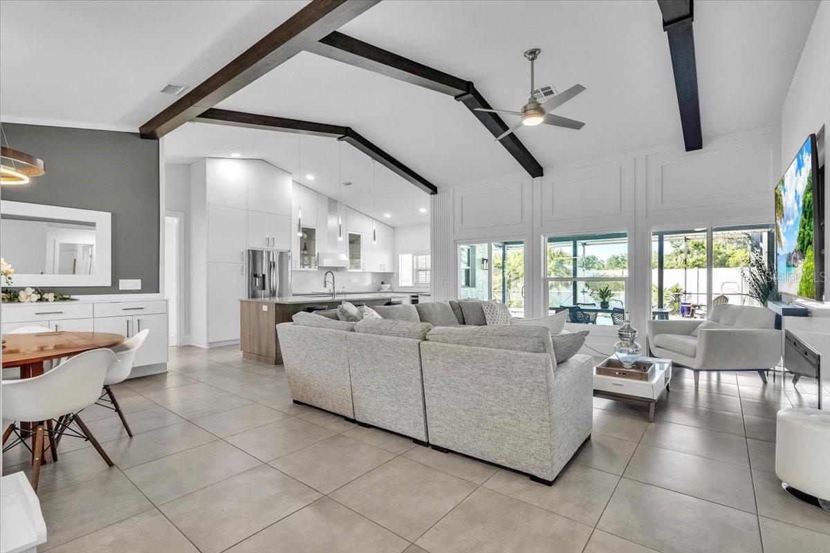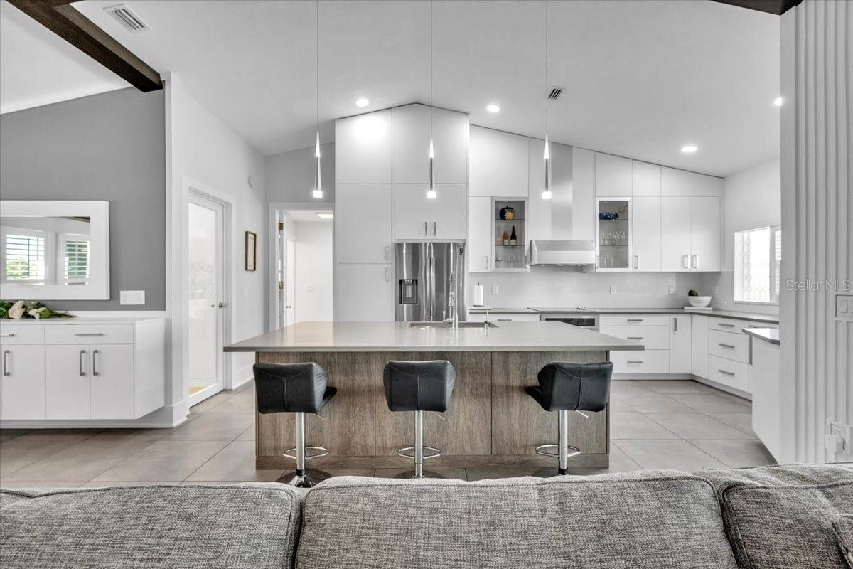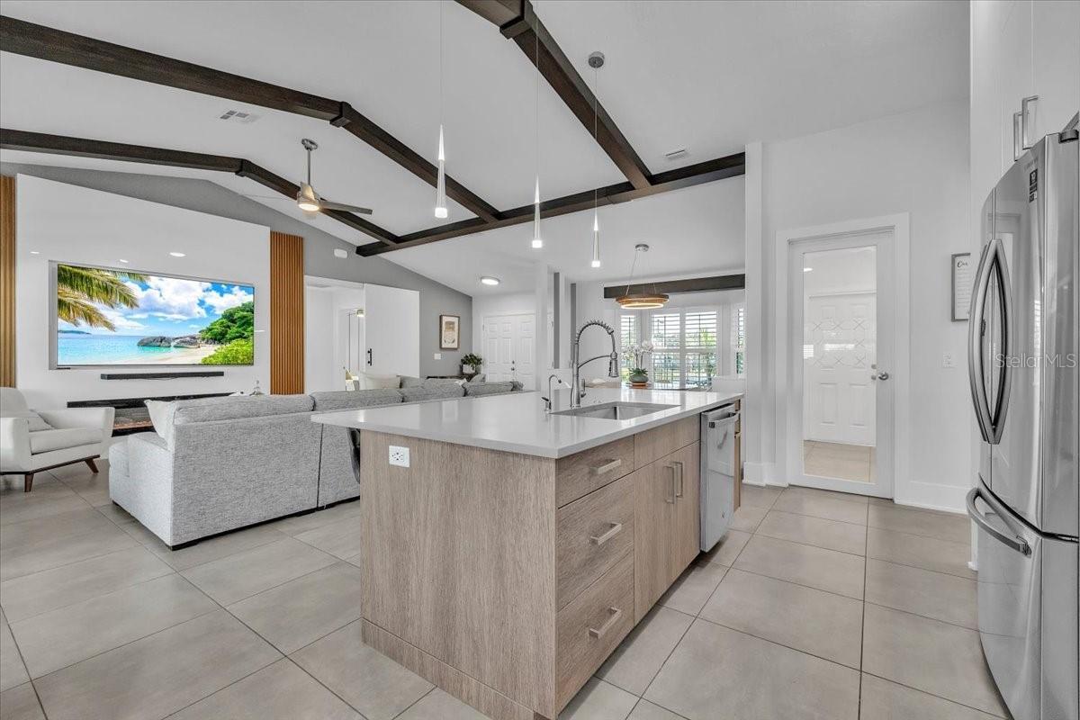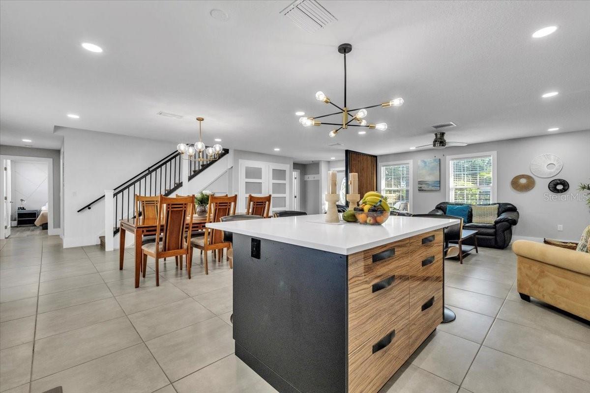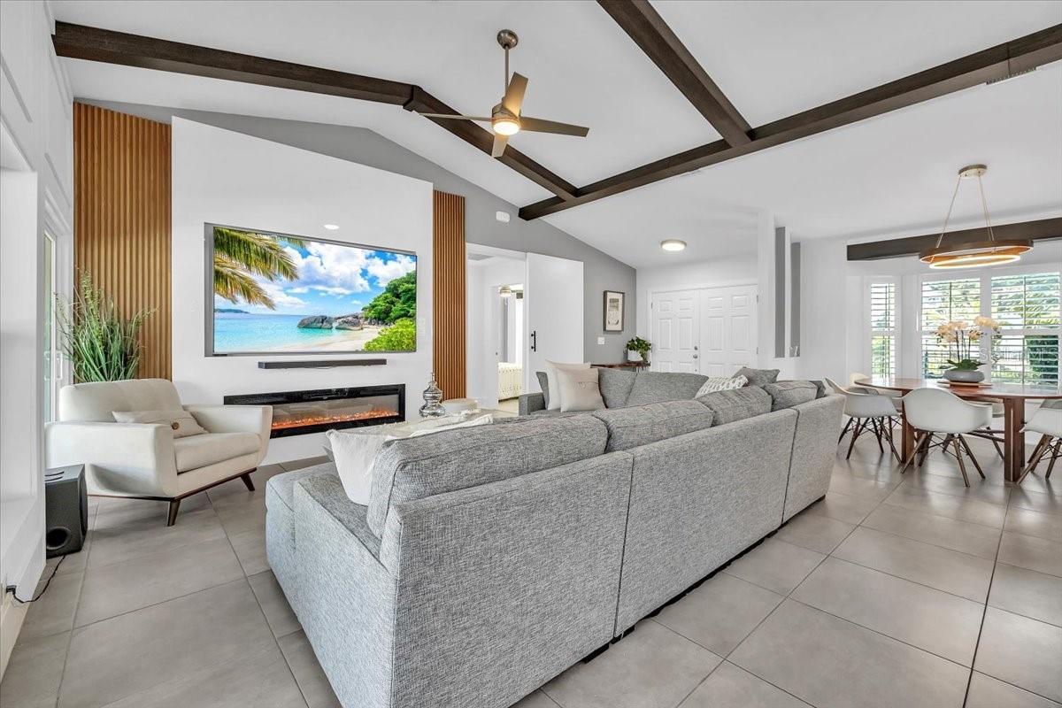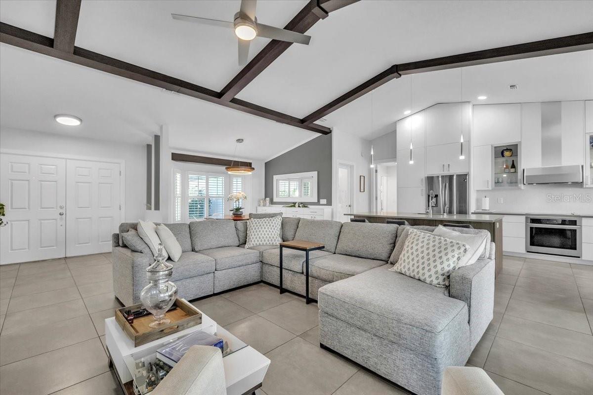 - Ceiling Fans(s), Crown Molding, High Ceilings, Kitchen/Family Room Combo, Open Floorplan, Primary Bedroom Main Floor, Solid Surface Counters, Split Bedroom, Stone Counters, Thermostat, Vaulted Ceiling(s)