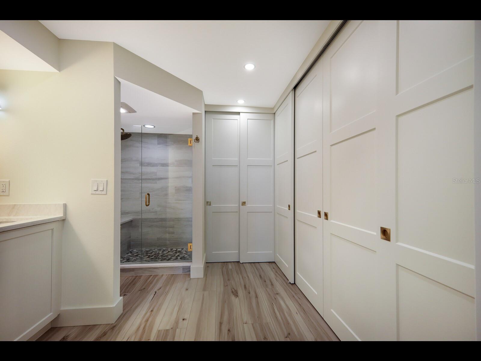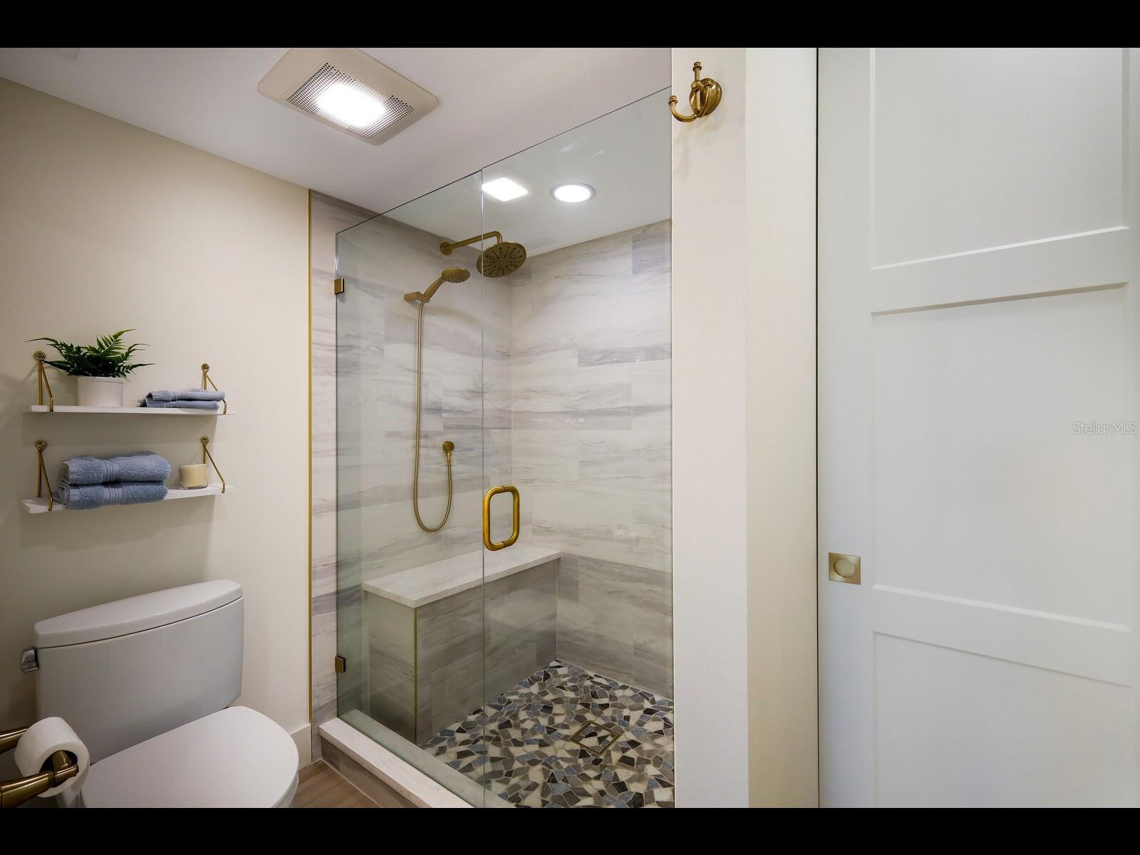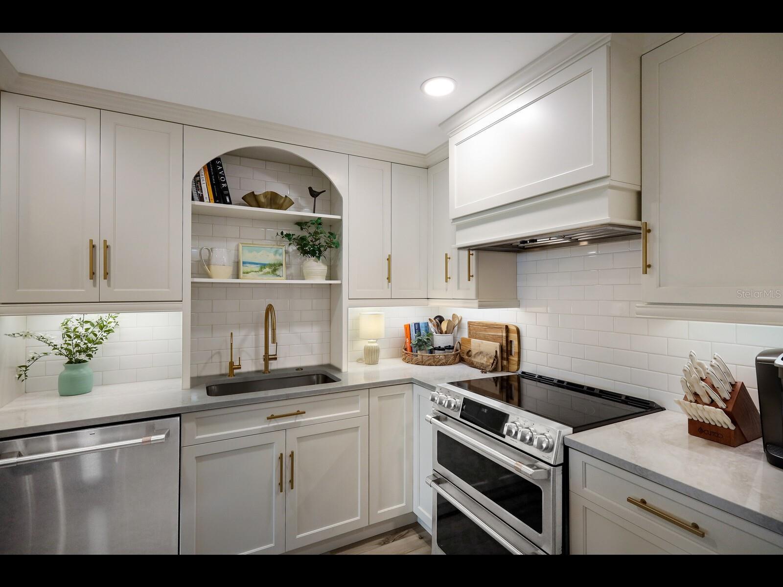 Under contract-accepting backup offers. Fully RE-DESIGNED and RENOVATED 2-bedroom, 2-bath condo in Seaplace with PARTIAL GULF VIEWS. Completed in 2023, this residence showcases over $200K in UPSCALE UPGRADES AND FINISHES. Crafted for both elegance and durability, the home features HURRICANE IMPACT-rated windows and sliding glass doors, providing enhanced storm protection, improved energy efficiency, and year-round peace of mind. The spacious QUARTZ KITCHEN ISLAND serves as both a functional hub and an artistic focal point, anchoring the open-concept living area with style and intention. The island includes seating and additional storage underneath. The kitchen is outfitted with HIGH-END GE Café Series APPLIANCES, including a dual oven, refrigerator with beverage drawer and flex zones, dishwasher, microwave, and wine fridge. Locally crafted CUSTOM SHAKER CABINETRY with soft-close drawers, a subway tile backsplash, Falmec hood, and designer gold plumbing fixtures and cabinet pulls complete the space. A thoughtfully crafted ENTERTAINMENT BAR with floating shelves, glass-front cabinets, and a built-in WINE FRIG adds flair and functionality—an efficient and elegant use of space.The spacious screened lanai, fitted with no-see-um proof screens, offers Gulf views and ample room for dining and relaxation.The primary suite is designed as a private retreat, with a spa-like bathroom featuring dual vanities, a Toto toilet, and a frameless glass shower with smooth pebblestone flooring, in-line drains, and a built-in bench seat.Custom tray ceilings in the living room and bedrooms add architectural interest, complemented by modern ceiling fans and enhanced LED lighting. All closets and the fully equipped laundry room are customized by Closets by Design for optimal storage. LG ThinQ smart washer and dryer included. Throughout the home, you’ll find luxury waterproof vinyl flooring and electric room-darkening shades in both bedrooms. A dedicated covered parking spot under the building—a rare and valuable feature—comes with the unit. Seaplace association has approved BRAND NEW front doors for each residence, which once installed will modernize the look of the complex as well as allow more light to filter into the unit through translucent impact glass panels. Seaplace residents enjoy a half-mile of private beachfront with beach chairs and umbrellas, two swimming pools, two spas, a kiddie pool, three Har-Tru tennis courts, a playground, and a one-mile walking trail. The updated clubhouse includes a fitness center, sauna, library, catering kitchen, AV lounge, and a Gulf-front patio with multiple grills.With effortless access to fine dining, shopping, and Sarasota’s world-class arts and culture, this Seaplace condo offers a rare opportunity for refined island living.
