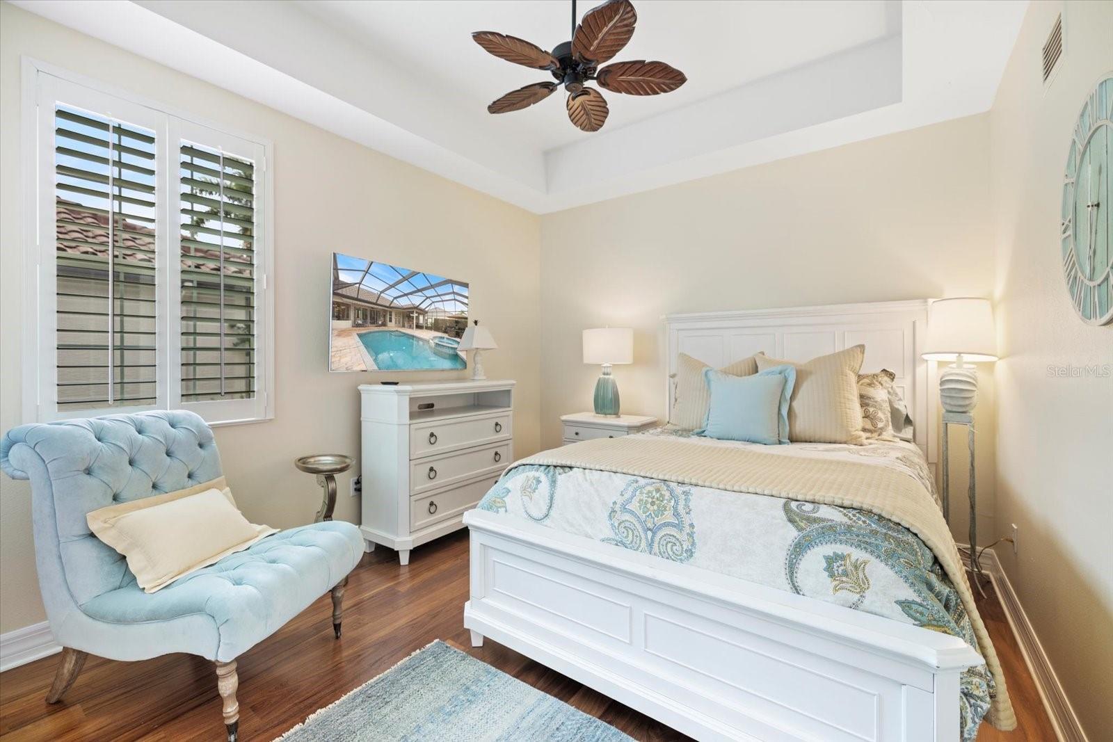 Located in River Club, this stunning property offers not just a place to live, but a luxurious lifestyle in a serene golf course community. Spanning 3,721 square feet, this 4-bedroom, 3.5-bathroom residence is situated on a generous 14,901 square foot lot, ensuring plenty of space for relaxation and entertainment. Step inside to a grand entryway featuring elegant columns and detailed tile flooring, leading to formal living and dining areas. The living room boasts a cozy fireplace with custom shelving beneath a beautifully coffered ceiling. Enjoy meals in the dining room, enhanced by a chandelier and plantation shutters, or take breakfast in the kitchen's sunny nook. The kitchen itself is a culinary paradise, featuring granite countertops, wood cabinets, a marble backsplash, cooktop, beverage fridge, and a spacious walk-in pantry. Experience seamless indoor-outdoor living with sliding glass doors in the family room opening to a breathtaking outdoor oasis. The outdoor living area includes a pool, spa, wood ceilings, and an outdoor kitchen with a bar, perfect for entertaining. Enjoy the convenience of a pool bath and a large brick patio ideal for gatherings around a fire pit. Retreat to the primary suite with a vestibule entry, luxurious tub, walk-in showers, split vanities, oversized walk-in closet with custom shelving, and French doors opening to your private bay sitting area. Wood flooring and shutters add a touch of sophistication. The tile roof newly replaced in 2023, adds peace of mind. Additional features include a spacious office and guest bedroom on the main floor, an upstairs bonus room with built-in desk and shelving, crown molding, pest tubes, central vacuum, and a newly replaced air conditioner in 2024. The attached garage is designed for more than just vehicles—it features epoxy speckled floors, custom cabinetry, mini-split air conditioning, and ample storage. A well-appointed laundry room includes a front-loading washer and dryer with pedestals, sink, and cabinets. With LOW HOA FEES AND NO CDD FEES, this exceptional home is set within the established community of River Club, offering easy access to the world-renowned Gulf Coast beaches, the shopping, dining, and entertainment venues of Lakewood Ranch and Sarasota, top-tier medical facilities, and excellent schools.