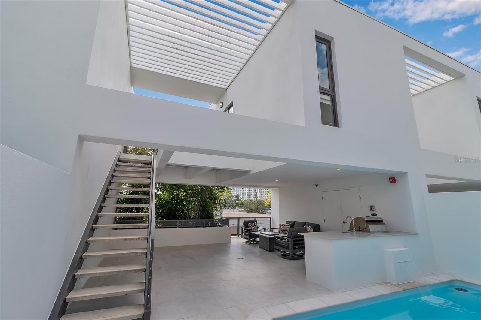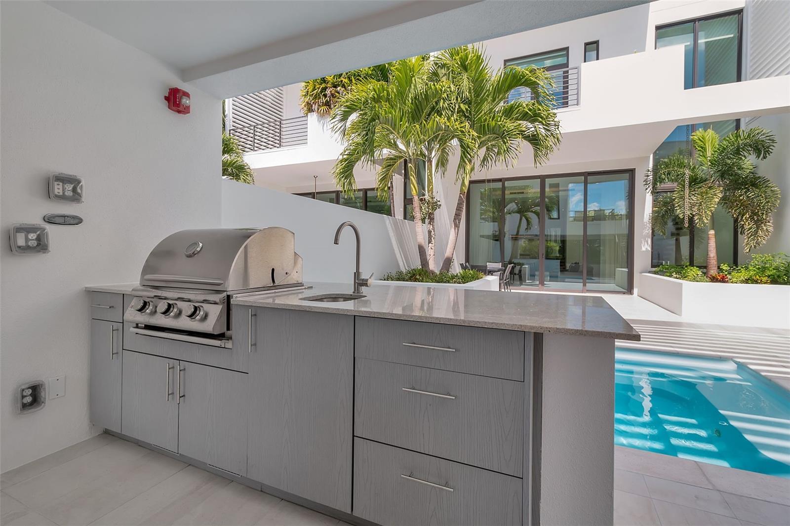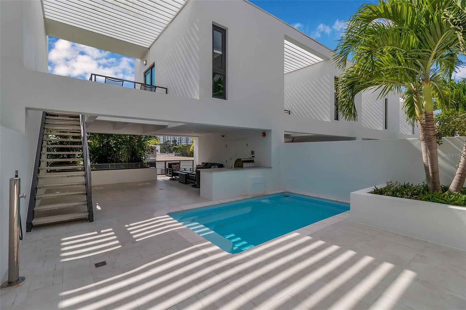 Anchored in Sarasota’s vibrant Rosemary District, a hub of art, dining, and design just steps from downtown, this contemporary multi-level residence captures the essence of urban coastal living. Defined by its clean architectural lines, striking white façade, and geometric precision, it offers a rare balance of privacy and proximity in one of Sarasota’s most walkable neighborhoods. A sleek iron-and-glass entry framed by textured tile sets the tone for what’s inside: light, volume, and effortless connection to the outdoors. The floating staircase, with open risers and maple treads, becomes a sculptural centerpiece beneath ceilings that seem to soar forever. A three-stop elevator ensures convenience from the ground-level garage to the uppermost terrace. The main living level unfolds with gallery-like openness, a seamless blend of style and function. The sleek kitchen, featuring quartz countertops, premium stainless-steel appliances, and clean-lined cabinetry, overlooks the dining and great room. The open living space is complete with expansive sliders that open directly to the courtyard and its tranquil Zen pool, where the rhythm of water and greenery softens the modern form. With its summer kitchen, fire table, and covered dining terrace, the home transitions effortlessly from quiet mornings to lively evenings. Upstairs, the primary suite feels like a retreat, complete with a glass-framed balcony, spa-inspired bath, and thoughtful details that invite calm. Two additional guest rooms, one that is currently used as an office, mirror the home’s minimalist aesthetic and abundant natural light. A private guest casita, accessible from the courtyard, expands the home’s flexibility. With a kitchenette, full bath, and its own balcony, it’s ideal for visitors, as another primary suite or as a fitness space, all with the independence of a separate entry. Constructed of concrete and steel with impact-rated glass, every element under scores quality and low-maintenance design, perfect for those seeking the ease of a lock-and-leave lifestyle. Positioned in Sarasota’s coveted Rosemary District, this residence places the best of the city just outside your door. Stroll to downtown dining, art galleries, live music, and cultural venues, or stop by the weekly Sarasota Farmers Market. Boutique shops, theaters, and cafés line the nearby streets, while the beaches, the John Ringling Bridge, St. Armand’s Circle, and Sarasota Bay are only minutes away. With convenient access to Sarasota Bradenton International Airport, this address blends logistics, urban luxury, outdoor living, and strong architectural design, offering a truly unique downtown lifestyle.