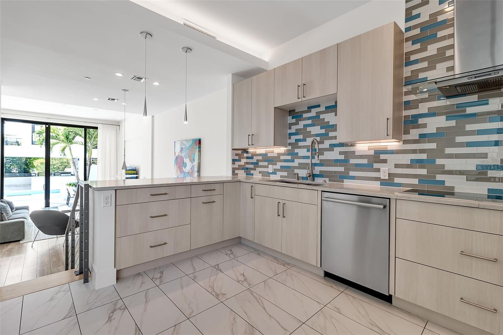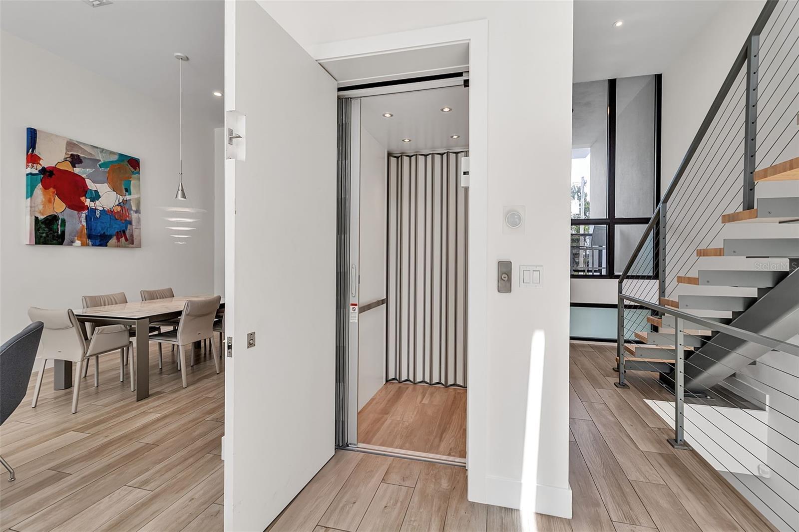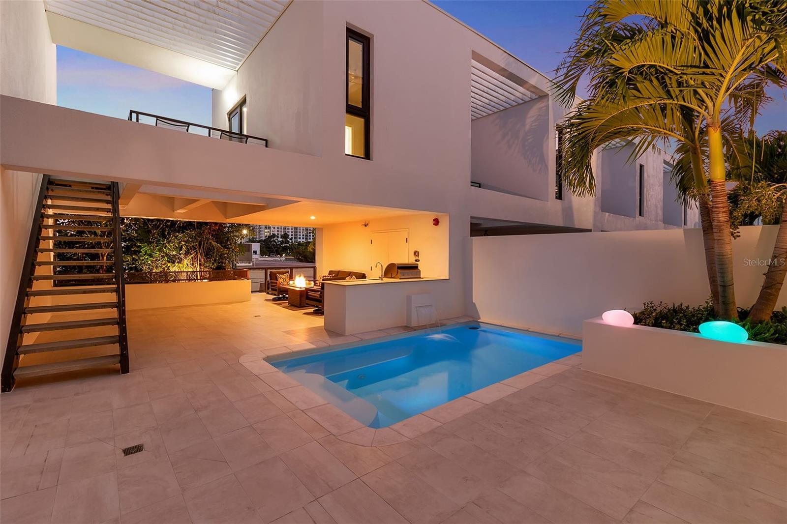 Anchored in Sarasota’s vibrant Rosemary District, a hub of art, dining, and design just steps from downtown, this contemporary multi-level residence captures the essence of urban coastal living. Defined by its clean architectural lines, striking white façade, and geometric precision, it offers a rare balance of privacy and proximity in one of Sarasota’s most walkable neighborhoods. A sleek iron-and-glass entry framed by textured tile sets the tone for what’s inside: light, volume, and effortless connection to the outdoors. The floating staircase, with open risers and maple treads, becomes a sculptural centerpiece beneath ceilings that seem to soar forever. A three-stop elevator ensures convenience from the ground-level garage to the uppermost terrace. The main living level unfolds with gallery-like openness, a seamless blend of style and function. The sleek kitchen, featuring quartz countertops, premium stainless-steel appliances, and clean-lined cabinetry, overlooks the dining and great room. The open living space is complete with expansive sliders that open directly to the courtyard and its tranquil Zen pool, where the rhythm of water and greenery softens the modern form. With its summer kitchen, fire table, and covered dining terrace, the home transitions effortlessly from quiet mornings to lively evenings. Upstairs, the primary suite feels like a retreat, complete with a glass-framed balcony, spa-inspired bath, and thoughtful details that invite calm. Two additional guest rooms, one that is currently used as an office, mirror the home’s minimalist aesthetic and abundant natural light. A private guest casita, accessible from the courtyard, expands the home’s flexibility. With a kitchenette, full bath, and its own balcony, it’s ideal for visitors, as another primary suite or as a fitness space, all with the independence of a separate entry. Constructed of concrete and steel with impact-rated glass, every element under scores quality and low-maintenance design, perfect for those seeking the ease of a lock-and-leave lifestyle. Positioned in Sarasota’s coveted Rosemary District, this residence places the best of the city just outside your door. Stroll to downtown dining, art galleries, live music, and cultural venues, or stop by the weekly Sarasota Farmers Market. Boutique shops, theaters, and cafés line the nearby streets, while the beaches, the John Ringling Bridge, St. Armand’s Circle, and Sarasota Bay are only minutes away. With convenient access to Sarasota Bradenton International Airport, this address blends logistics, urban luxury, outdoor living, and strong architectural design, offering a truly unique downtown lifestyle.