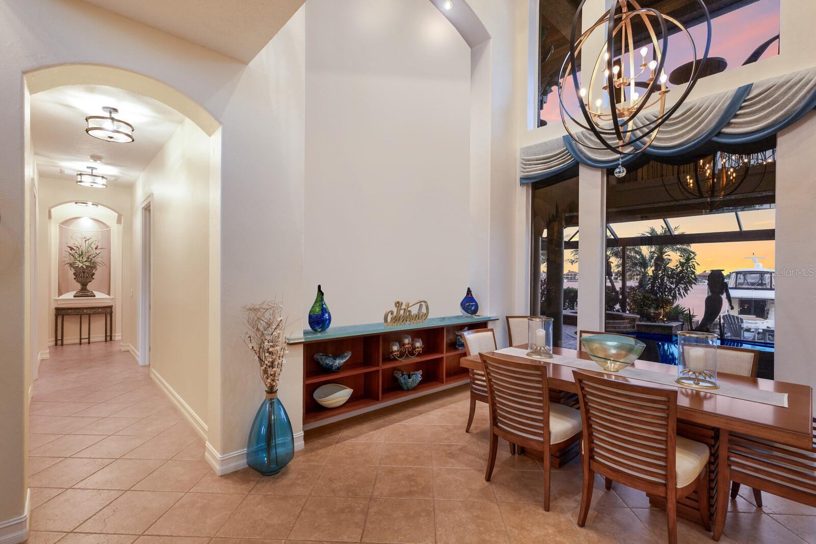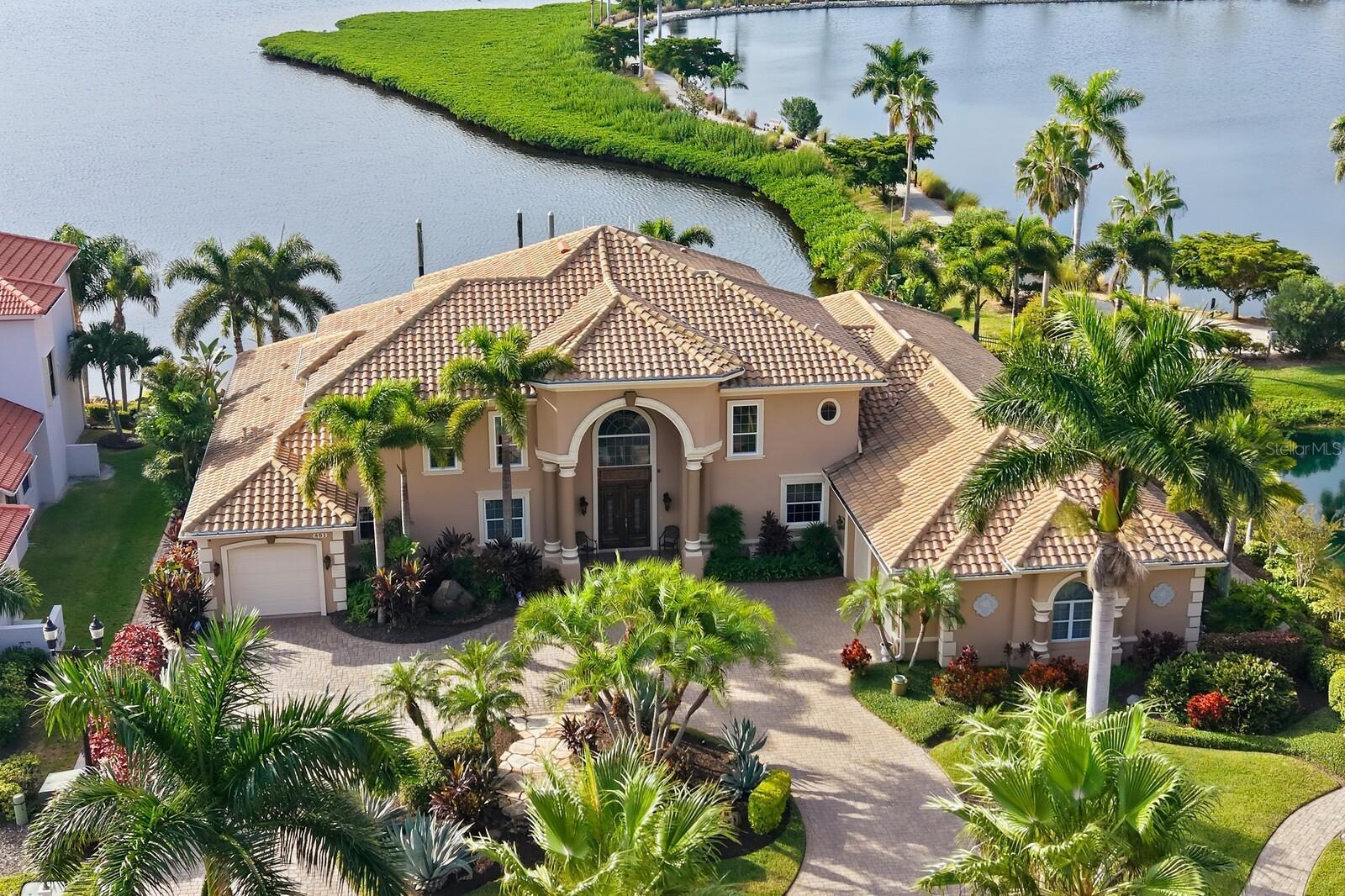 THE CROWN JEWEL OF RIVIERA DUNES- Florida's Gulf Coast's PREMIER yachting community featuring a protected, deep water harbor! This transitional Mediterranean home is truly exceptional and offers over 5,300 square feet of living space, featuring 6 bedrooms plus office, 5.5 baths and 3 car garage and can be purchased turn-key furnished. Every detail of this home reflects fine craftsmanship and artistic vision, with custom finishes, premium materials and absolutely ZERO deferred maintenance. This house has literally been maintained with an open wallet! The main living areas are perfectly laid out for entertaining and socializing. The dining room impresses with a two-story glass wall framing stunning views of the lanai, infinity edge pool, and the harbor. This space is further enhanced by a custom THINKGLASS built-in countertop, and seamless access to a butler’s pantry complete with a wine fridge, wet bar, and pass-through window to the outdoor kitchen. The family room offers a built in whole house entertainment system, 65” LG Smart TV, gas fireplace, and a 4-panel disappearing glass wall that opens directly to the lanai. Tray ceilings, recessed lighting, and surround sound enhance the ambiance. The chef’s kitchen, updated in 2021 by Epoch Solutions, features high-end appliances including a Thermador Wi-Fi-enabled wall oven and microwave, Viking 6-burner gas cooktop, SUB-ZERO built-in refrigerator, Jenn-Air warming drawer, Blanco sink, and Kitchenaid dishwasher. A spacious wraparound island seats six and opens into a glass-walled breakfast area overlooking the water. Wine enthusiasts will appreciate the 56-square-foot climate-controlled wine cellar which houses over 500 bottles and includes a glass display wall & charming old-world tasting area. The primary suite on the main floor offers direct access to the lanai, water views, a tray ceiling with recessed lighting, and oversized his-and-her custom closets. Two additional bedrooms on this level include a guest room with a queen Murphy bed and a dedicated office. Upstairs, a second primary suite offers a private coffee bar, refrigerator, and access to a screened lanai with sweeping water views. Two more upstairs bedrooms share a Jack & Jill bath with individual vanities. Step outside into your private paradise featuring a resort-style infinity-edge pool with spa, outdoor gas fireplace, a custom bronze mermaid fountain with in-pool seating, and an outdoor kitchen with Thermador grill & pass-through. The screened in lanai features a picture window for maximum views & is enhanced with two gas tiki torches and an outdoor shower. For boating enthusiasts, this estate includes a RARE DOUBLE 60-foot slip (one slip open and another has built in lift for a second boat) with a 1,300 sqft floating dock—completely remodeled and expanded in 2021. It is the LARGEST and most updated dock in the community, featuring a 50 AMP power pedestal, two dock boxes, & a folding ladder. Additional features include a 24kW Generac whole-house GENERATOR (2023) with dedicated gas line and transferable 10-year warranty. Conveniently located near 3 Major Airports for ease of international and domestic travel! This home also is near top-tier schools, including IMG ACADEMY, ST STEPHENS AND BRADENTON CHRISTIAN SCHOOL! Only minutes to the Gulf Beaches of Anna Maria Island, short distance to downtown Bradenton & St. Pete, and the cultural & culinary arts of Sarasota. TRULY AN AMAZING LOCATION WITH EASY ACCESS TO SO MANY OPTIONS!
