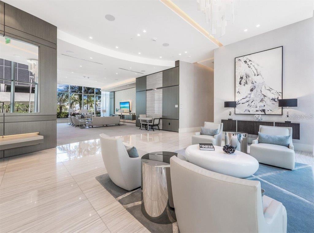 A fabulously appointed designer residence in a coveted, amenity-rich building, VUE 703 offers the pinnacle of luxury living in the heart of Sarasota’s cosmopolitan downtown. Now available turnkey with luxury furnishings and accessories. Renowned for its exceptional resort-style living and elegant contemporary style, VUE is an incredible high-rise building with enviably curated amenities that extend from the valet service and concierge to plush resident lounges and facilities, all within steps of Sarasota’s world-class cultural scene and thriving hub of shops, restaurants, and galleries. This elevated residence with private elevator access is a spacious retreat that blends the sleek modern style of the building with exquisite design elements that lend warmth and enhance the luxurious comfort. Premium upgrades include elegant wide-plank wood floors, designer lighting and décor-both by Creston; high-end built-in audio video system, water filtration by Aqua, while tall 10’ ceilings throughout accentuate absolutely stunning water views. From the front door, unobstructed site lines showcase spectacular southwest vistas across Sarasota Bay and the keys to the Gulf of Mexico beyond. Thoughtfully designed to maximize the views, the home features an airy, open layout with a full wall of floor-to-ceiling sliding impact glass doors that extend the central living space to a deep private terrace with glass railings. Overlooking the dining and central living spaces, the gourmet kitchen with beautiful Italian cabinetry and stainless appliances wraps around a large quartz-clad island with abundant prep and storage space as well as additional seating for guests. The open plan living room and dining area are perfect for entertaining, flowing seamlessly to a private terrace that spans nearly 300 square feet with protective shade and picture-perfect views overlooking the waterfront and marina. The owners’ suite enjoys its own floor-to-ceiling wall of windows for spectacular water and sunset views, with a resort-style bathroom that features extra-long double vanity, enviable storage, glass-enclosed walk-in shower, and separate water closet. Two separate walk-in closets add to the owners’ luxury. Near the home’s entry, a spacious second bedroom offers en suite comfort and ample closet space, and a separate den accommodates a private office or media lounge. The additional half bath is luxuriously outfitted with haute design elements including crystal sconces and a carved onyx sink. A generous, separate utility room with washer and dryer adds to the exceptional in-home conveniences. The residence comes with deeded, secure storage space and two assigned parking spaces that are gated and enclosed. Ideally located across from Sarasota’s celebrated waterfront and within steps of Downtown’s cosmopolitan core, VUE is a highly sought after address with a dazzling array of premium amenities including heated pool and spa with a spectacular pool deck that encompasses multiple lounge areas, fire pit, and enormous pergola with gourmet grill station. Additional amenities include fitness center, dedicated pet recreational area, concierge and security. Offered by the original owners, meticulously maintained and upgraded, VUE 703 is a valuable opportunity to enjoy a lifestyle of ultimat comfort and style.