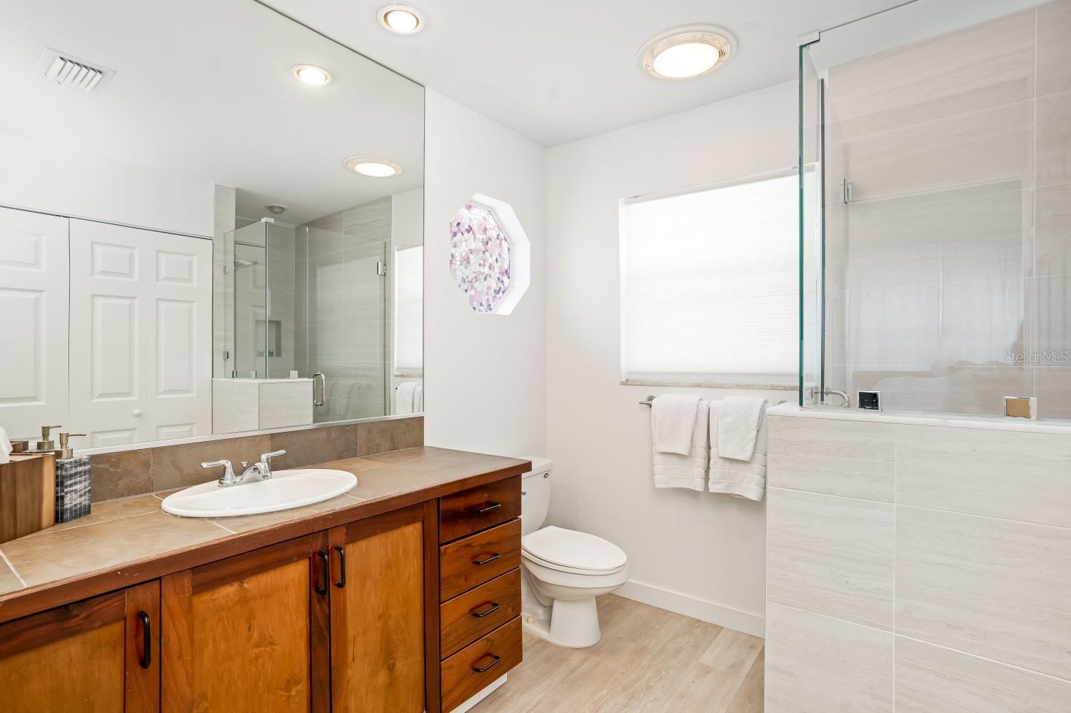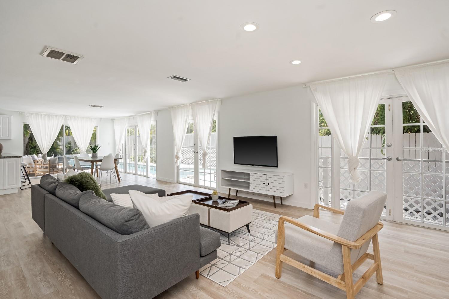 Expansive Coastal Modern Property in a Serene and Peaceful Setting, Seconds to Siesta Key Beach ** 4 Bedrooms, 4 Full Baths with Detached Studio/ADU above the 3 Car Garage (5 Total Bedrooms, 5 Bathrooms) ** Gorgeous Pool among Lush Native Landscape ** NEW ROOF! There is no better value on Siesta Key for your primary occupancy or 2nd home with opportunities to cash flow this investment. The entire property has been updated with wood-looking vinyl, interior/exterior paint, custom baseboard and trim, contemporary lighting fixtures, modern fans and fresh marcite in the refinished pool. The studio provides new vinyl windows and a mini-split AC unit for energy efficient climate controlling of this private space. You will love the floor plan of both the main house and studio! The main house provides a great room concept with an abundance of joyful natural light and multiple sets of French doors leading to the pool. Each bedroom receives a private bath with 2 primary suites enjoying idyllic views of the pool and tropical landscape. Simply stated, this estate property is meant for hosting large groups, comfortably. Located inside the charming Canopy Roads of Twin Oak, this beach property is private, serene and inspiring. Live by the beach, but away from the noise. The good life is found here