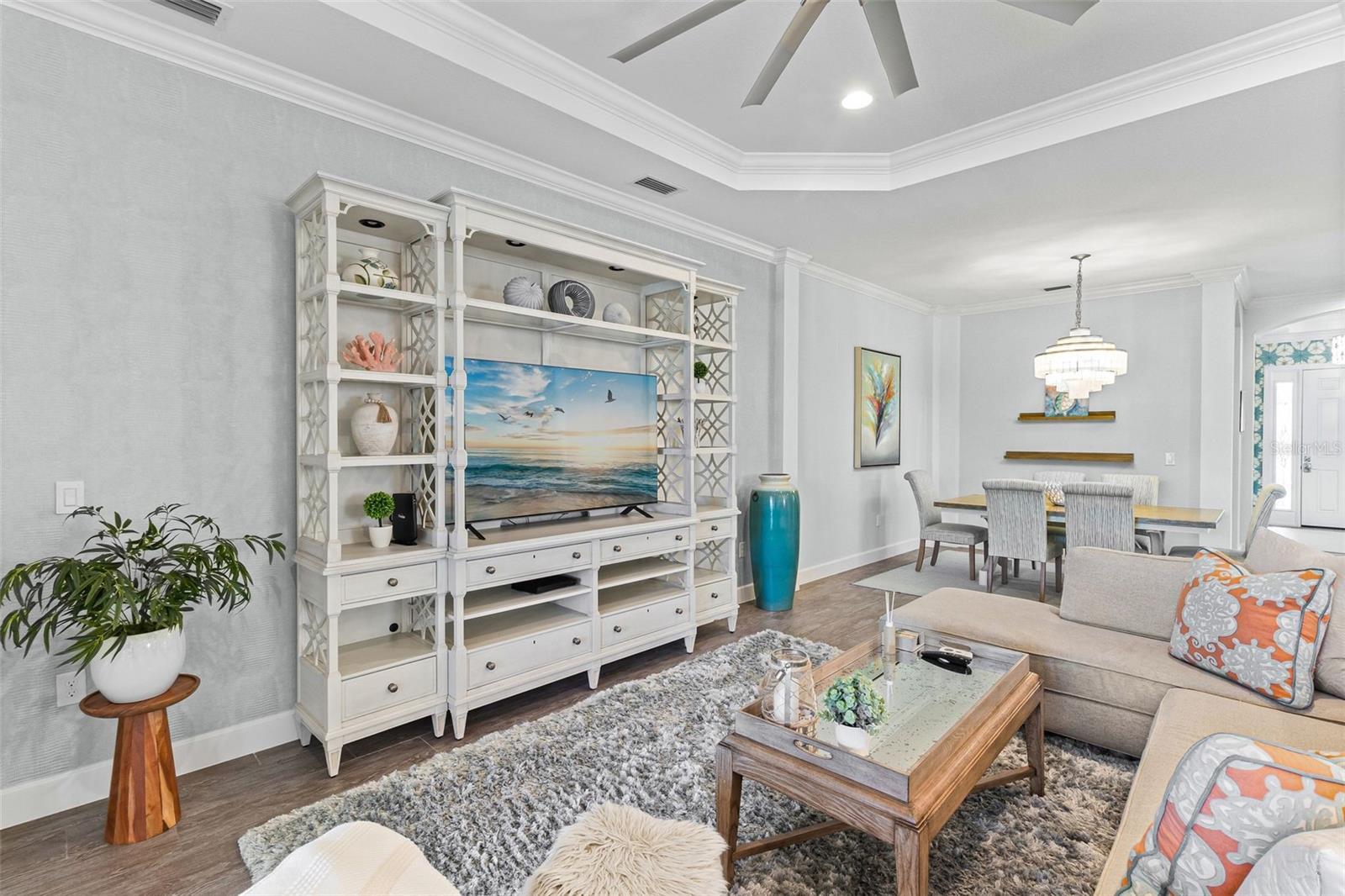 - Ceiling Fans(s), Crown Molding, High Ceilings, Kitchen/Family Room Combo, Living Room/Dining Room Combo, Open Floorplan, Primary Bedroom Main Floor, Solid Wood Cabinets, Stone Counters, Thermostat, Tray Ceiling(s), Walk-In Closet(s), Window Treatments