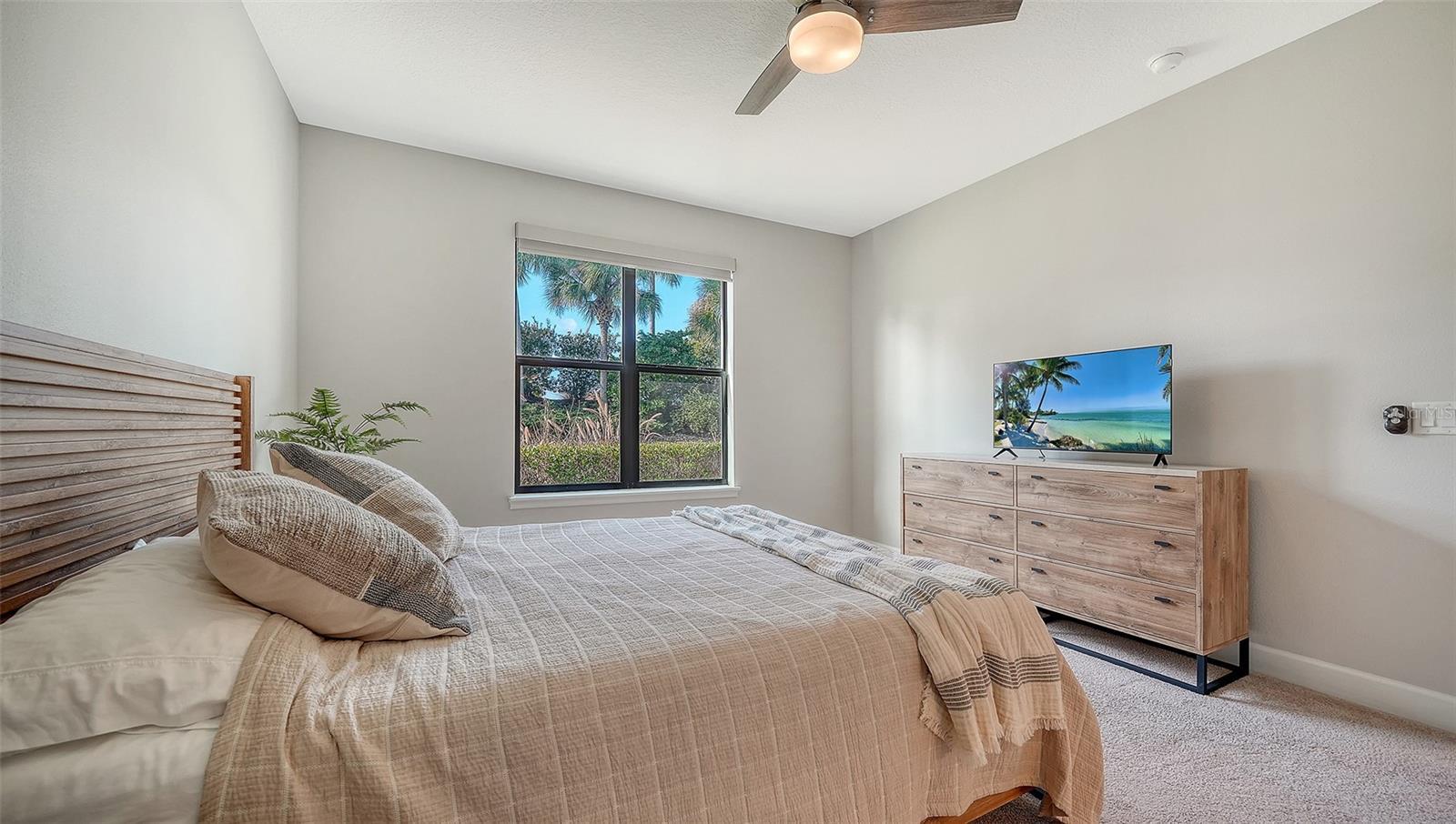 BOOKED FEB/MAR 2026. AVAILABLE APRIL. Welcome to the award-winning community of Esplanade Golf & Country Club at Lakewood Ranch! Esplanade offers resort style living with many amenities. This pristine and nicely furnished, first floor condo is an end unit and has no stairs to climb, 2 beds/2 baths, den with French doors, bright and open floor plan with tile throughout living areas, carpet in both bedrooms, primary bedroom has queen size bed, tv, en-suite bathroom with separate walk-in shower and dual sinks, and guest room has a queen bed. Separate Laundry room, fully equipped kitchen with granite counter tops, cream wood cabinets, stainless steel appliances and eating area in the kitchen. **PLEASE NOTE: THIS IS A NON-GOLF MEMBERSHIP. ACCESS TO AMENITIES ONLY. Application fee is $250/person + $100 processing fee. Esplanade offers many organized activities and amenities that include a large lagoon pool & spa, resistance pool, lap pool 18-hole championship golf course, practice range, pro shops, 6 lighted HarTru tennis courts, 8 lighted pickleball courts, playground, dog park, Koquina Sand Spa, two fitness centers offering group classes or personal training. Restaurants include: Barrel House Bistro, atmosphere that balances elegance and casual dining, or Bahama Bar, a poolside dining experience. Esplanade is also located within easy access to Lakewood Ranch’s Main Street, and Waterside community areas, numerous beaches, shopping at UTC Mall, hospitals, restaurants, airports, and much more.