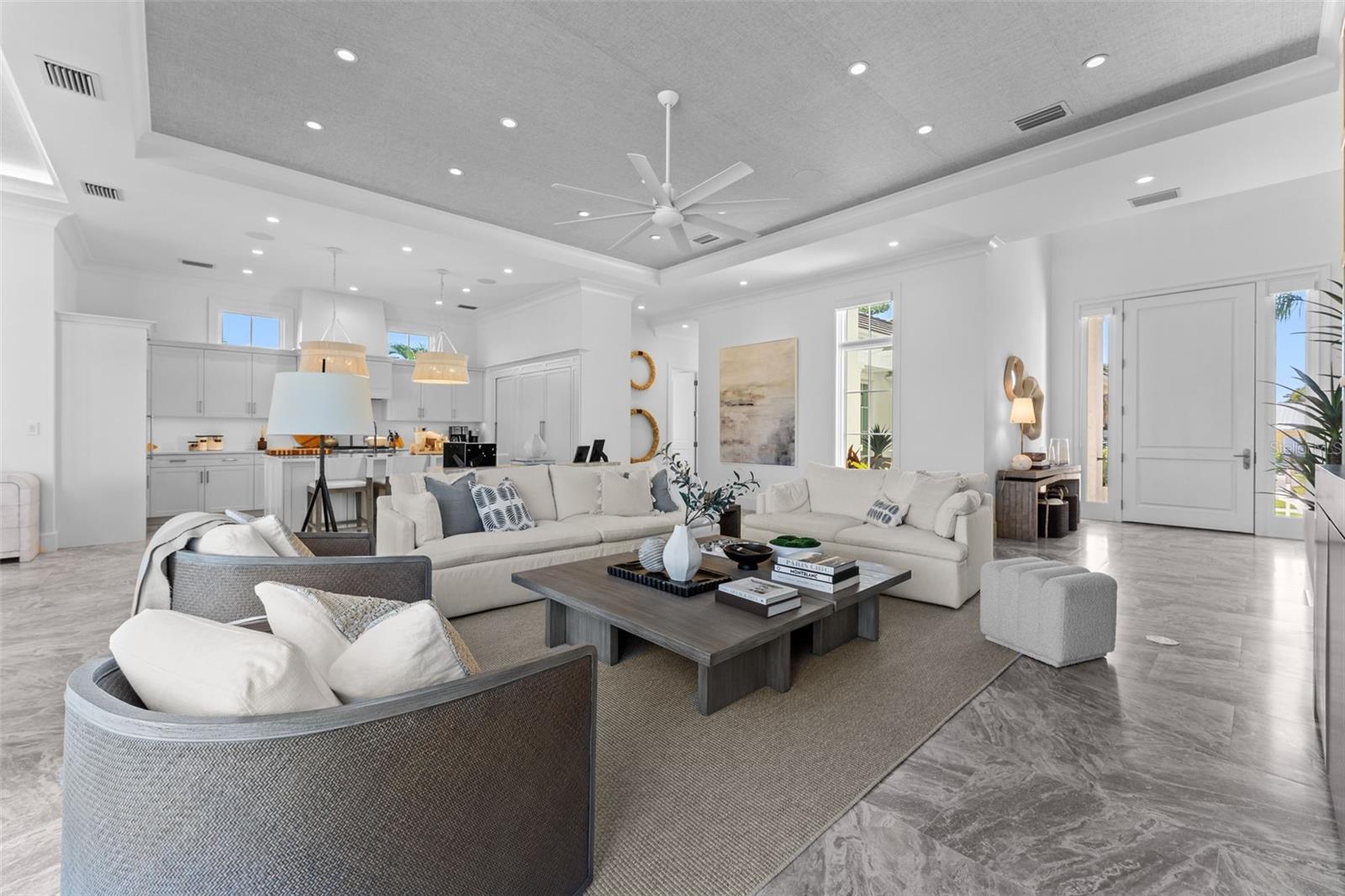 - Built-in Features, Ceiling Fans(s), Central Vaccum, Crown Molding, Eat-in Kitchen, Elevator, High Ceilings, Kitchen/Family Room Combo, Living Room/Dining Room Combo, Open Floorplan, Primary Bedroom Main Floor, Split Bedroom, Stone Counters, Thermostat, Tray Ceiling(s), Vaulted Ceiling(s), Walk-In Closet(s), Window Treatments