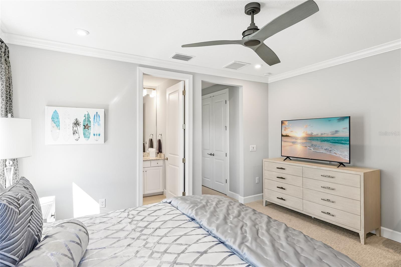 - Built-in Features, Crown Molding, Eat-in Kitchen, High Ceilings, Open Floorplan, Primary Bedroom Main Floor, Split Bedroom, Stone Counters, Thermostat, Tray Ceiling(s), Walk-In Closet(s), Wet Bar