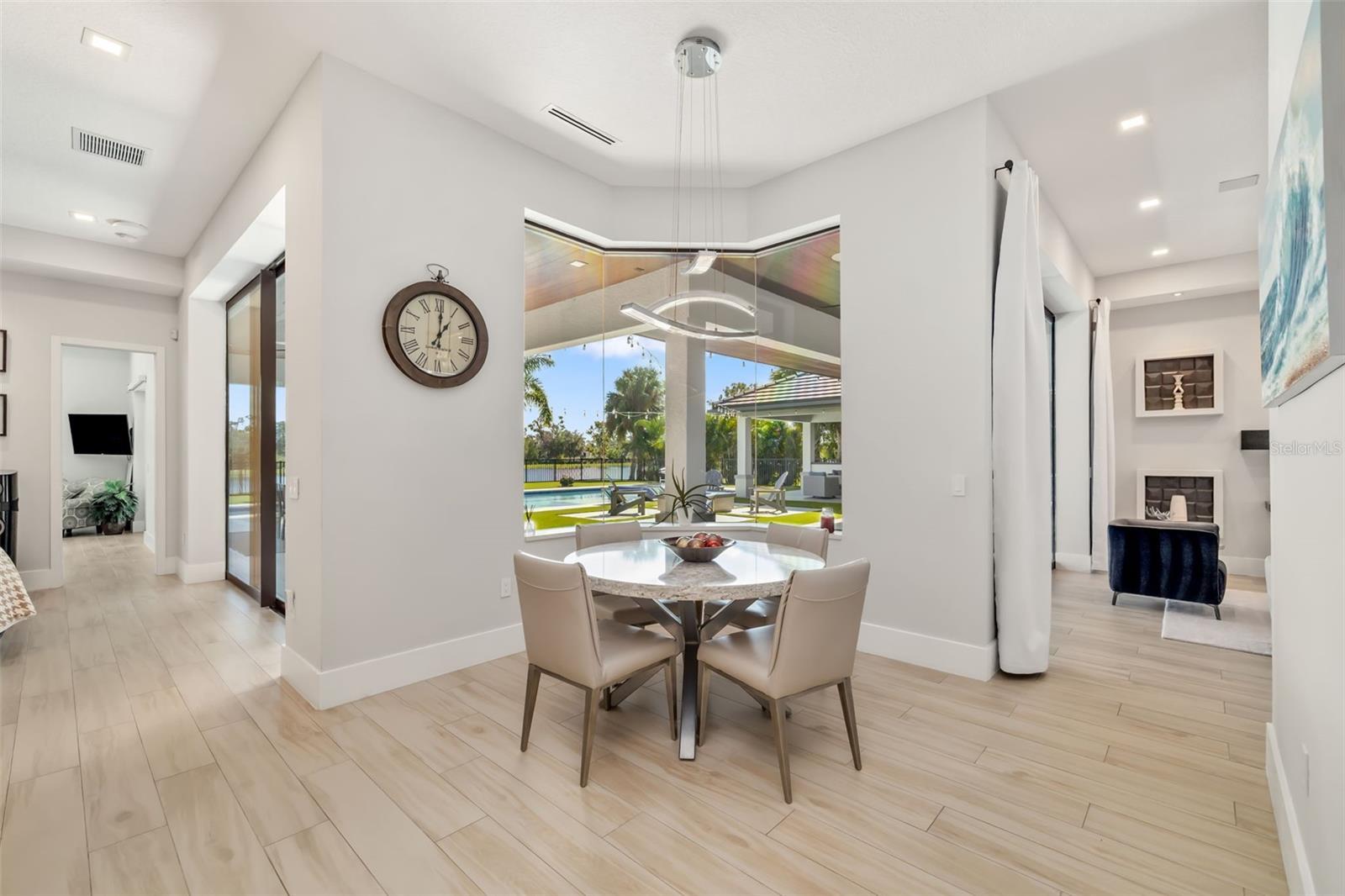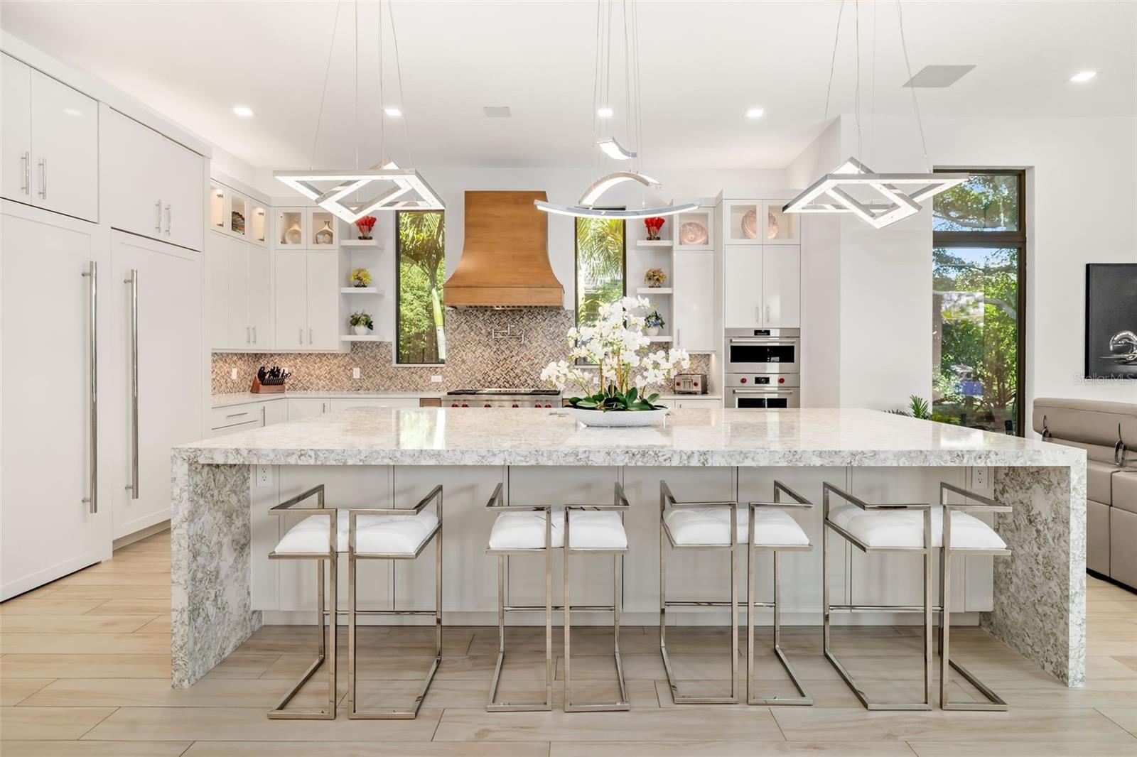 Modern luxury meets resort-style living in this 2022 custom estate in The Founders Club. With 7,149 sq. ft. of air-conditioned living space on an oversized 25,000+ sq. ft. homesite, this 5-bedroom residence delivers rare scale, privacy, and sophistication. A dramatic glass-and-wood floating staircase and feature wine wall set the tone for the sleek interior, where soaring ceilings, designer lighting, and expansive glass showcase peaceful lake and preserve views. The gourmet kitchen features an oversized waterfall island, Wolf appliances, 2 dishwashers, custom cabinetry, and a fully equipped butler’s pantry with Miele coffee station. Flexible living includes two private offices, a home gym, and a dedicated theater. Expansive sliding glass doors disappear to reveal an outdoor living sanctuary with a resort-style pool featuring a lap lane, sun shelf, raised spa, submerged seating, fire-pit lounge, and a covered lanai with fireplace and full summer kitchen. Full smart-home automation controls lights, climate, audio, security, and pool systems, supported by $250K+ in A/V upgrades and impact windows and doors throughout. Additional highlights include a 4-car garage and modern architectural design inside one of Sarasota’s premier private golf communities, offering optional club membership and no CDD fees. Perfectly positioned for elite coastal living, a short drive away from Siesta and Lido Beaches, fine dining and luxury boutiques at St. Armands Circle, waterfront restaurants, golf, marinas, and the cultural venues of downtown Sarasota and let's not forget 10 just minutes away from Waterside, Lakewood Ranch and University Town Center. A rare modern estate offering next-level luxury and lifestyle in The Founders Club.