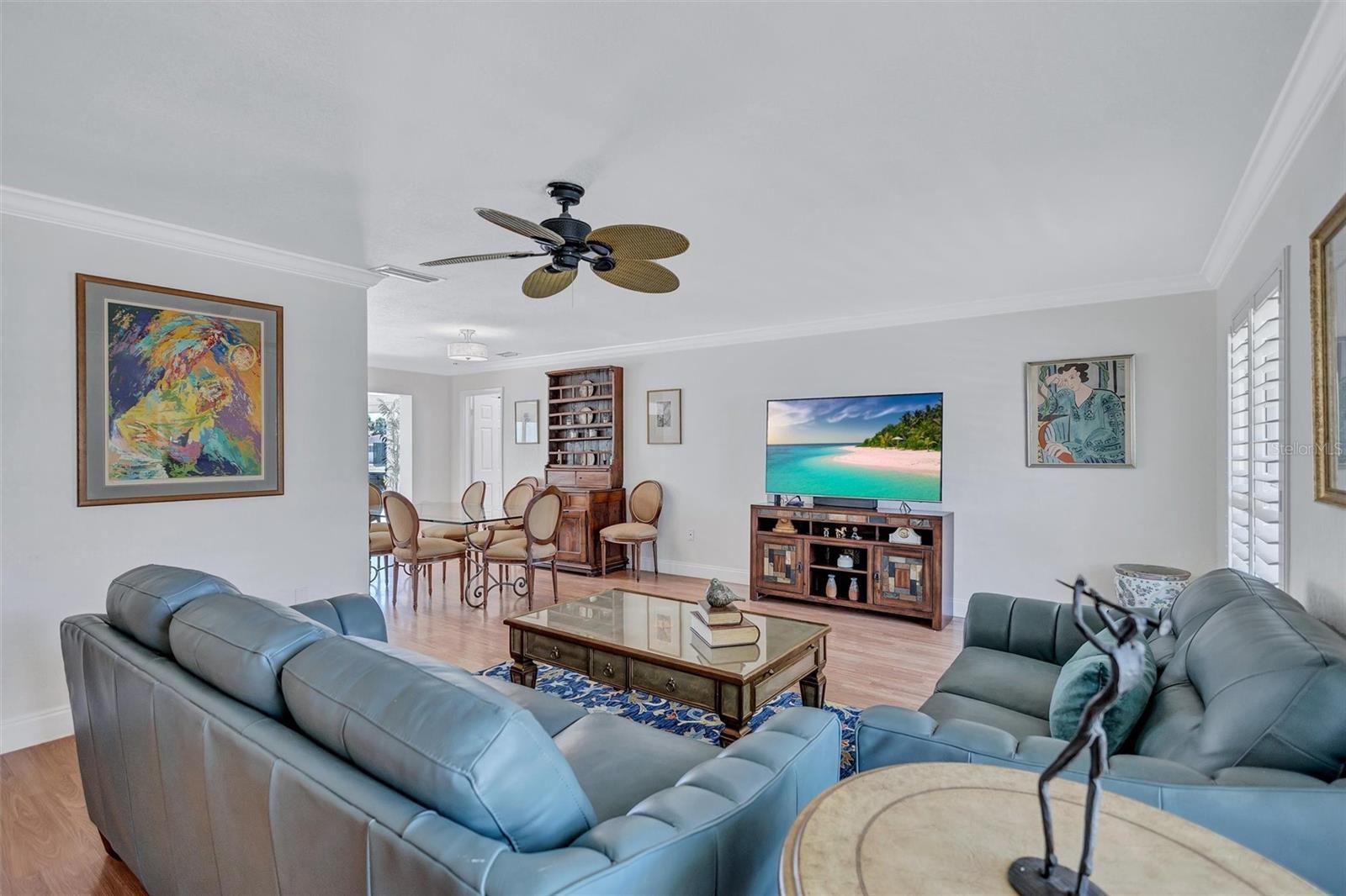- Ceiling Fans(s), Crown Molding, Eat-in Kitchen, L Dining, Living Room/Dining Room Combo, Split Bedroom, Stone Counters, Walk-In Closet(s), Window Treatments