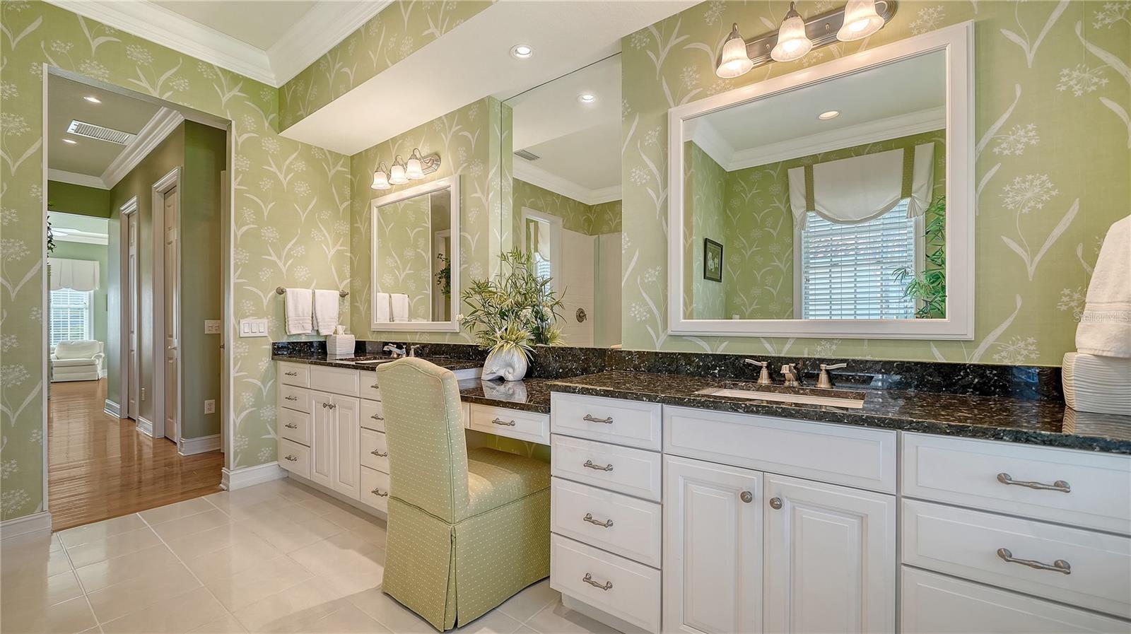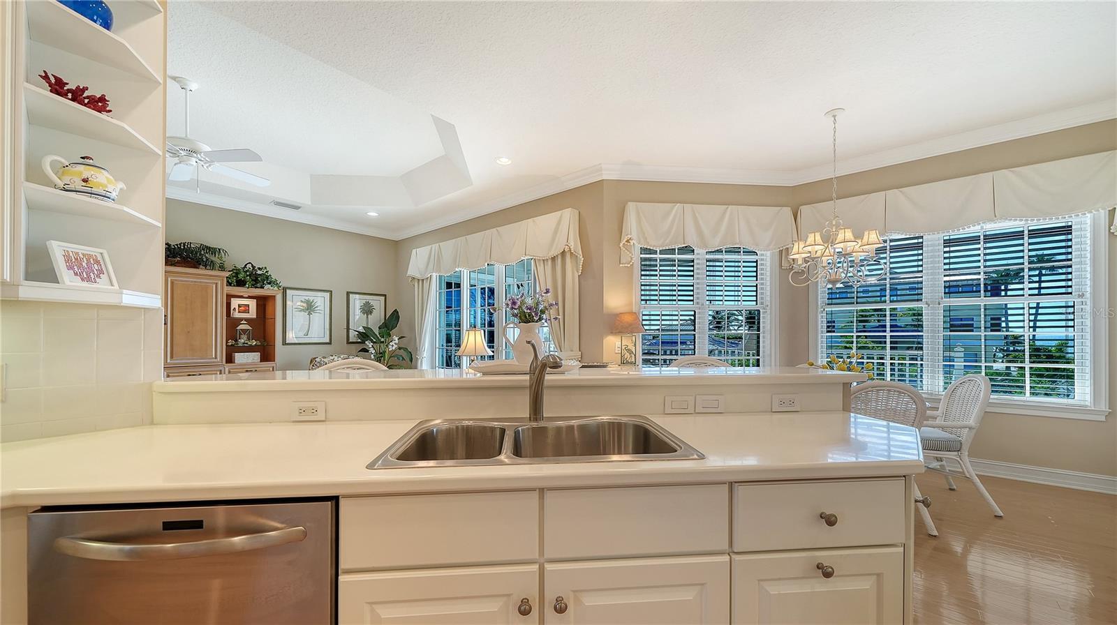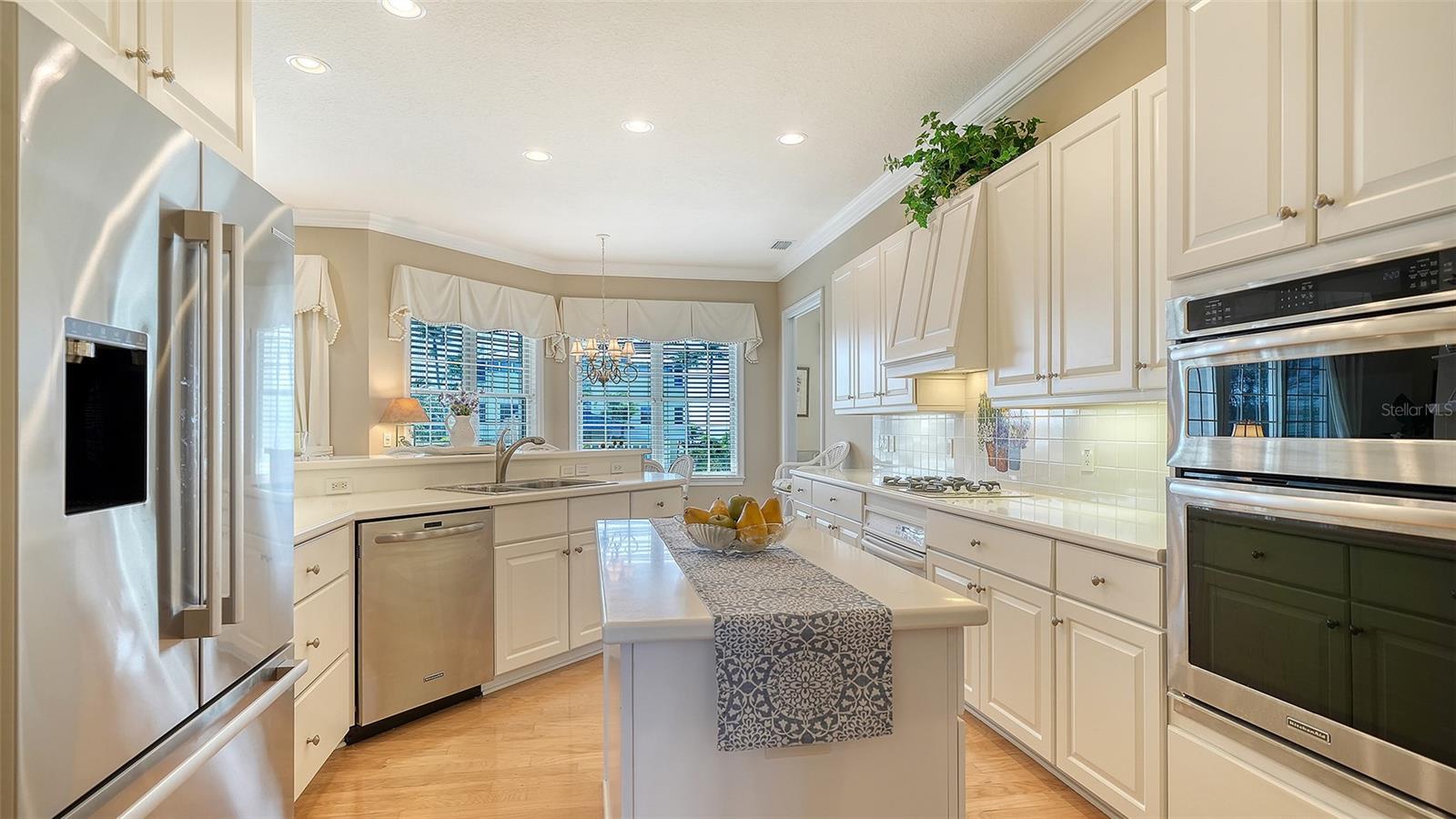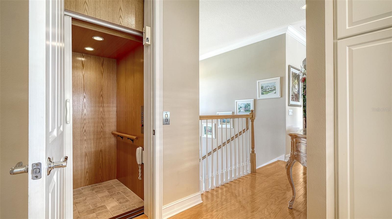 - Ceiling Fans(s), Eat-in Kitchen, Elevator, Kitchen/Family Room Combo, Primary Bedroom Main Floor, Solid Surface Counters, Split Bedroom, Stone Counters, Thermostat, Window Treatments