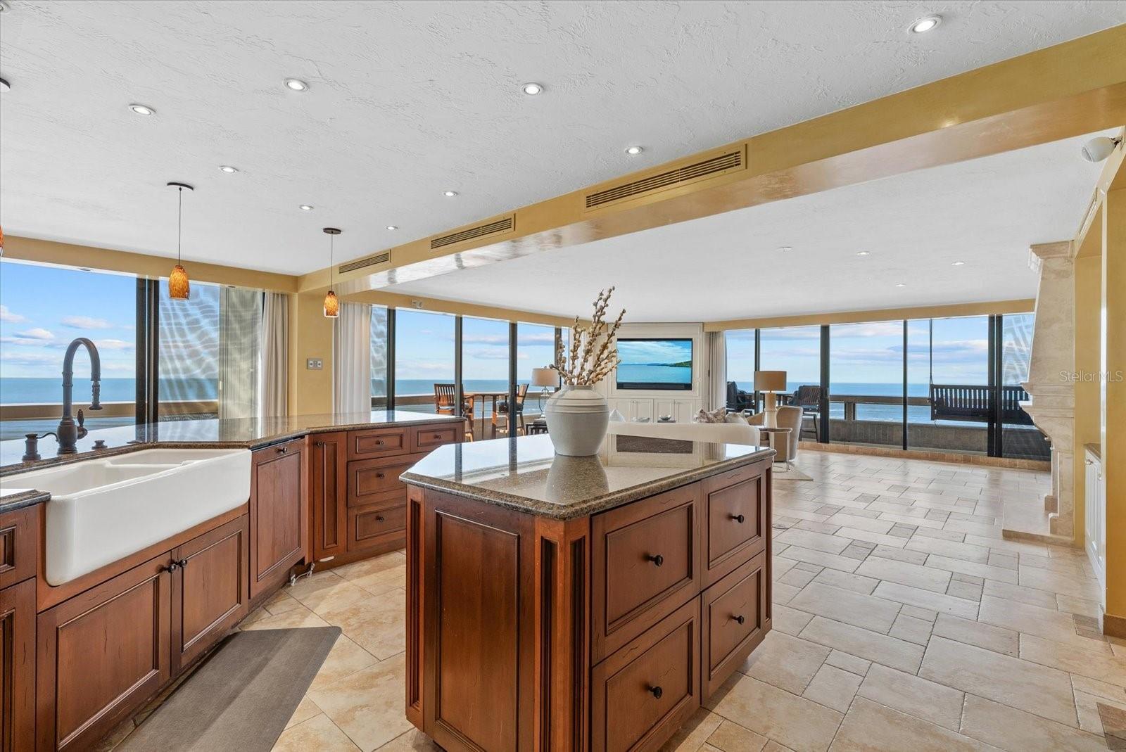 SUNRISE TO SUNSET GULF AND BEACH VIEWS extend from public beach, Siesta Village, the north toward Lido and Longboat Keys! Welcome to a combination of 2 gulf front units into a spacious, open, airy luxury beach residence. As you enter, you are immersed in the breathtaking waters of the Gulf of Mexico in all directions! Stunning interior with an Italian flair! Venetian plaster walls, and imported Italian travertine porcelain tile throughout, as well as custom wooden doors. Kitchen appliances are all high-end: Wolf, Viking, Subzero, Miele. Kitchen island has seating available for eight. The open great room is perfect for entertaining as well as the attached dining area with 100 bottle refrigerated built-in wine cooler. The Terrace is situated on the widest part of the beach, while being walkable to Siesta Village with its colorful boutiques and diverse eateries. All of this with 2 under-building assigned parking spaces and an interior storage unit. There is also a common bike storage room and a fantastic elevated salt water pool overlooking the beach. This is a rarely available offering on Siesta Key Beach with the piece of mind of a newer accordion hurricane shutters.