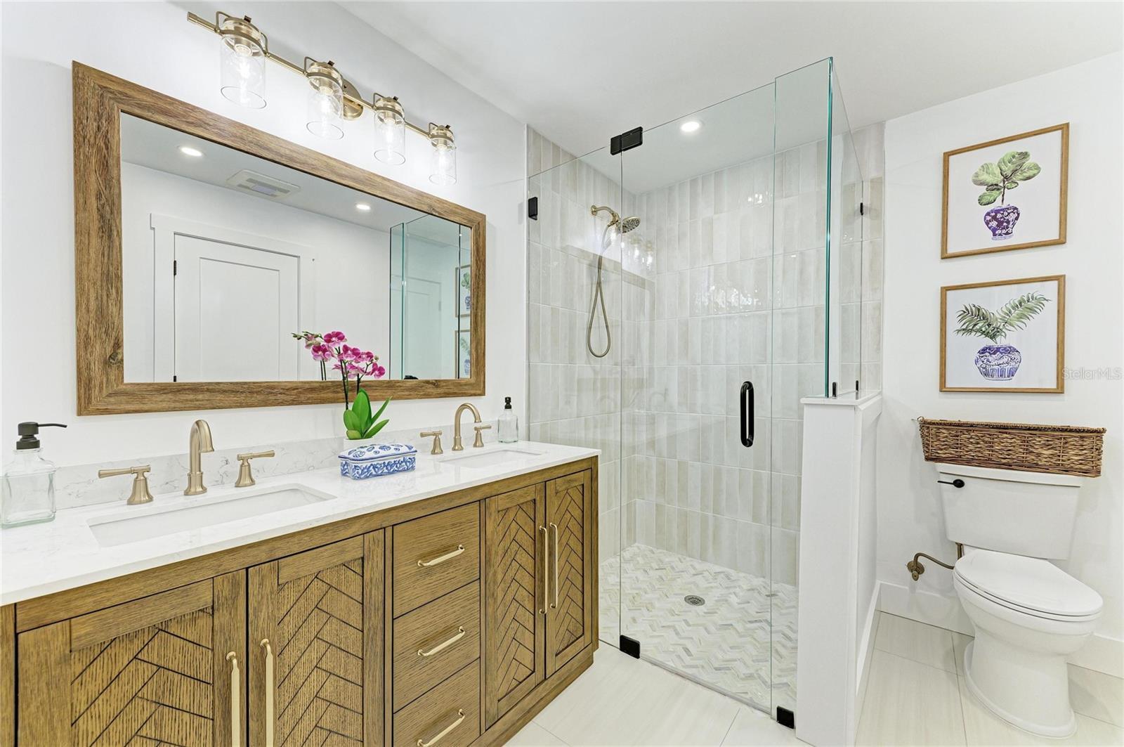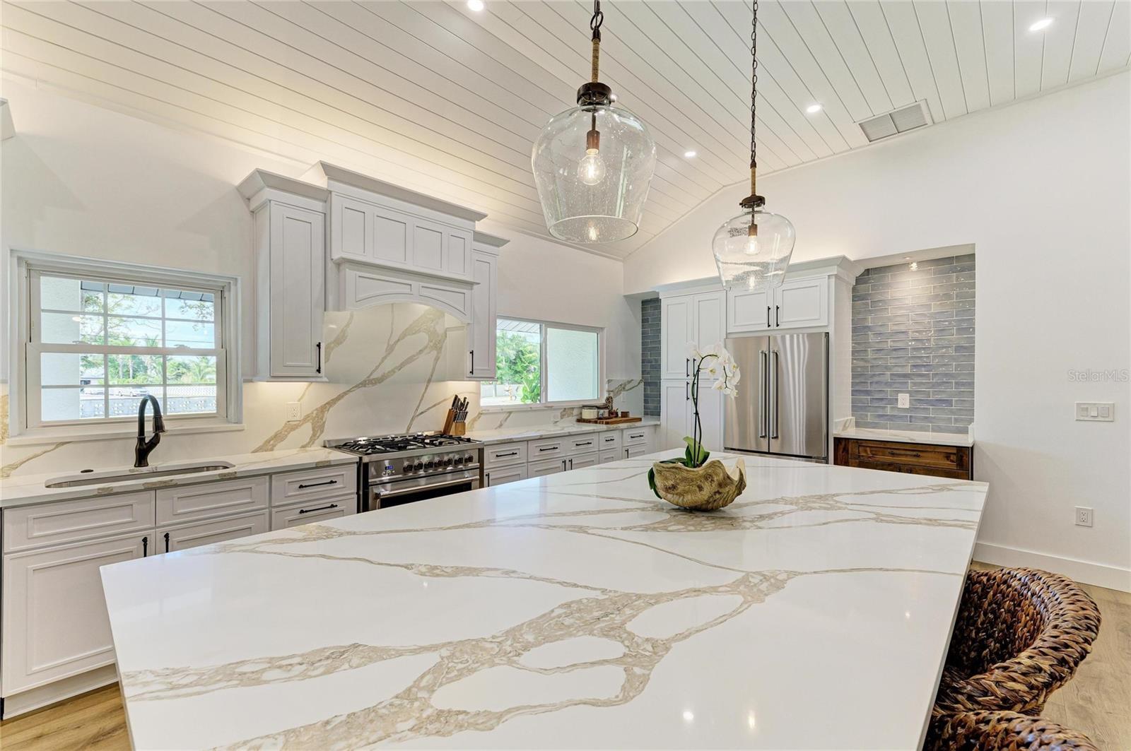 WELCOME TO YOUR DREAM HOME! Step into this beautifully remodeled residence that effortlessly blends modern comforts with timeless charm. As you enter, you are greeted by elevated ceilings adorned with intricate tongue and groove detailing, creating an open and airy atmosphere. The heart of the home is a stunning, completely renovated gourmet kitchen perfect for entertaining. Equipped with solid wood soft-close cabinets, a vast quartz island, and high-quality new appliances. The kitchen also features under and over cabinet lighting, a stylish tile backsplash bar with glass shelves and puck lighting, as well as newly added propane lines and a tank for the gas stove, for all your culinary adventures. Luxury awaits you in the all-new bathrooms, highlighted by exquisite tile floors, modern glass and tile showers, and contemporary plumbing fixtures that enhance your daily routine. The added laundry room, complete with a newer stackable washer and dryer, provides convenience while all new water-resistant, scratch-resistant LVP flooring flows seamlessly throughout the home. For entertainment enthusiasts, experience exceptional audio quality with the newly installed ceiling-mounted Sonos speakers in the living room, perfect for surround sound, while additional exterior speakers on the back porch create a fun outdoor atmosphere. The home is equipped with all new low voltage wiring for Ethernet and coax, ensuring reliable connectivity throughout. Retreat to the spacious master suite, which features a large walk-in closet with built-in wood shelving for all your storage needs. The newly fenced backyard is perfect for gatherings and has ample space for adding an outdoor patio, an addition, a pool, propane fire-pit, with the potential for a second story that could provide breathtaking views of Sarasota Bay. Fresh landscaping and sod, complemented by a recently installed irrigation system in both the front and back yards, enhance the outdoor space. The front yard also showcases vibrant new sod and landscaping, elevating the home's curb appeal. All-new soffits and fascia in a stylish bronze finish complete the exterior look, while a propane and plumbing line has been run for potential outdoor kitchen setups, including a built-in propane grill and/or burners and a sink. Enjoy year-round comfort with a brand-new HVAC unit and ductwork, complemented by a spray foam insulated attic for energy efficiency. The home features new plumbing and electrical wiring, adorned with luxurious fixtures throughout, including ceiling fans, vanity and pendant lights, and adjustable LED recessed lighting. Freshly painted inside and out, along with new baseboards, doors, and hardware, this home is truly move-in ready. Nestled directly across from the beautiful waterfront of Sarasota Bay, this property is just a short walk to stunning views. Conveniently located near Sarasota islands such as St. Armand’s, Longboat Key, Lido Key, and Anna Maria Island, you are only 5 miles from downtown Sarasota. The tranquil neighborhood is at the end of a quiet street and is surrounded by majestic oak trees, perfect for enjoying the beautiful sunsets. Don’t miss the opportunity to make this amazing home yours! Schedule a showing today! One or more photo(s) has been virtually staged.