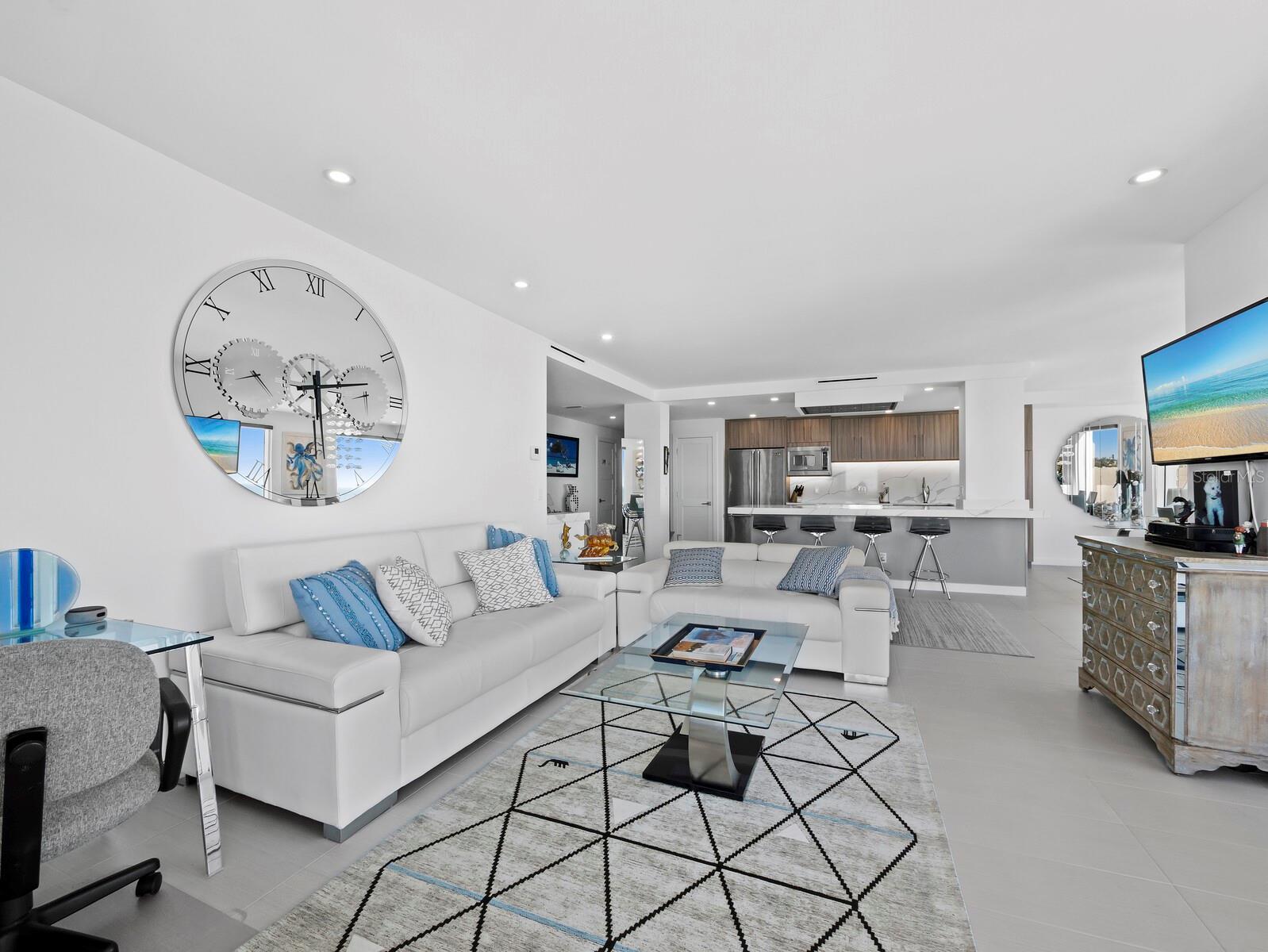 Incredible Sunset AND Sunrise views from this fully updated, highly desirable, 8th floor residence at Islands West. From the moment you enter, the blue-green waters of the Gulf of Mexico take center stage through floor to ceiling storm rated windows and sliders and the full bay view can be seen as well! The light filled open plan was completely remodeled in 2020 and features a fully updated kitchen, gorgeous countertops, and a custom breakfast bar connecting the dining area and living room. A wrap around balcony invites you to step outside and enjoy the sea breeze and allows you to see almost the entire island from beach to bay! The primary suite features large floor to ceiling windows with more stunning views, a walk-in closet featuring built-ins and an updated ensuite bath. The 2nd bedroom has views your guests may never want to leave. Islands West offers resort-style amenities including a beachfront heated pool and spa, tennis court, fitness center, catering kitchen, bike and kayak storage, on-site management, and 24-hour security. Residents will soon also enjoy a gorgeous social room (that is currently being completely remodeled) and outdoor grilling area perfect for sunset dining and entertaining. Conveniently located mid-island, across from Publix and minutes from St. Armands Circle, and a short drive to the cultural epicenter of downtown Sarasota. This beautifully renovated building offers the very best of island living on Longboat Key!
